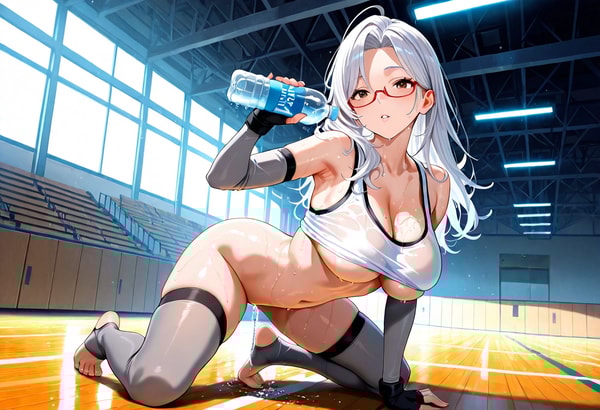 masterpiece, best quality, ultra-detailed, sharp focus, cinematic lighting, dramatic lighting, volumetric light rays, soft light diffusion, depth of field, photorealistic shading, natural interaction, atmospheric perspective, subsurface scattering, (film grain:1.1), (detailed textures:1.1), rich colors, BREAK ayase seiko, dandadan, 1girl, white hair, long hair, ahoge, parted bangs, hair over shoulder, brown eyes, mature female, large breasts, breasts, cleavage, collarbone, bare shoulders, armpits, feet, soles, toes, toenails, parted lips, sweat, very sweaty, wet, wet hair, wet clothes, sweaty clothes, looking at viewer, tank top, white tank top pushed up under breasts, exposed underboob, navel, water dripping from bottle, gloves, fingerless gloves, thighhighs, grey thighhighs, stirrup legwear, toeless legwear, grey sleeves, glasses, semi-rimless eyewear, red-framed eyewear, solo, kneeling, legs spread, back arched, holding water bottle, pouring water on self, gym floor background