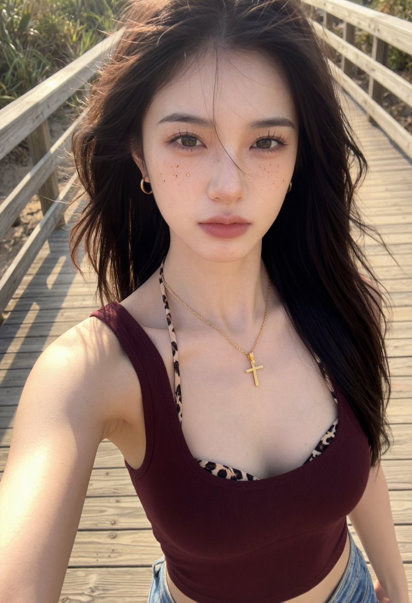 This vertical smartphone selfie captures a young woman with her right arm extended toward the camera at a slightly elevated angle on a sun-drenched wooden beach boardwalk. She has long dark brown wavy hair parted in the center, flowing past her shoulders with a few loose strands blowing across her forehead. Her warm brown eyes look directly into the lens with a relaxed, confident expression, and her face displays a natural scattering of golden-brown freckles across the bridge of her nose and both cheeks. She has full lips with a soft nude-mauve tint, defined dark lashes, and groomed natural brows. She wears small polished gold hoop earrings and a delicate thin gold chain necklace with a small gold cross pendant resting on her upper chest. Cleaveage, She is dressed in a dark burgundy ribbed knit crop tank top with a deep scoop neckline, beneath which the straps and upper edge of a leopard-print bikini top are visible peeking out. The waistband of denim shorts is faintly visible at the lower