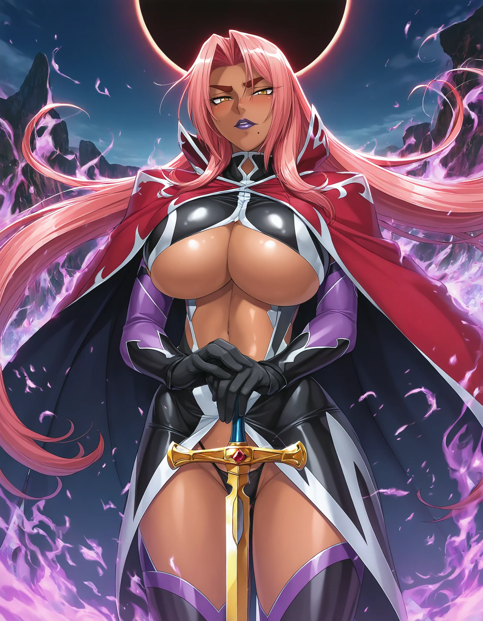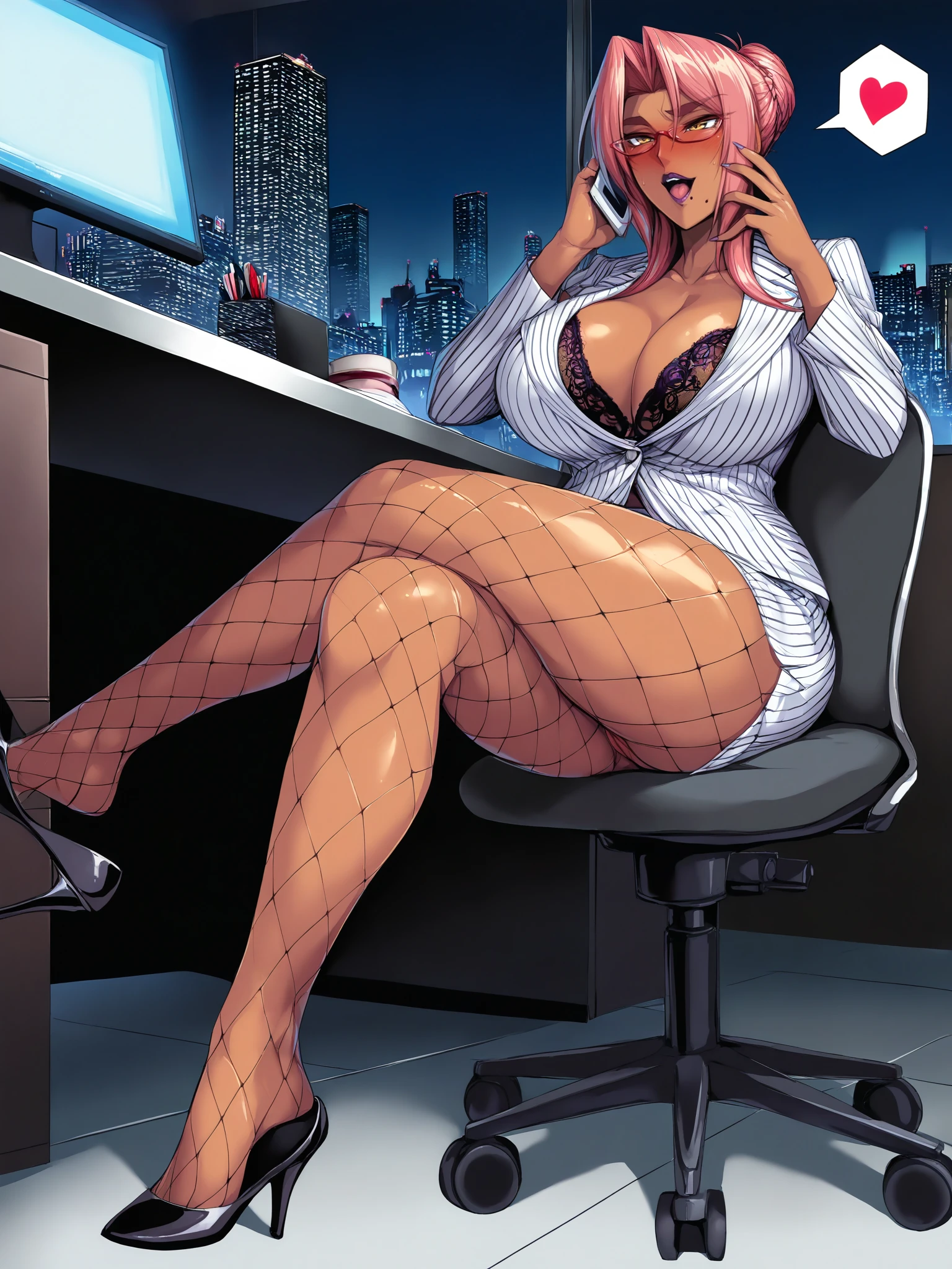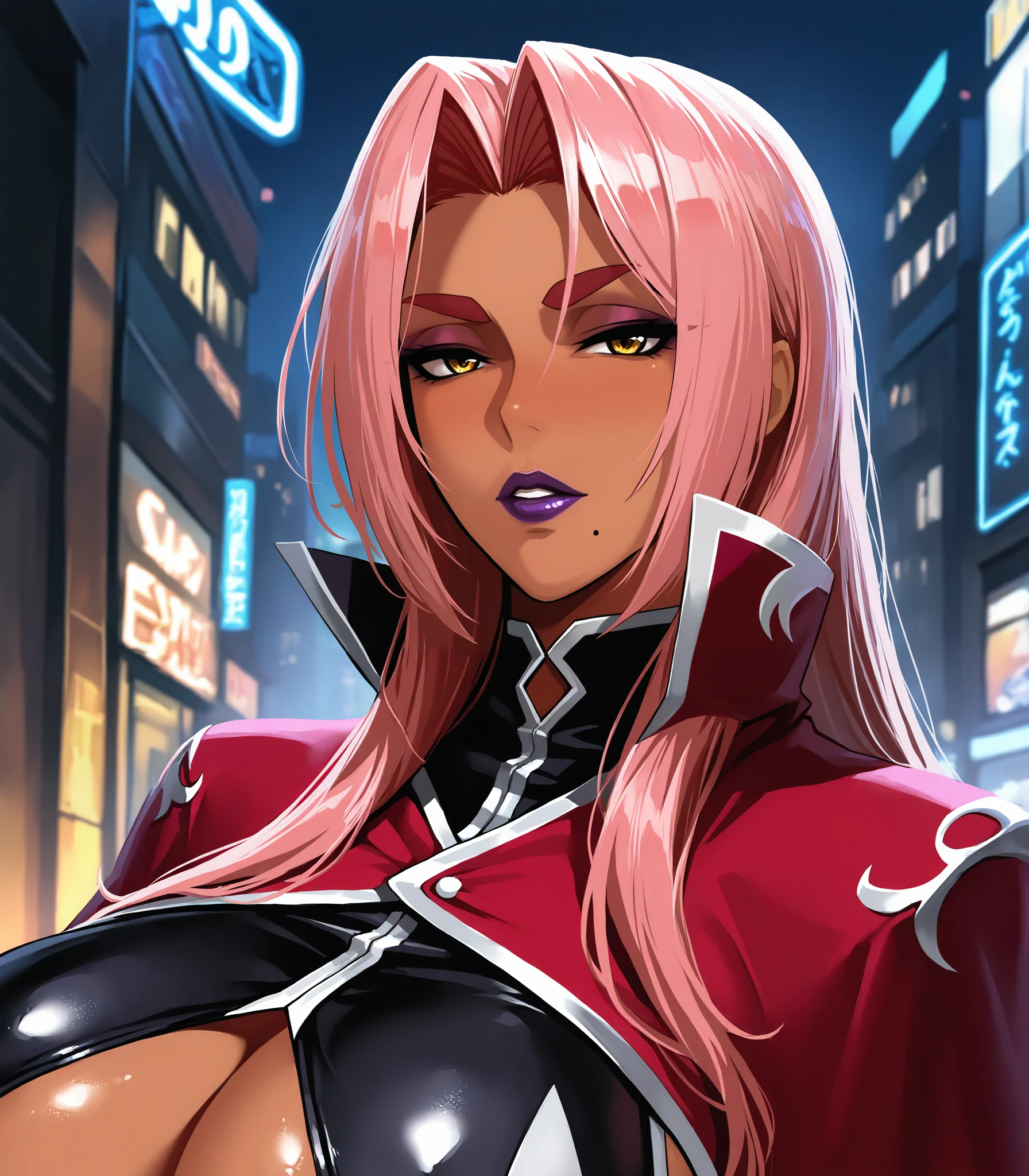 Ingrid, 1girl, mature female, dark skinned female, pink hair, long hair, hair intakes, purple lips, makeup, yellow eyes, mole under mouth,helloutfit, high collar, underboob, elbow gloves, highleg panties, thigh boots, midriff, cape,bare shouldersblack blazer, no bra, pencil skirt, black miniskirt, high heelslace brawedding dress, bridal veil, bridal gauntlets, high heelsbridal lingerieshort hair, single hair bun, glasses, striped jacket, striped skirt, fishnet pantyhose, high heelsCreated
