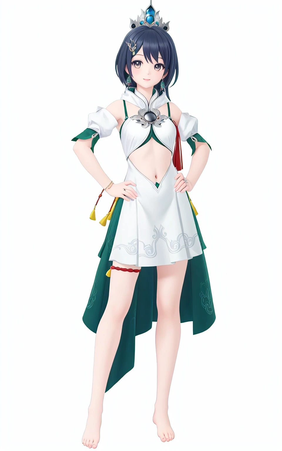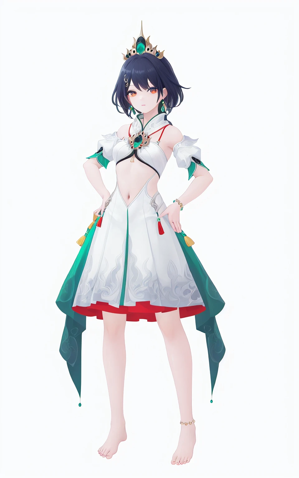 yunli, default clothes, 1girl, solo, barefoot, dress, jewelry, navel, Created