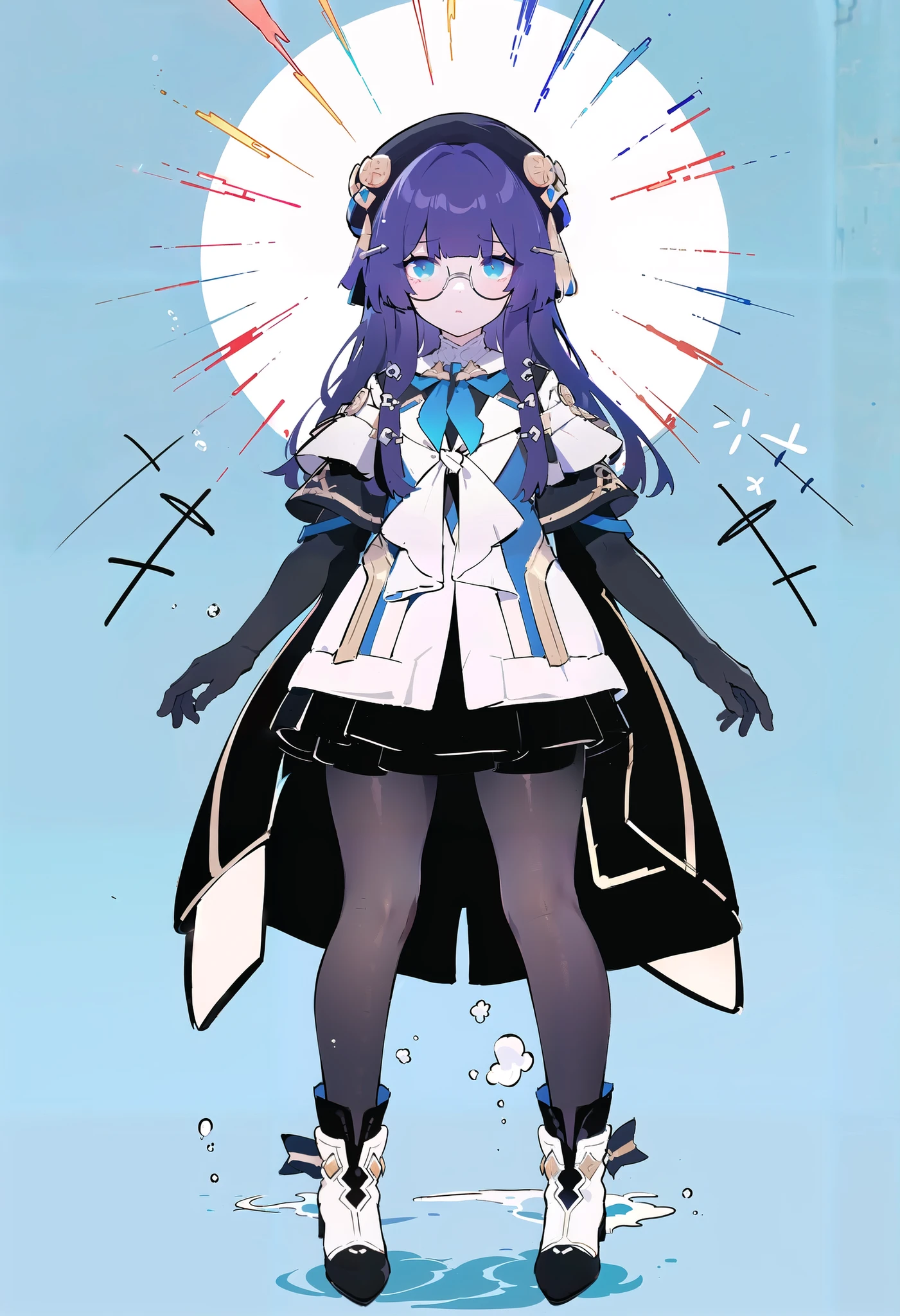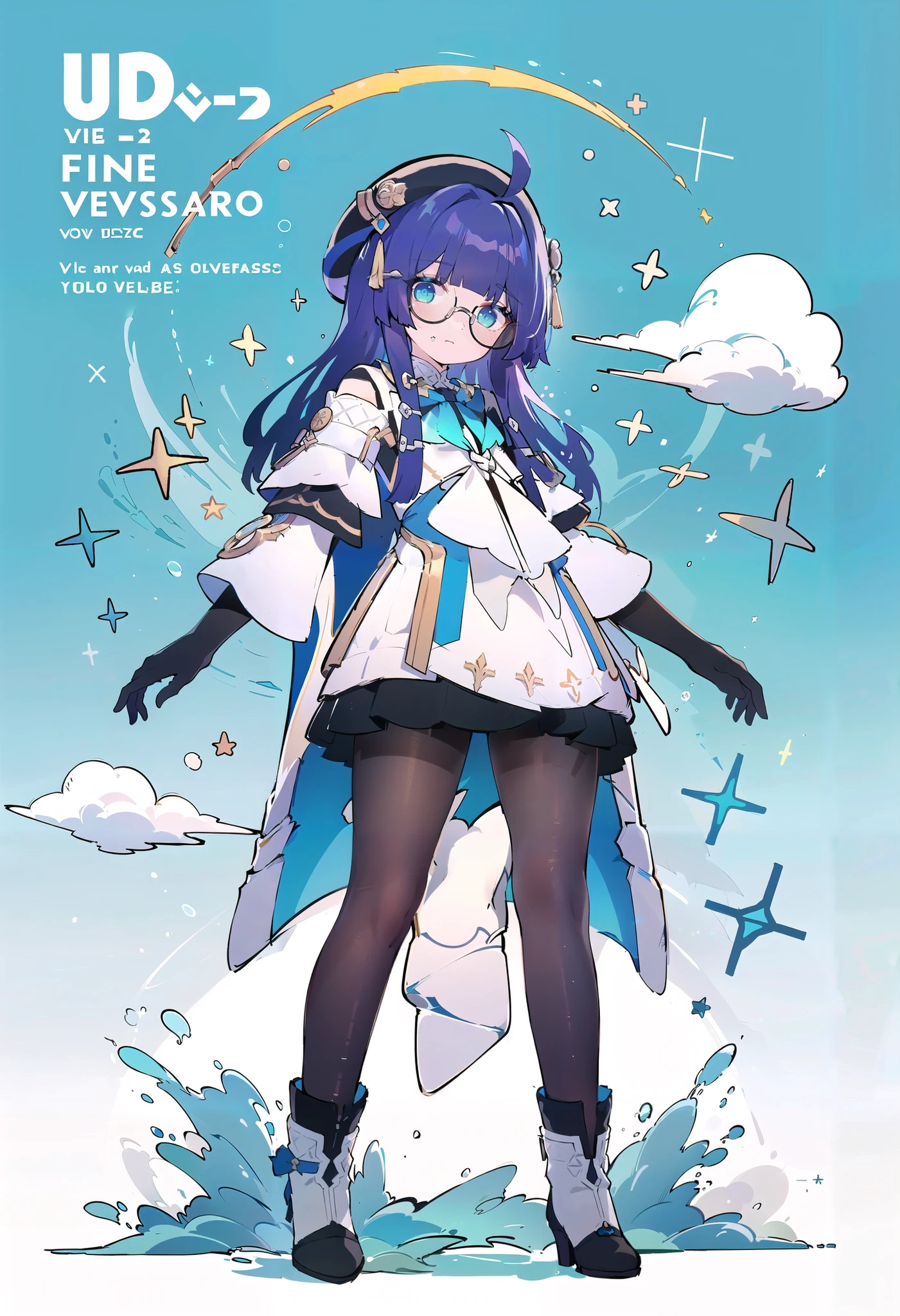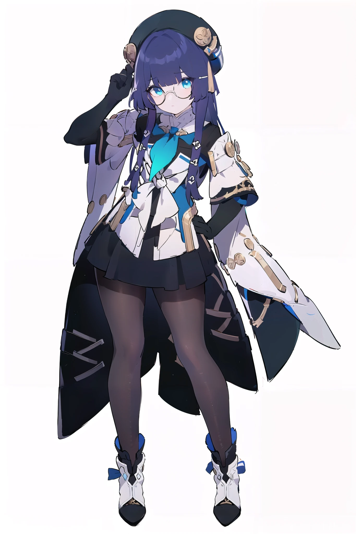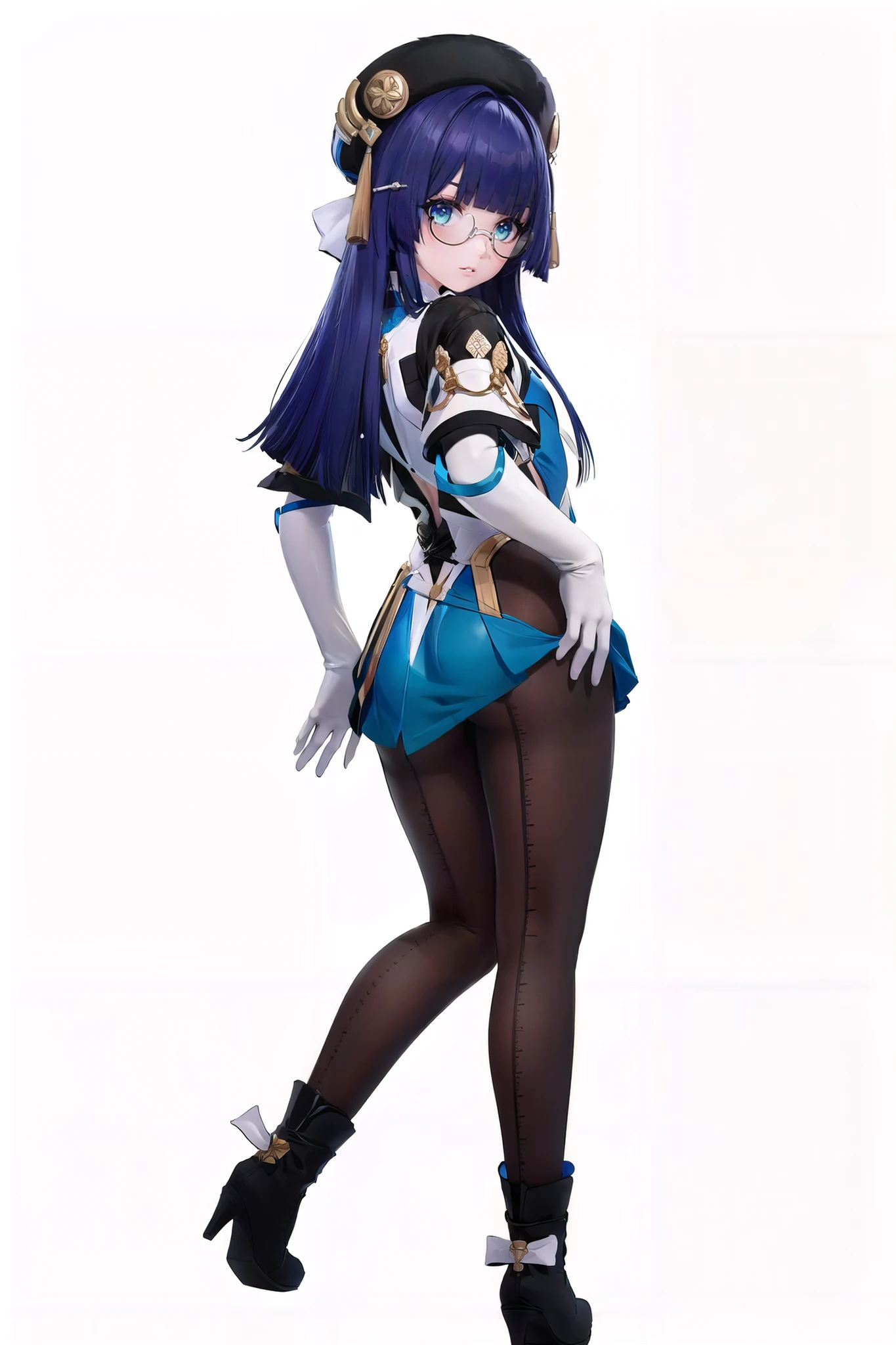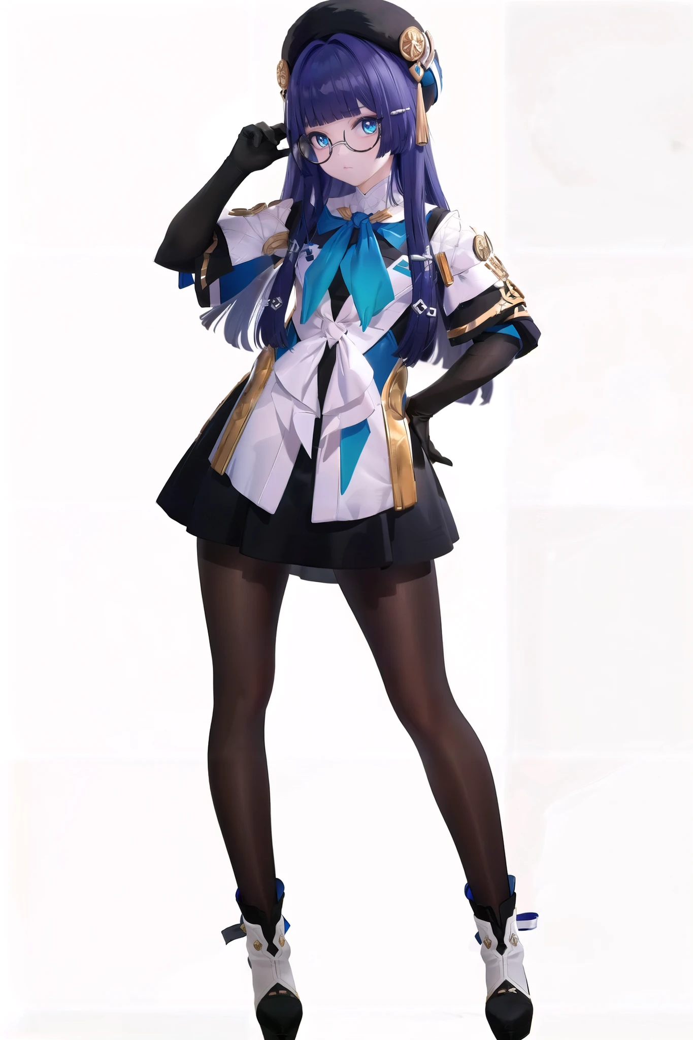pela, 1girl, pantyhose, elbow gloves, glasses, hat, long hair, blue eyes, bangs, high heels, skirt, long sleeves