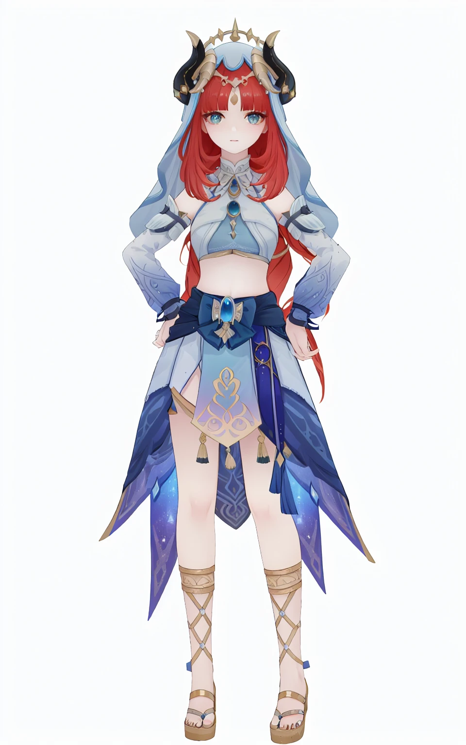 nilou /(genshin impact/), alternate costume, shabang, 1girl, long red hair, bangs, detached sleeves, double bun, thighlet, toeless legwear,nilou /(genshin impact/), def clothes, fengwu, 1girl, horns, gladiator sandals, long red hair, bangs, veil, sandals, skirt, long sleeves, detached sleeves, jewelry, crop topCreated