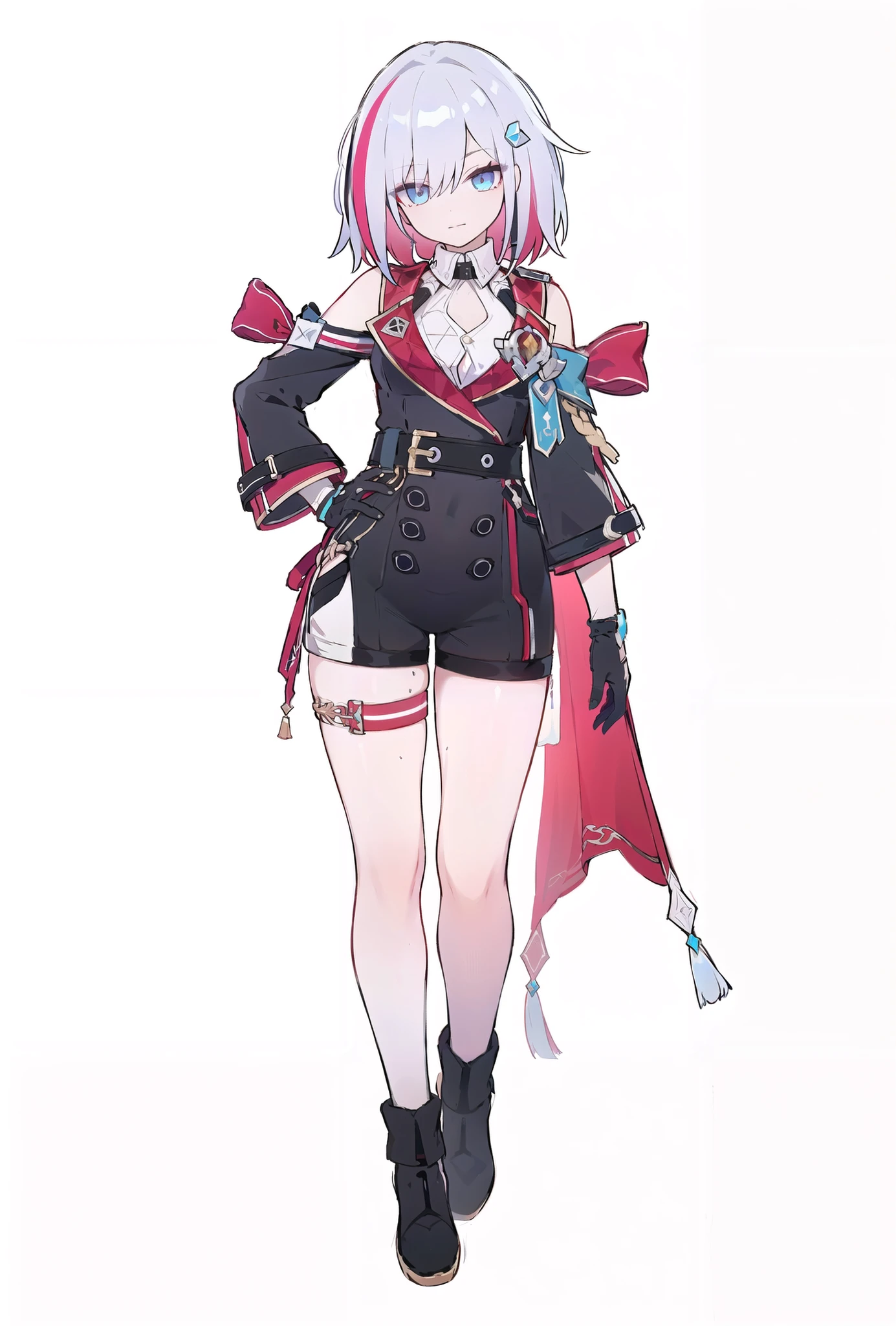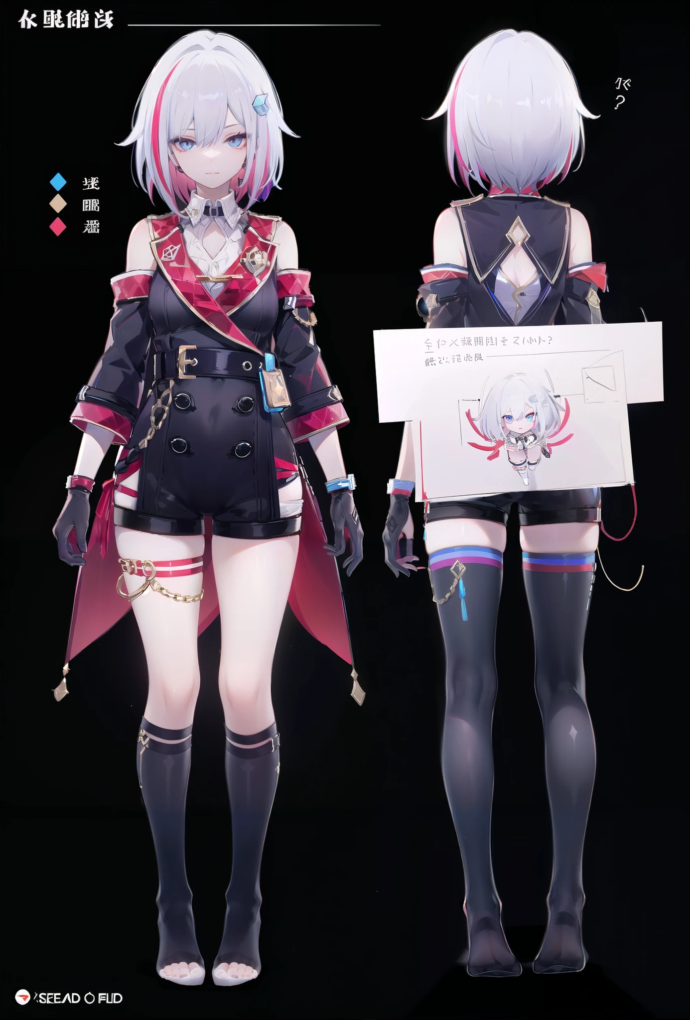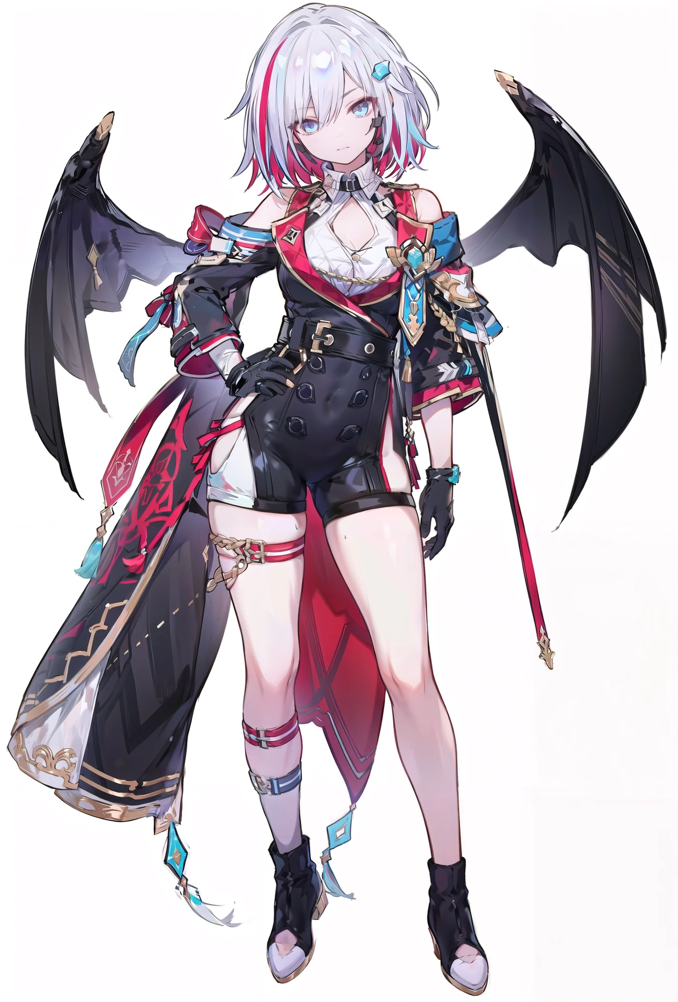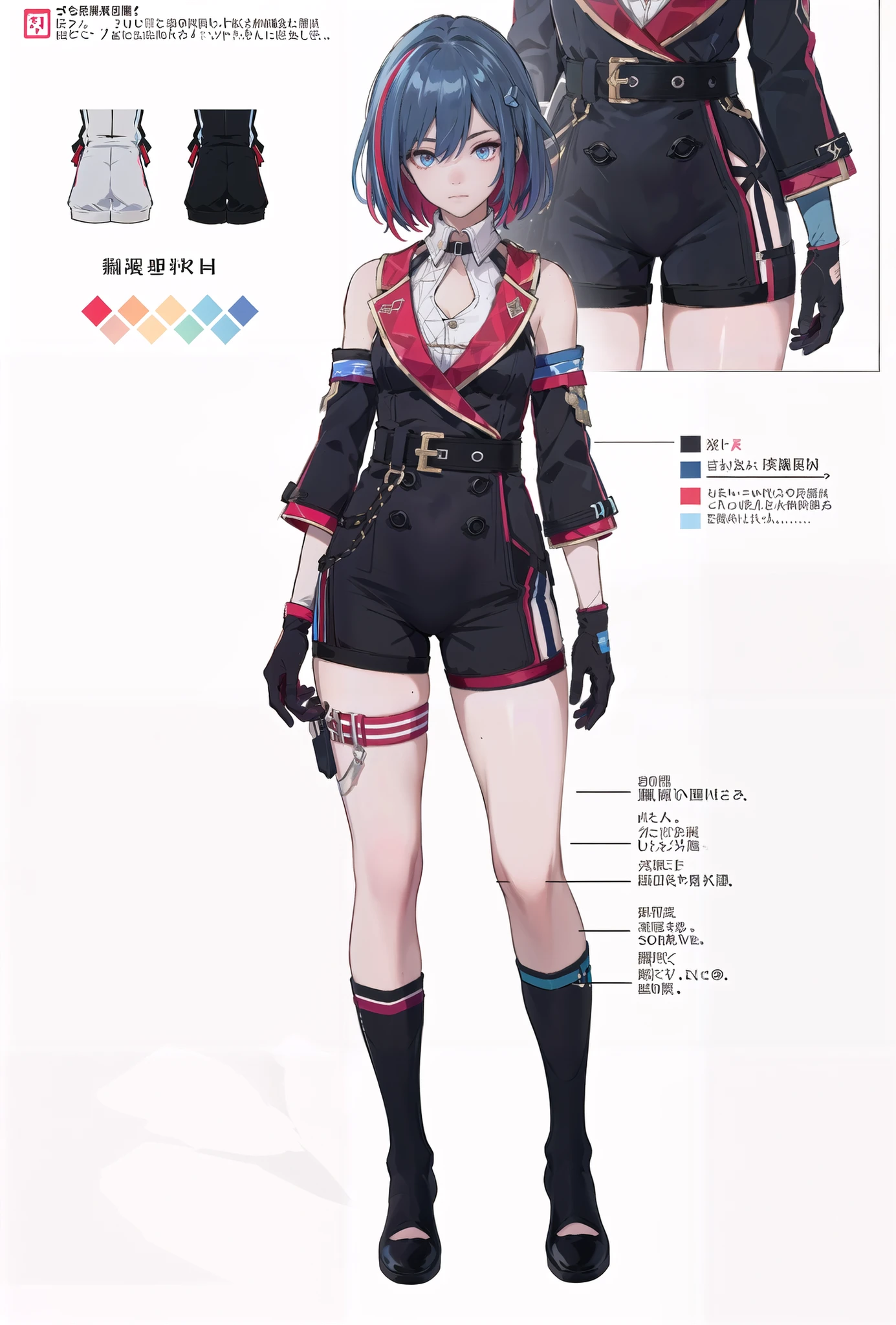tuopa, black gloves, black footwear, multicolored hair, shorts, streaked hair, blue eyes, single thigh strap,silver and red hair