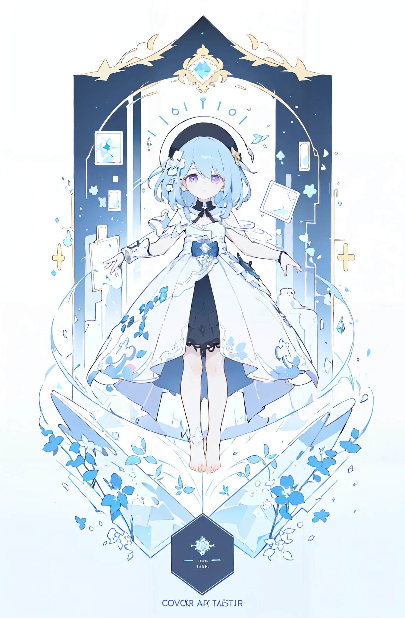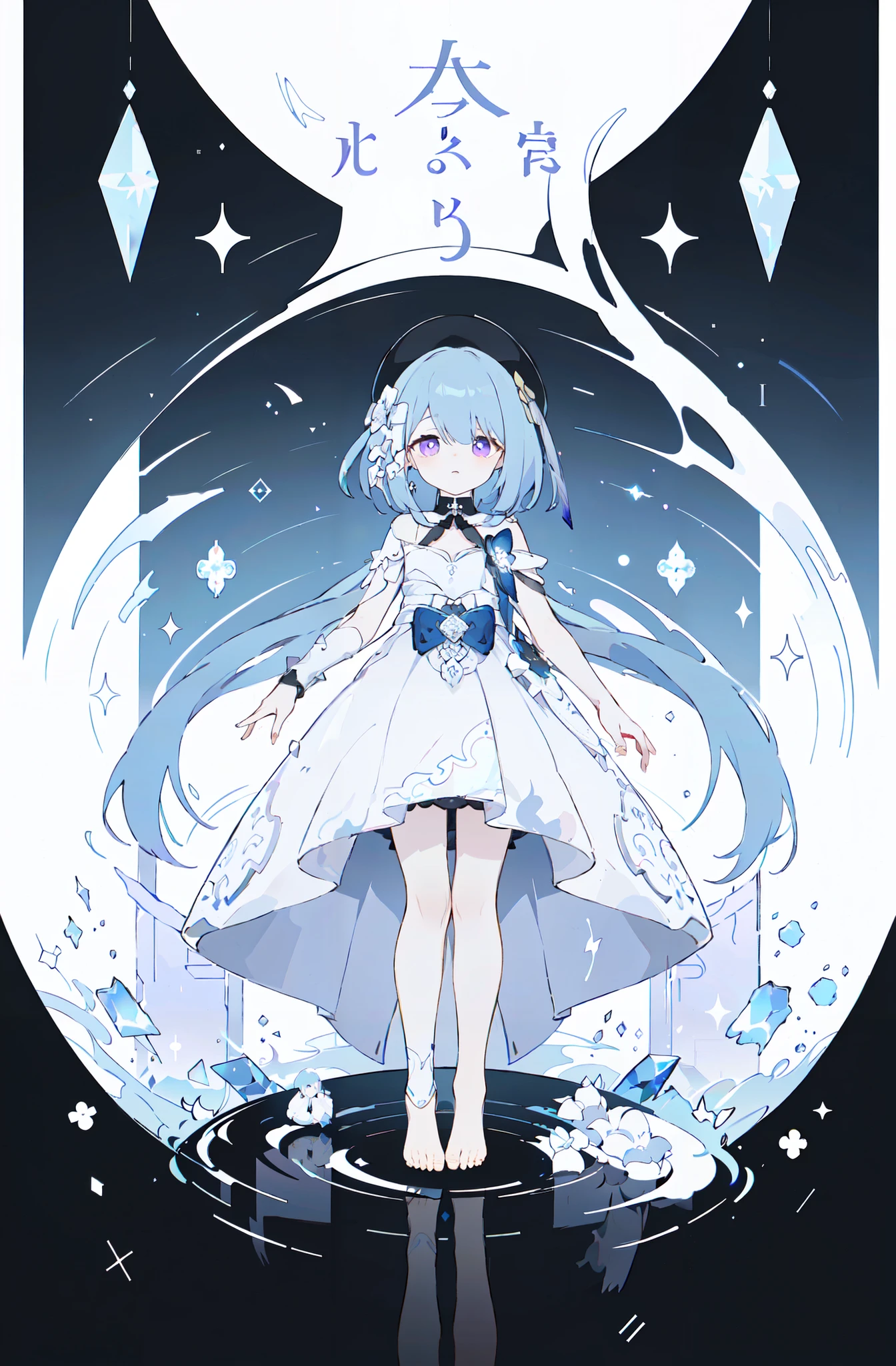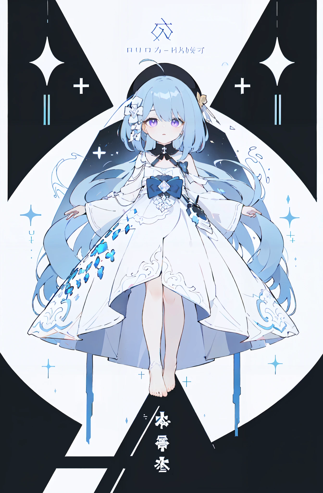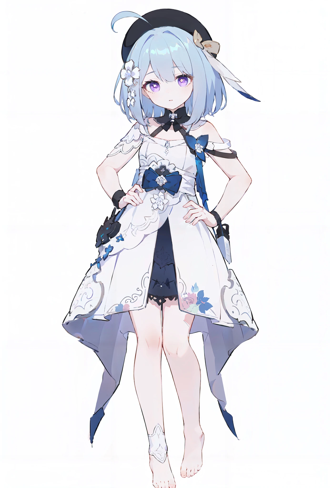 gelei, 1girl, white dress, hat, blue hair, purple eyes, barefoot, little girl, 9 years old