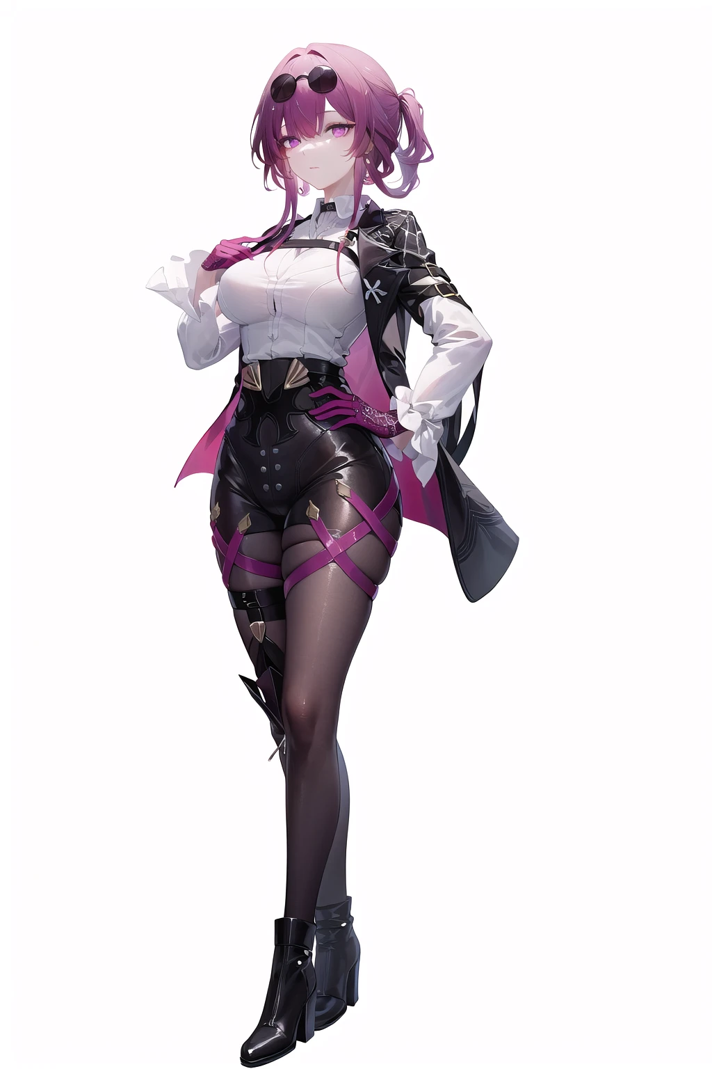 kafuka, 1girl, solo, gloves, pantyhose, purple hair, sunglasses, eyewear on head, large breasts, white shirt, black short, black footwear, boots, bangs, long sleeves, purple eyes, jacket