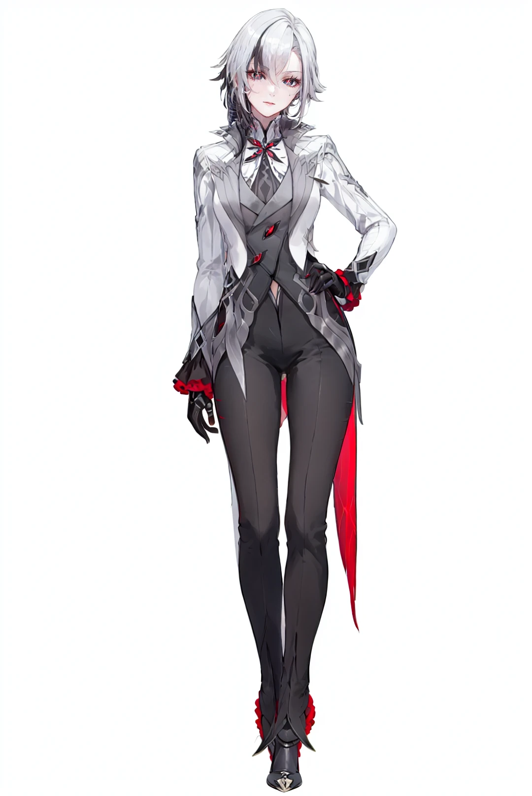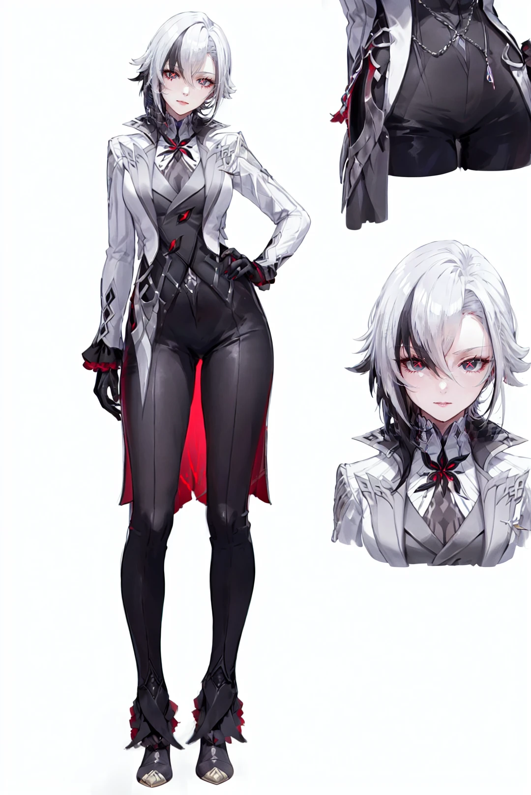 Arlecchino,def clothes,1girl,x-shaped pupils,red pupils,black gloves,pants,symbol-shaped pupils,multicolored hair, black hair, white hair,Created