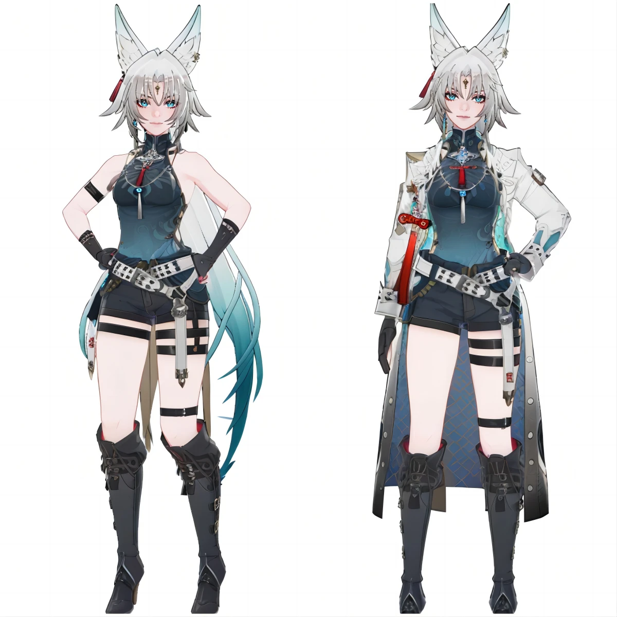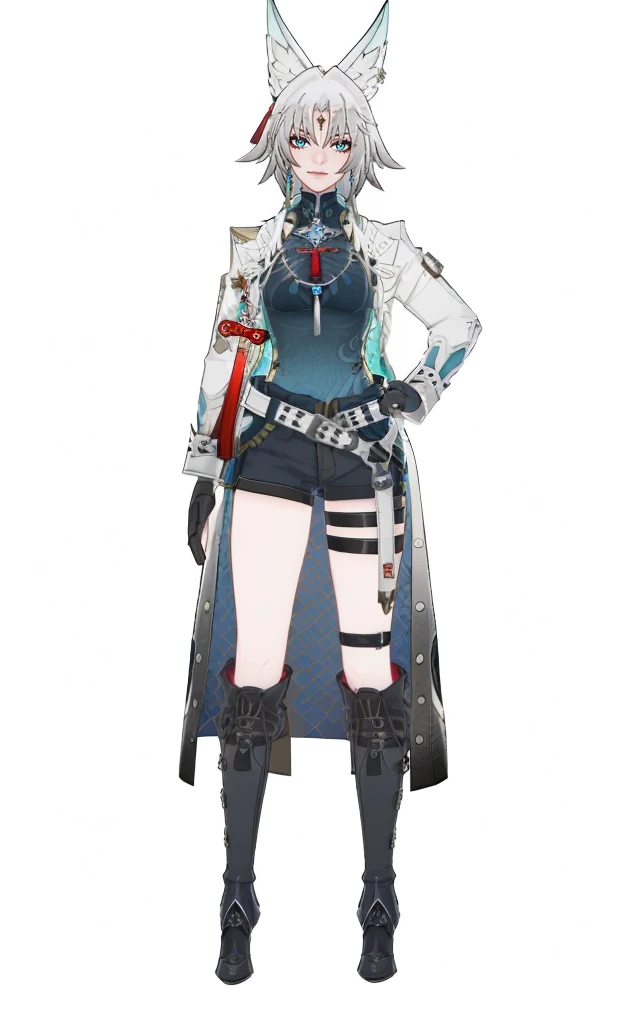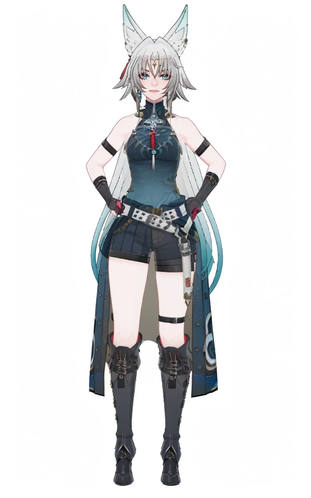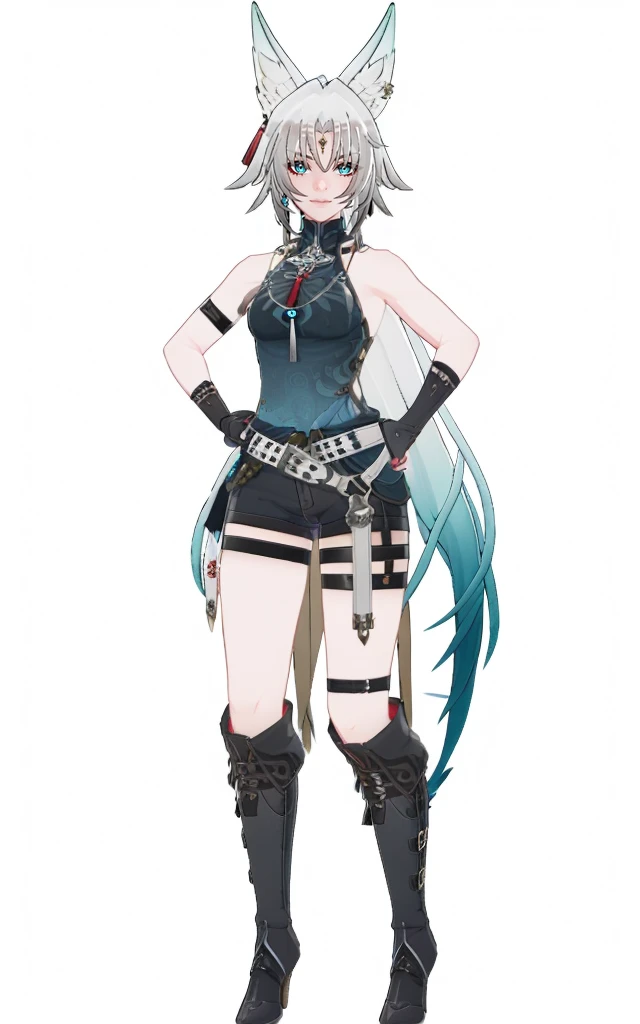 feixiao, default clothes, white jacket, 1girl, animal ears, gloves,blue eyes, black gloves, boots, shorts, multicolored hair, beltfeixiao, default clothes, bare shoulders, 1girl, animal ears, gloves, long hair, boots, black footwear, black gloves, multicolored hair, blue eyes, belt, knee boots, very long hair, standing, gradient hair, shortsCreated
