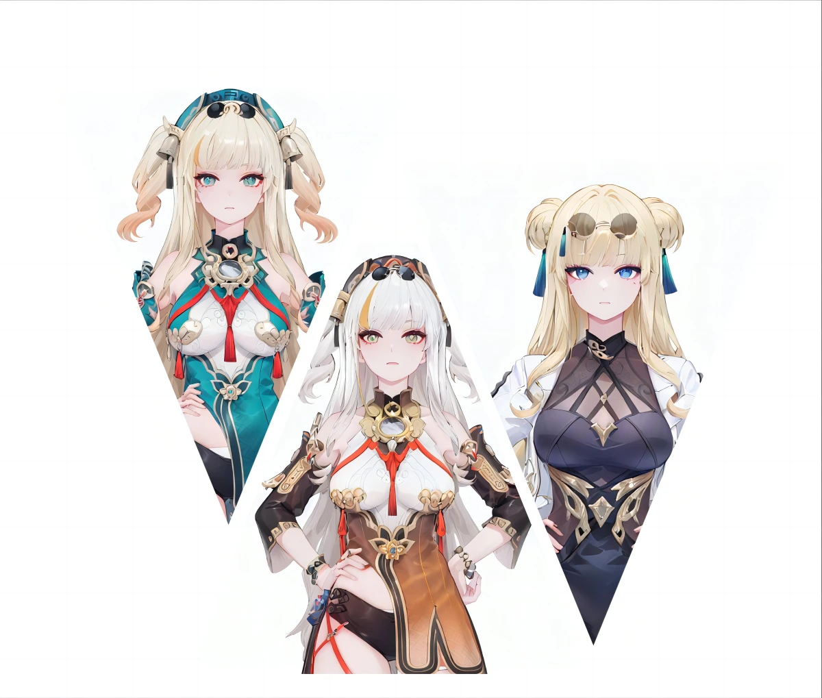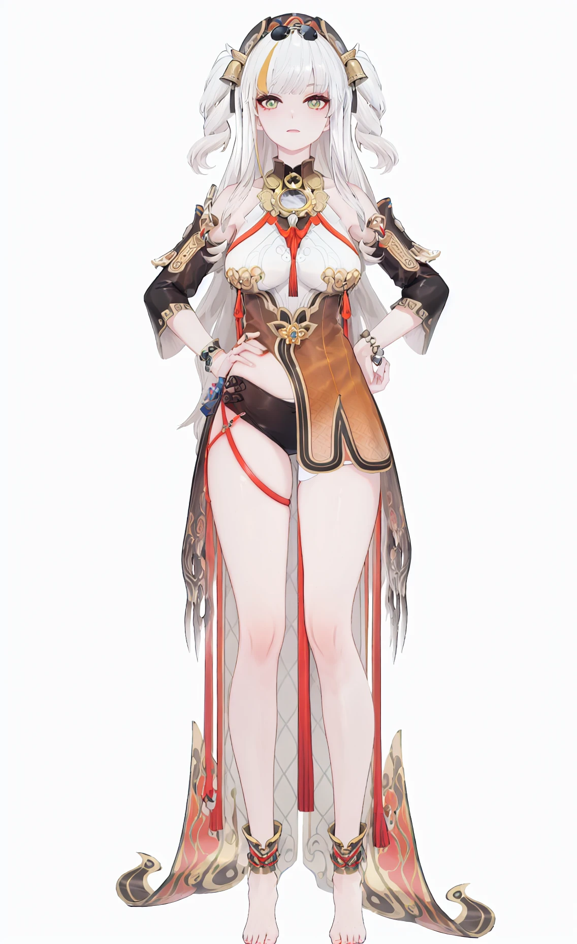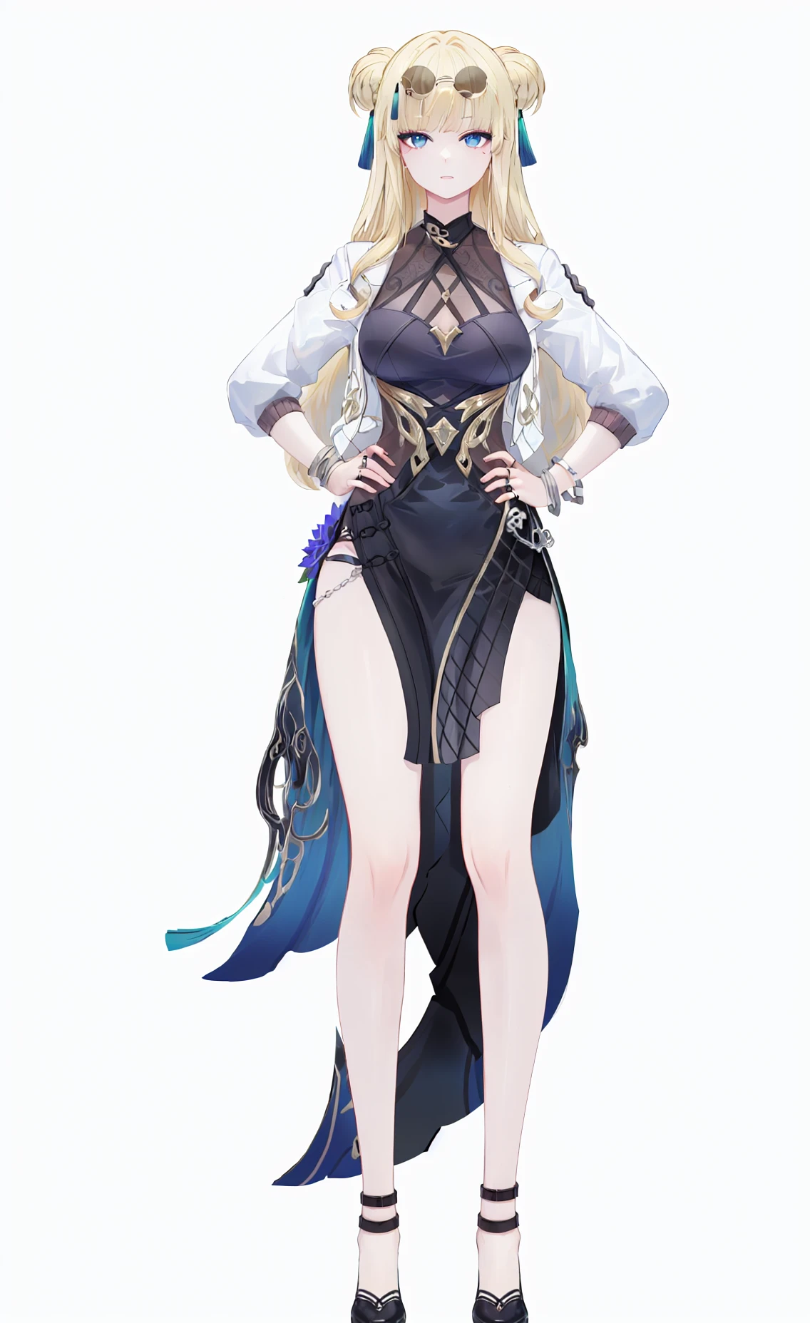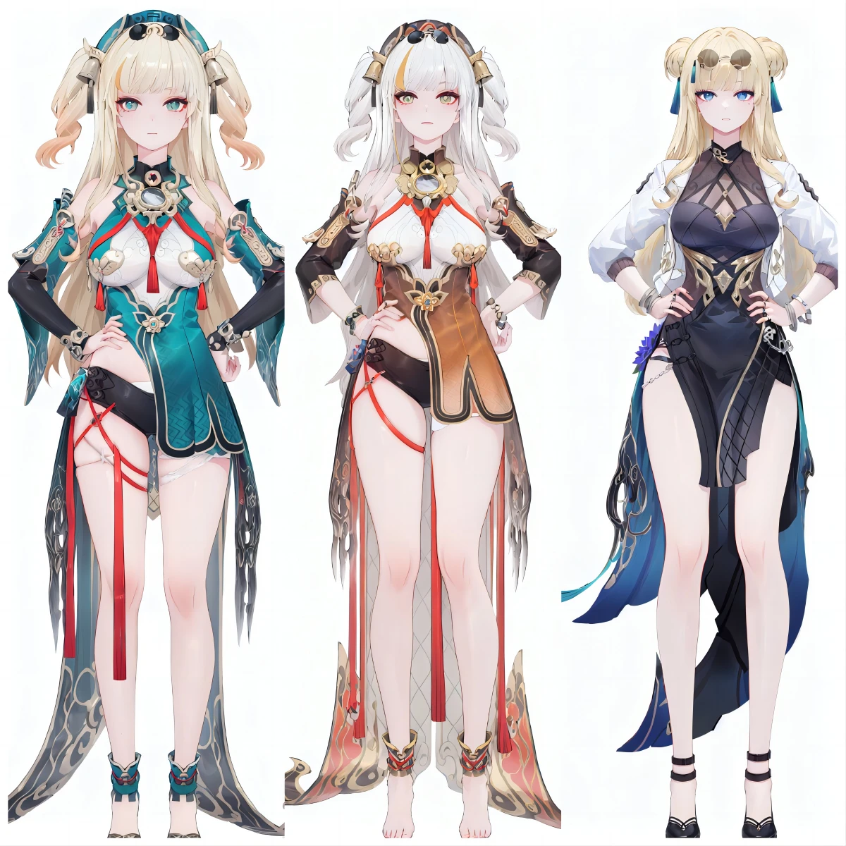 songque, def clothes, youfang, 1girl, blonde hair, long hair, breasts, jewelry, double bun, blue eyes, ring, black skirt, high heels, white jacket, eyewear on head, sunglassessongque, 1st clothes, shen1, 1girl, blonde hair, long hair, two side up, breasts, multicolored hair,songque, 2nd clothes, shen2, golden clothes, 1girl, long hair, jewelry, barefoot, two side up, multicolored hair,Created