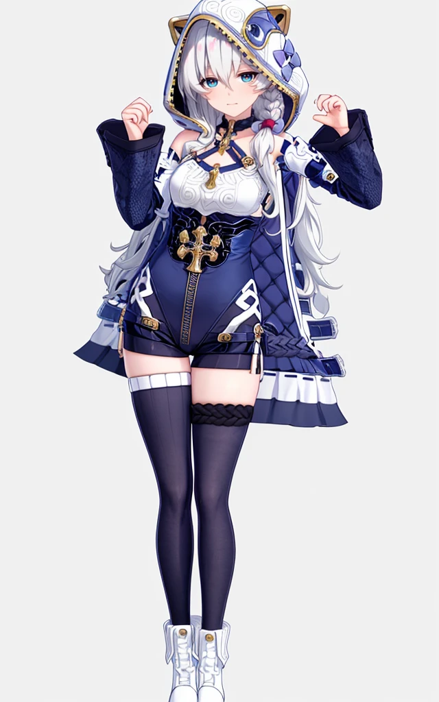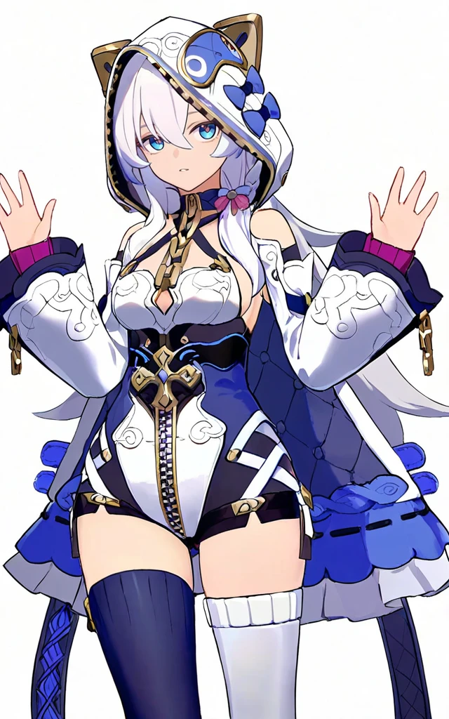 hood, dlstianming, dlstianming default clothes, 1girl, thighhighs, blue eyes, white footwear, long hair, hood up, white hair, long sleeves, breasts, hair between eyes, bangs,Created