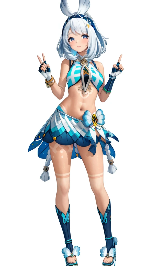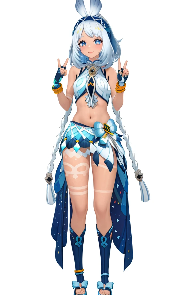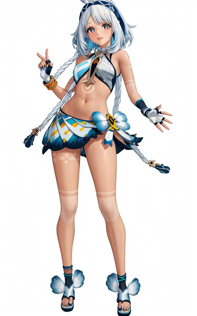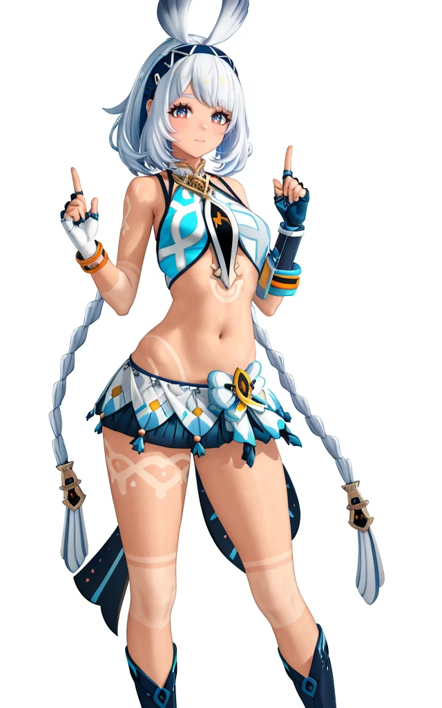 hairband, mualani, default clothes, 1girl, fingerless gloves, looking at viewer, navel, long hair, twin braids,, dark skin,Created