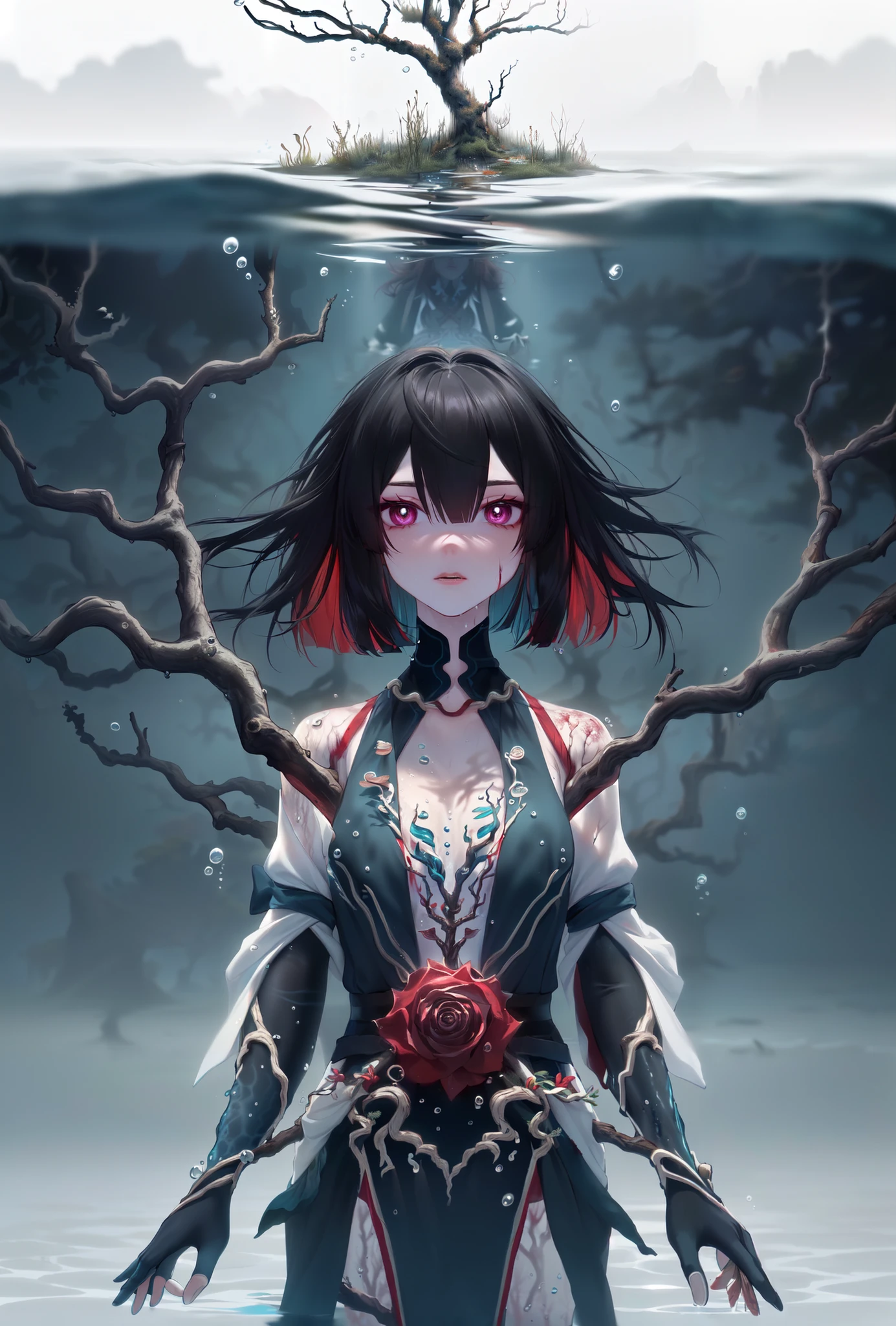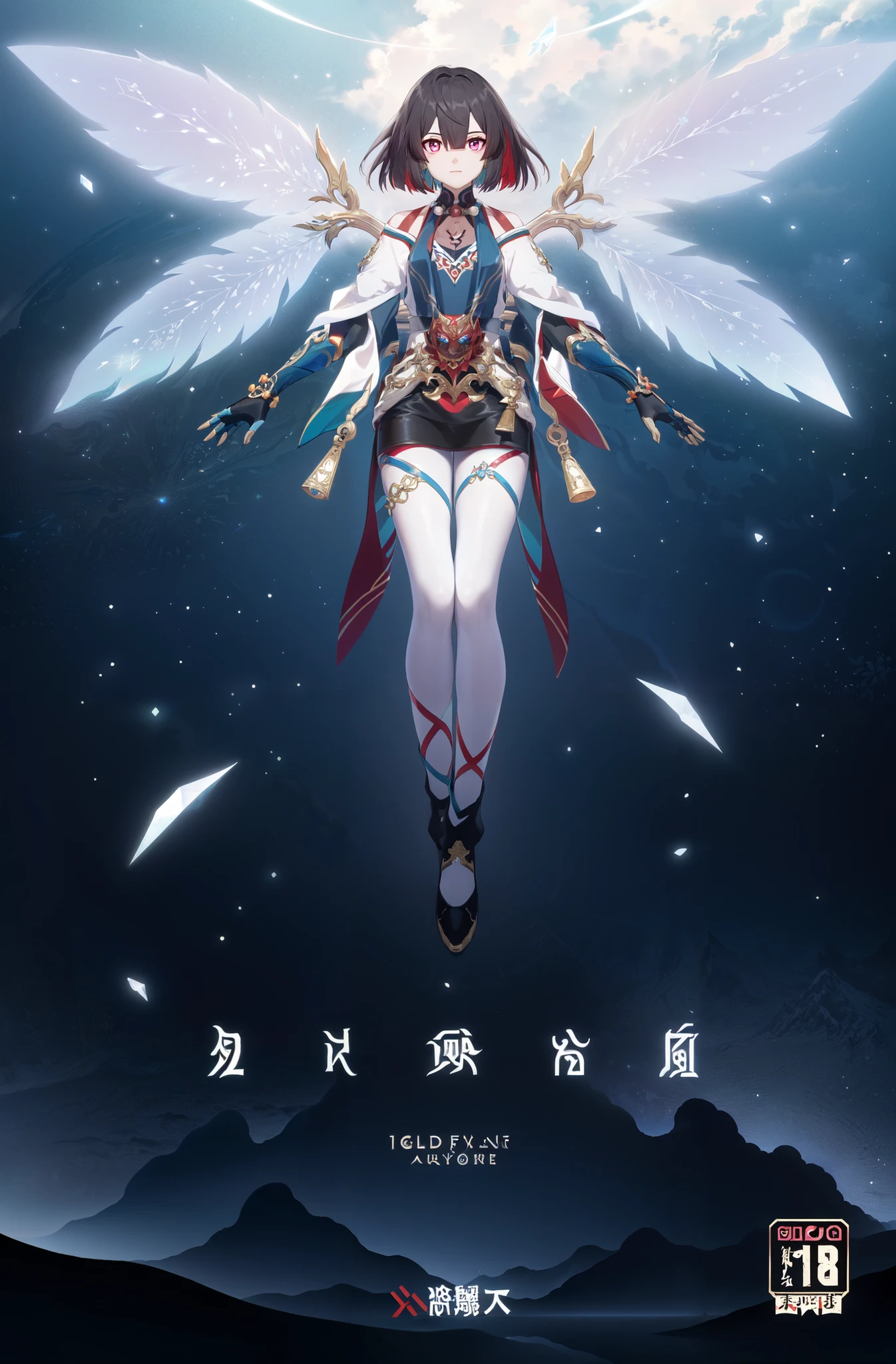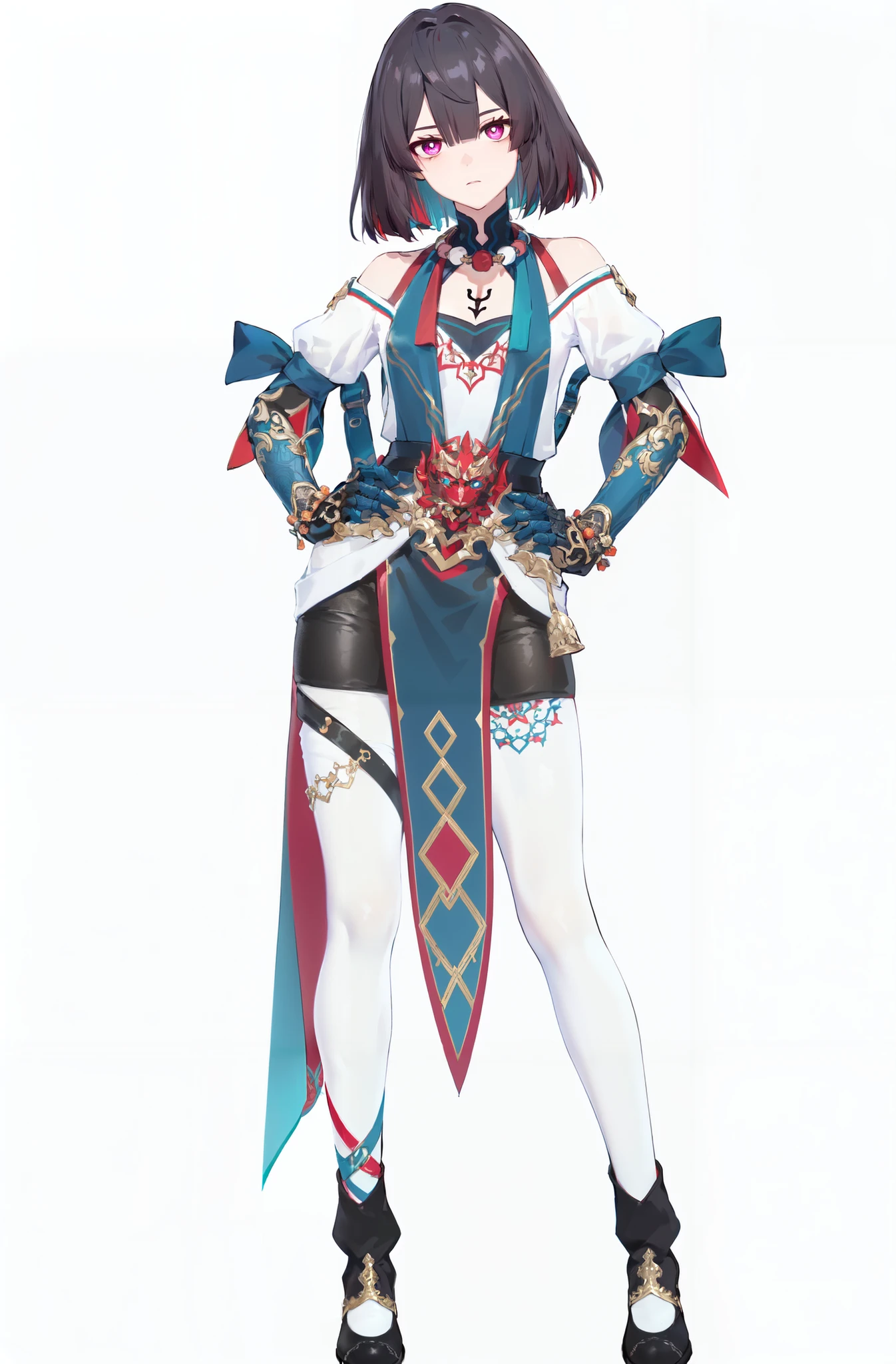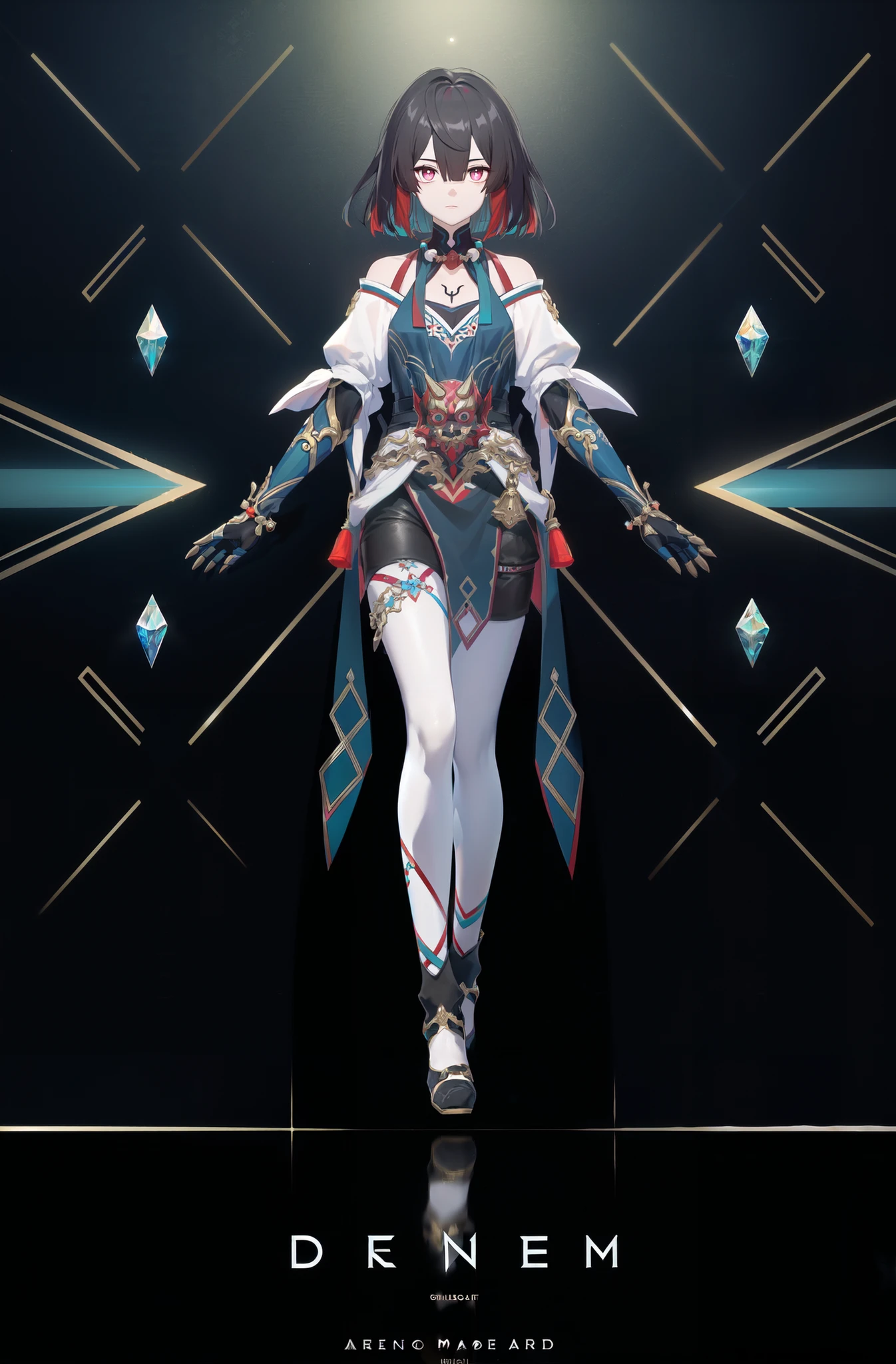xueyi, 1girl, short hair, black hair, multicolored hair, jewelry, colored inner hair, multicolored eyes, red hair, white thighhighs, Created
