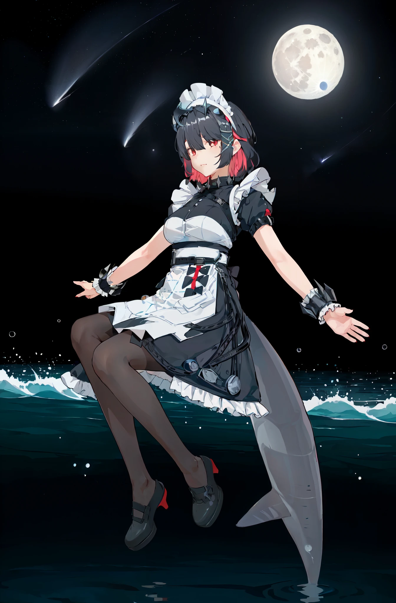 maid, Ellen Joe, 1tail, shark girl, (shark:-0.5), 1girl, red eyes, tail, pantyhose, multicolored hair, black footwear, short sleeves, apron, wrist cuffs, maid headdress