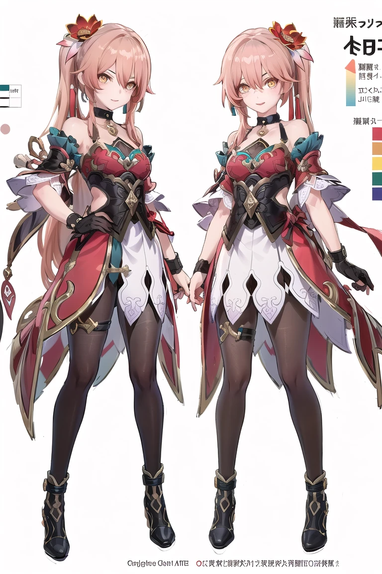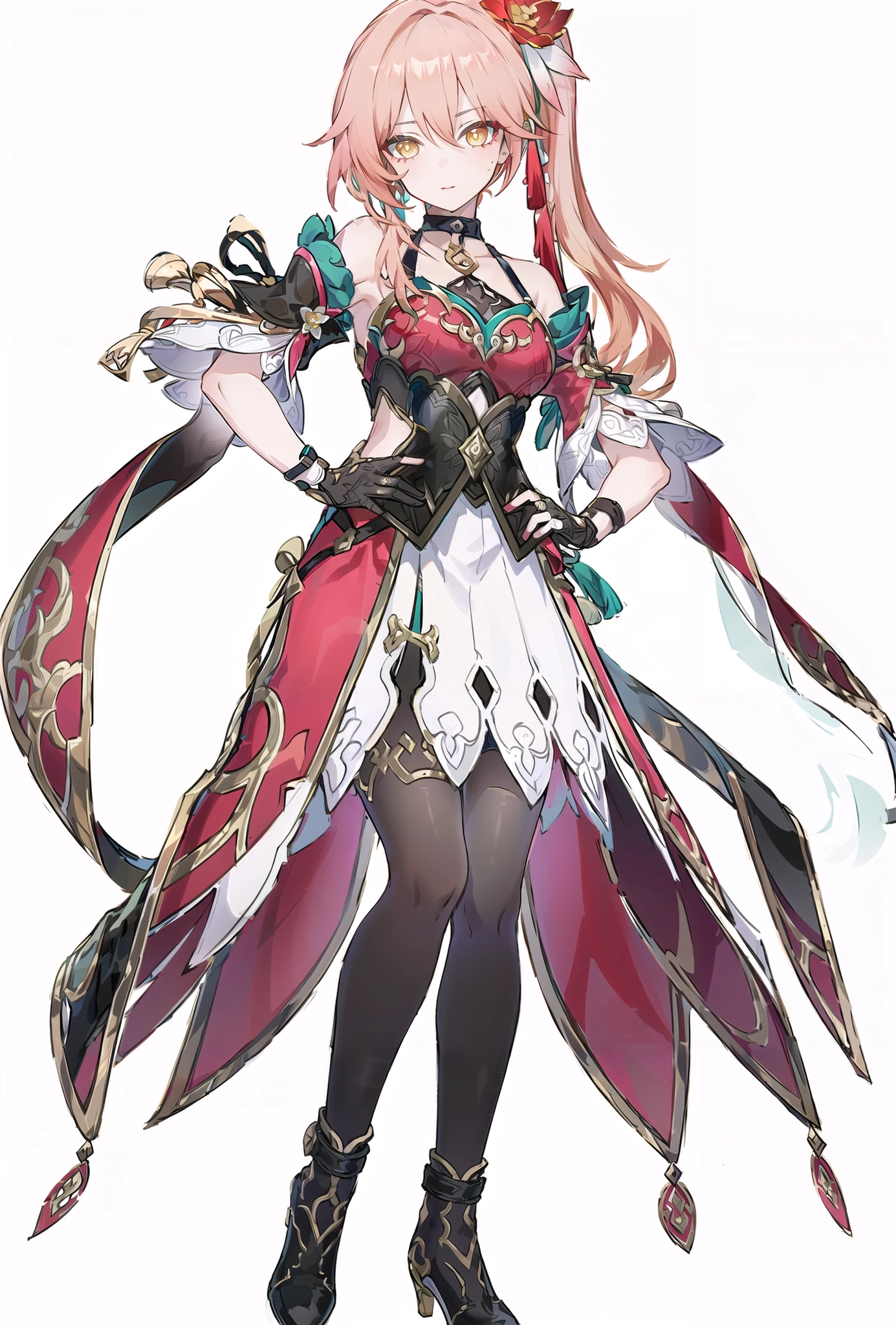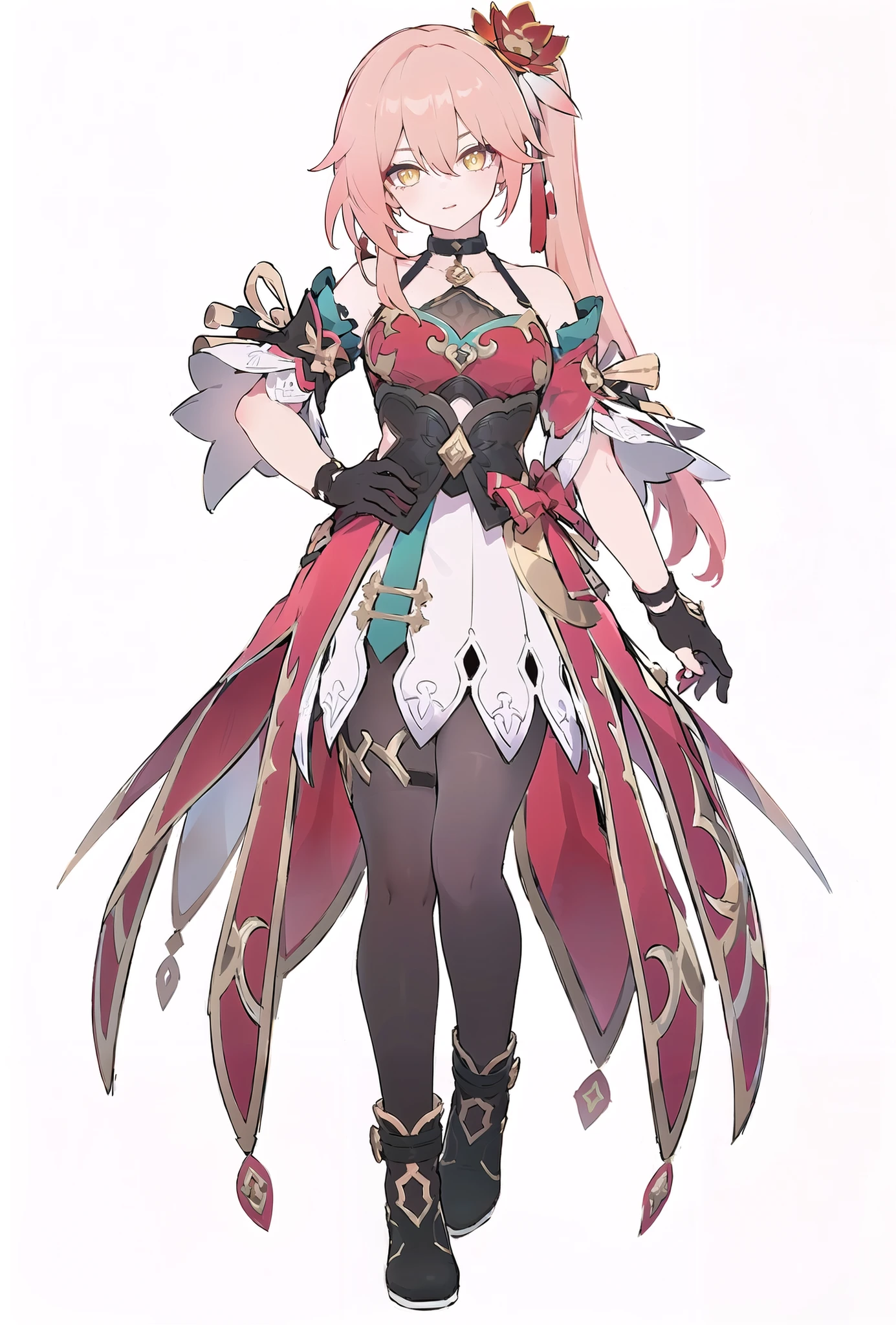 gnf, long hair, dress, side ponytail, hair ornament, black gloves, pantyhose, black footwear, yellow eyes, breasts, hair flower