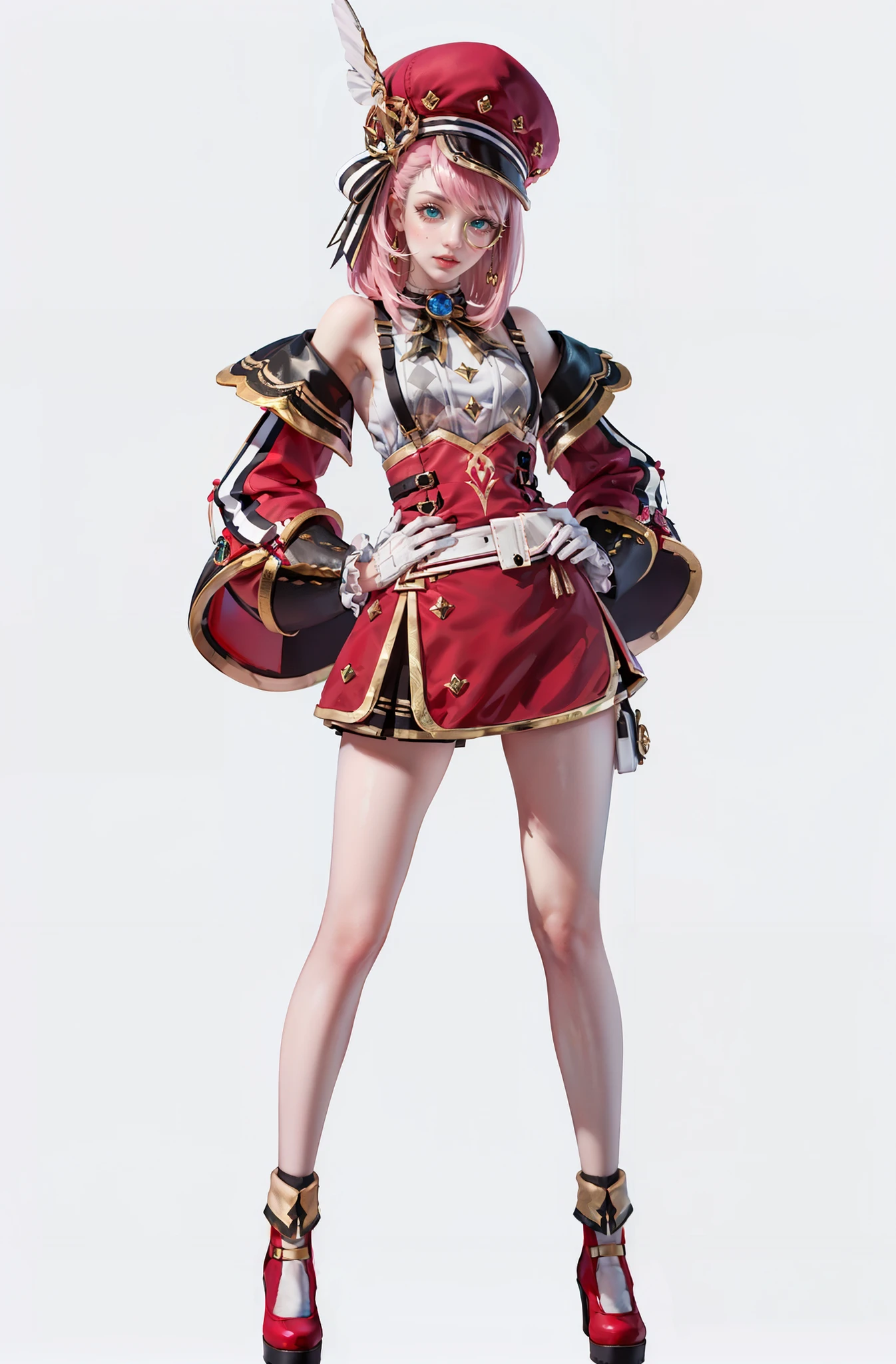 Charlotte, 1girl, white gloves, hat, pink hair, red headwear, aqua eyes, leg grab,(monocle:1.1)