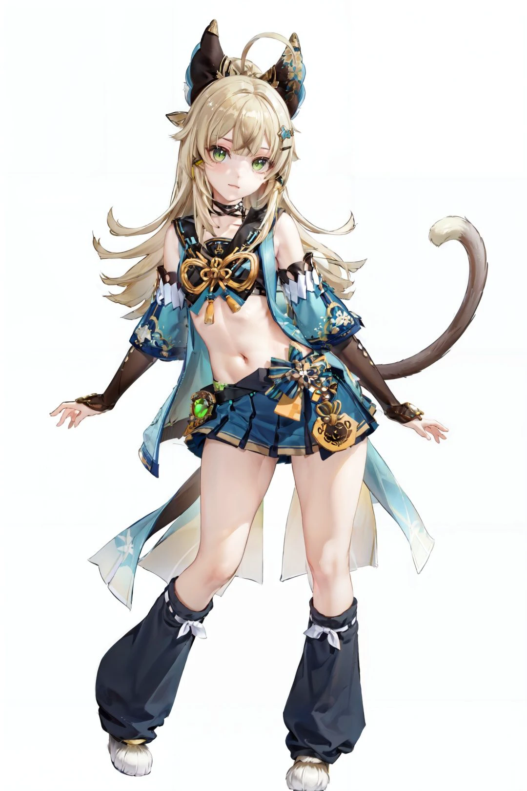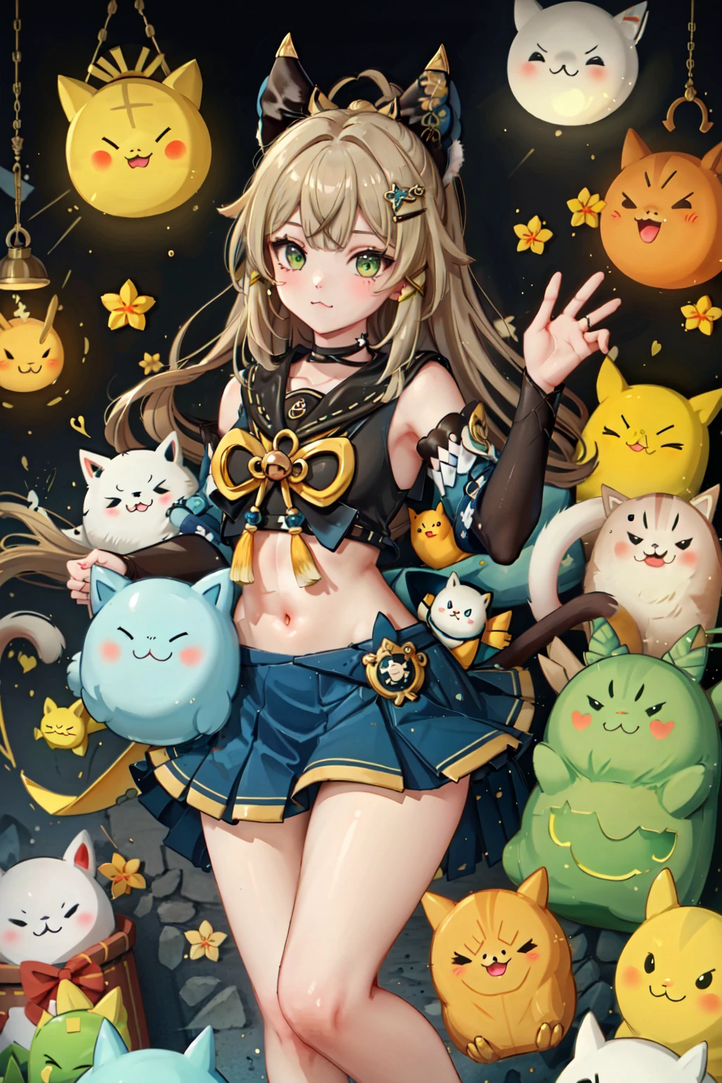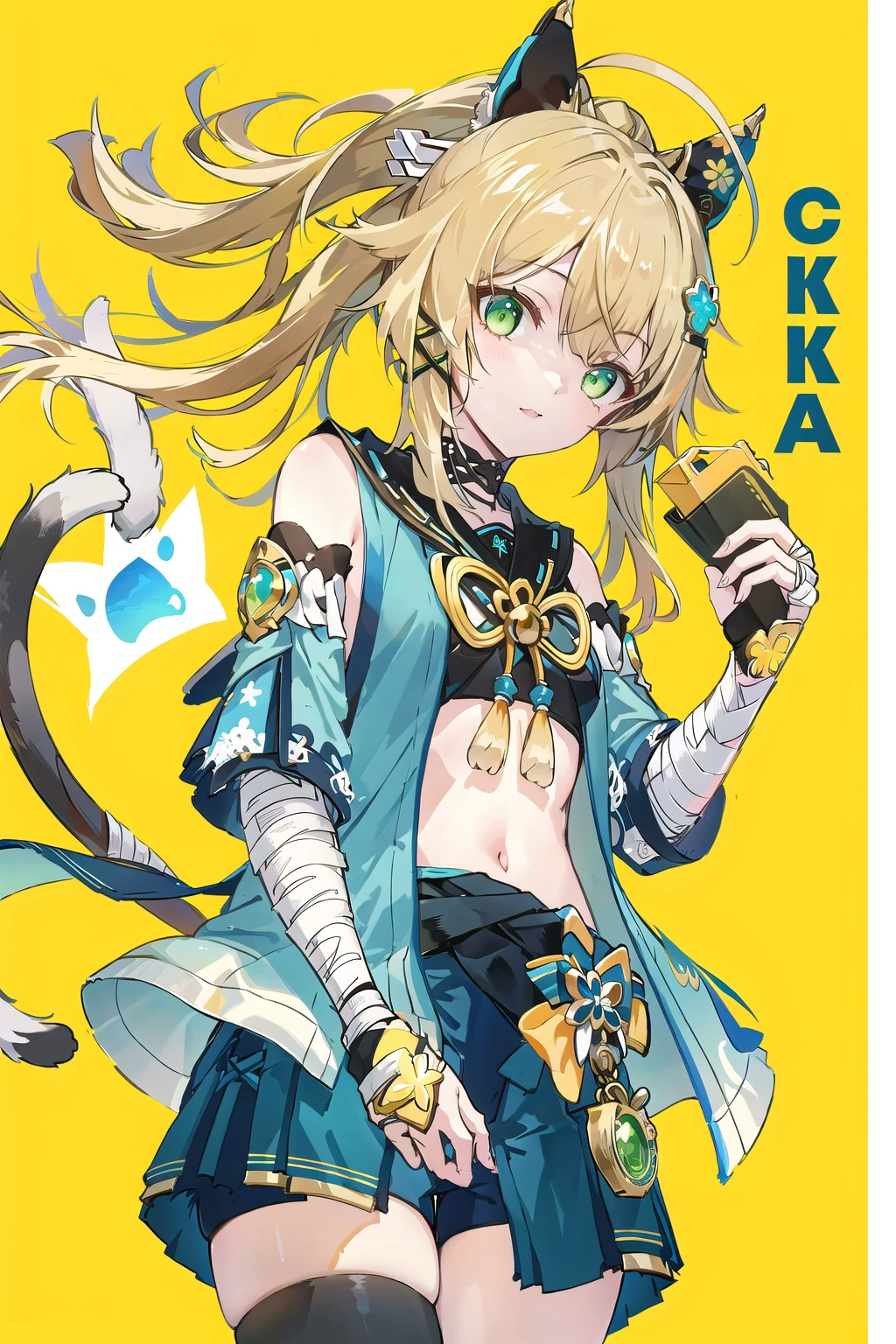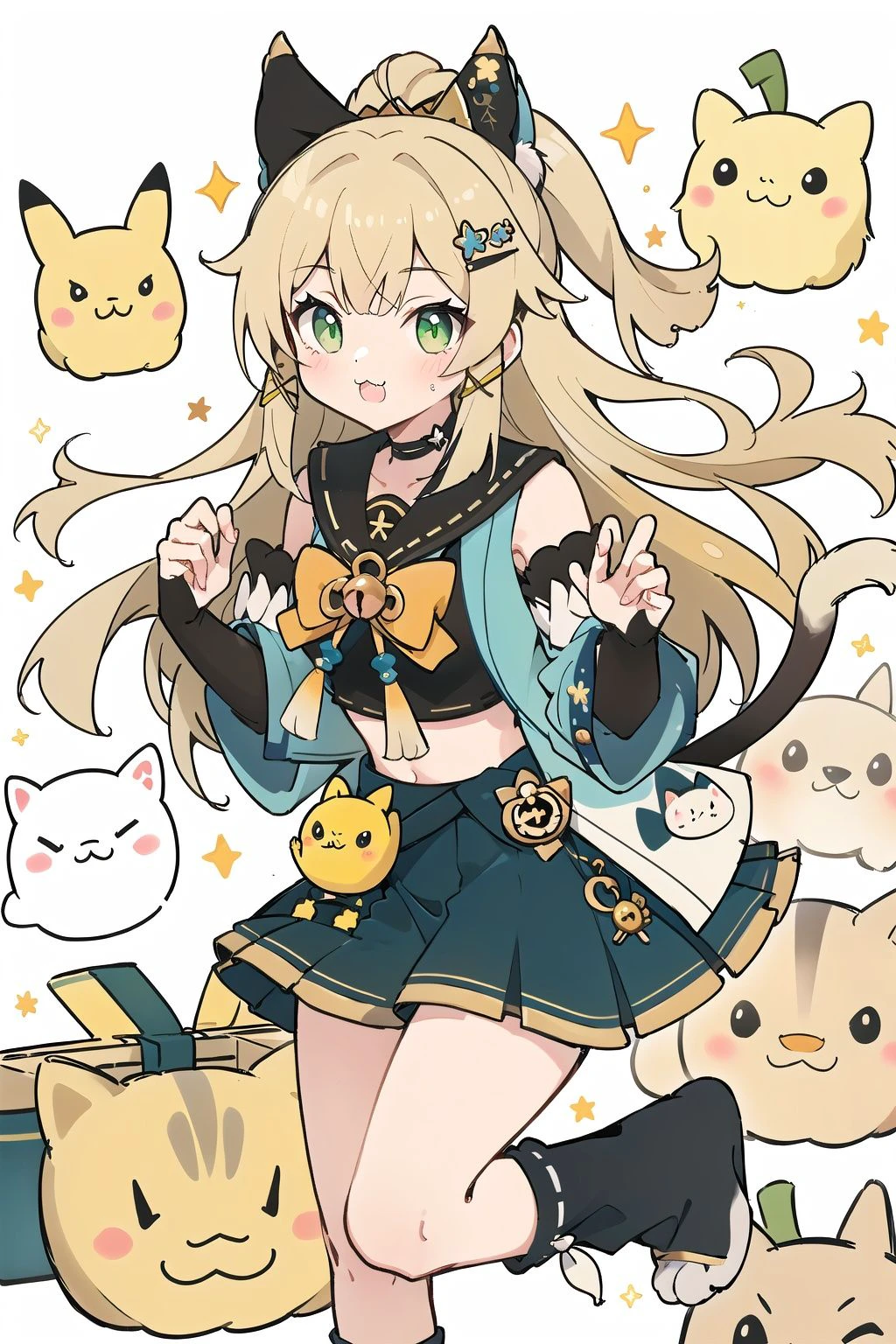 yll, 1girl, green eyes, long hair, tail, hair ornament, bangs, animal ears, blonde hair, skirt, black choker, pleated skirt,Created