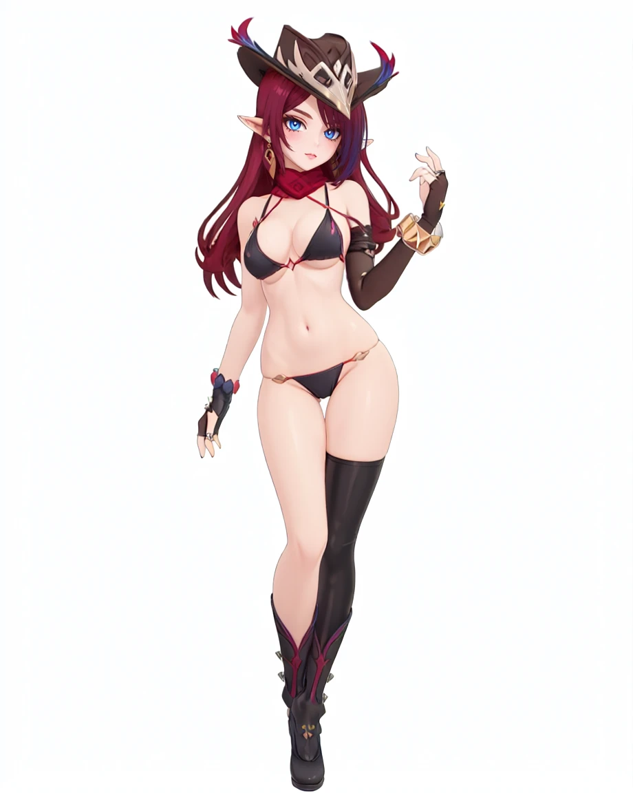 Chasca, Chasca-def clothes, capelet, single pantsleg, blakc corset, 1girl, pointy ears, blue eyes, breasts, hat, jewelry, red long hair, black boots, navel, earrings, bracelet, black asymmetrical fingerless gloves, asymmetrical clothes, hanging ornaments,Created
