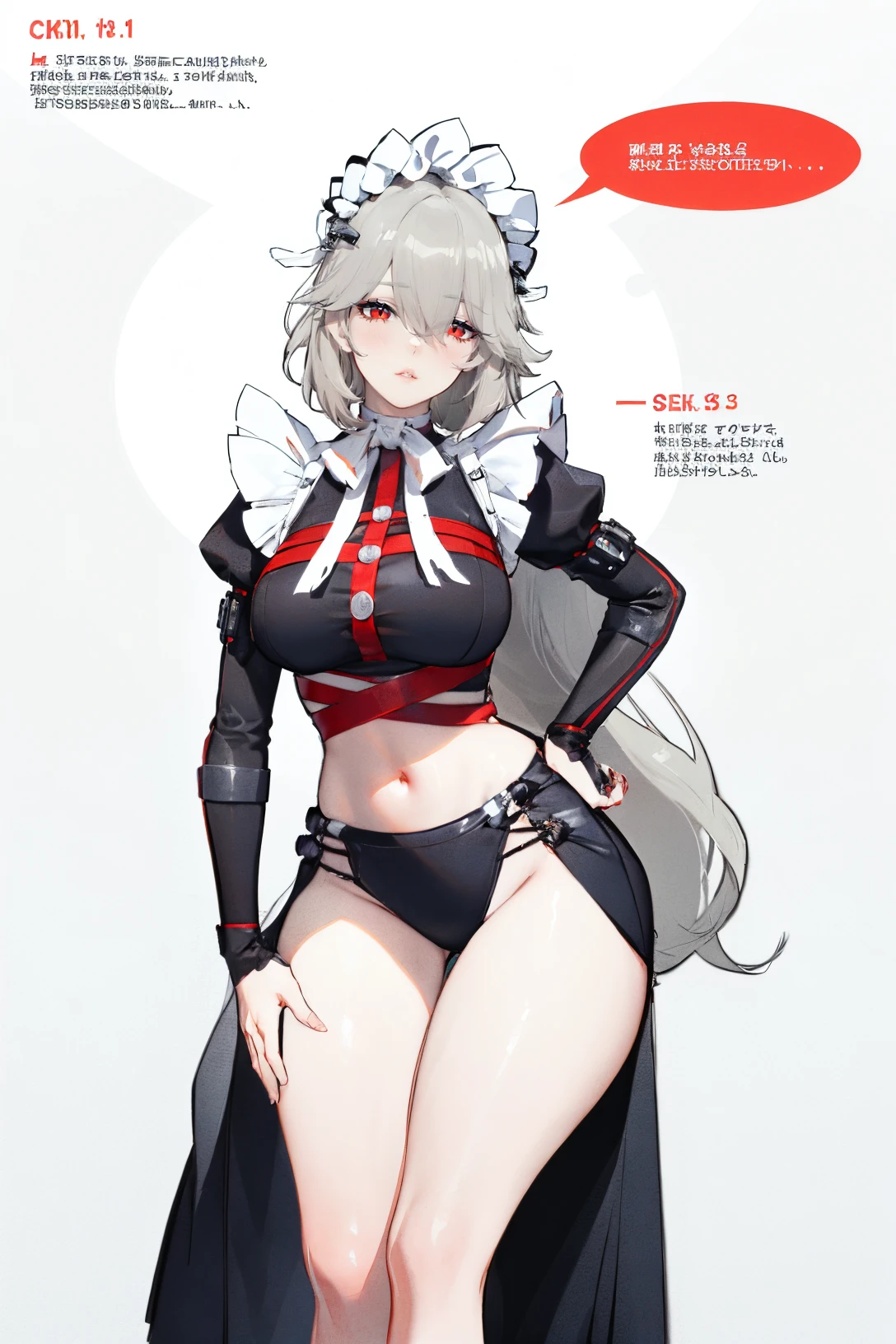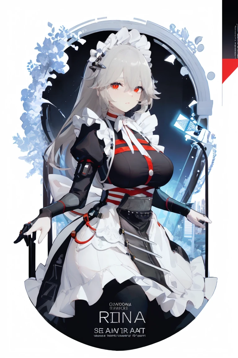 rina, rina's def clothes, long dress, 1girl, red eyes, maid, grey hair, maid headdress, breasts, apron, Created