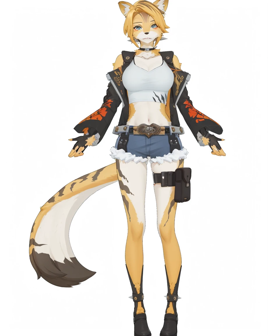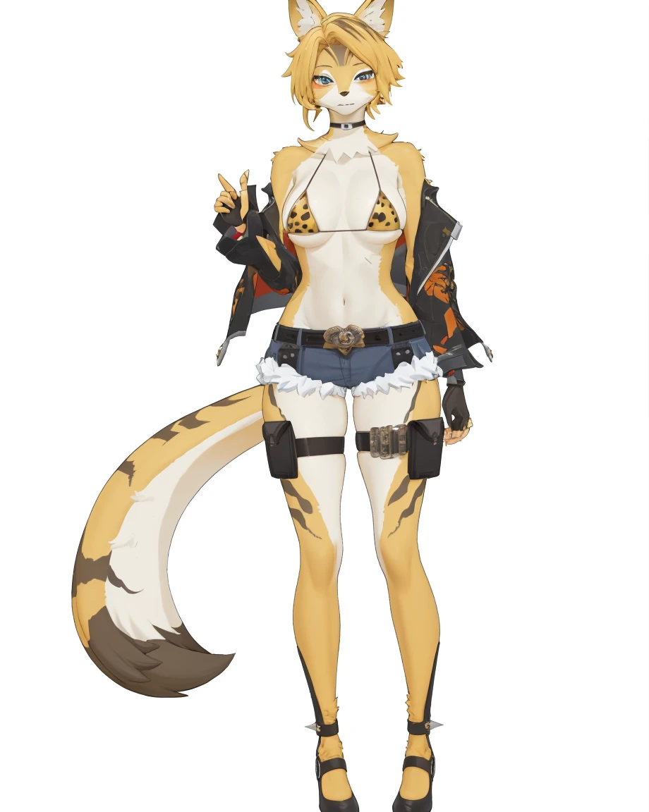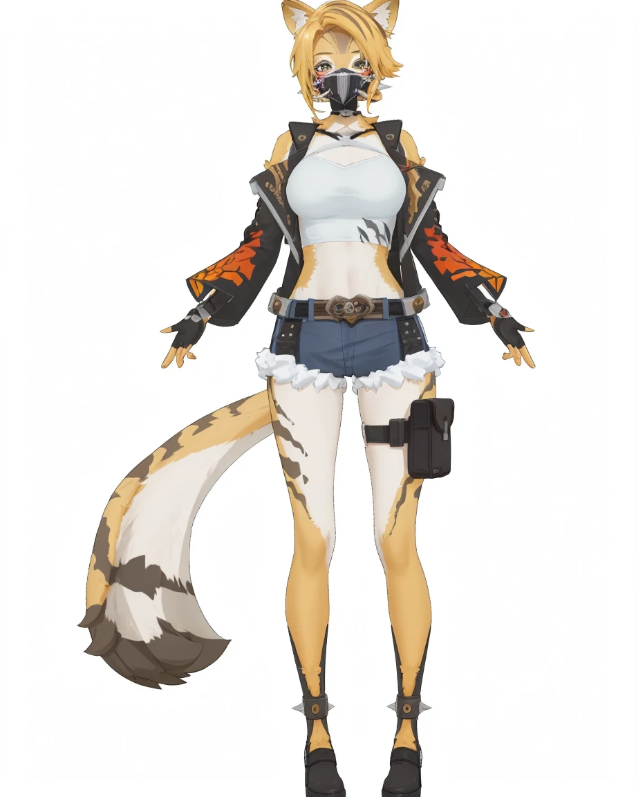 pulchra fellini \(zenless zone zero\),clothes: pulchra def clothes,cheetah girl,fur skin,furry,1girl,animal ears,tail,fingerless gloves,jacket,short hair,mask,shorts,belt,blonde hair,open jacket,cutoffs,midriff,thigh strap,full body fur,Created