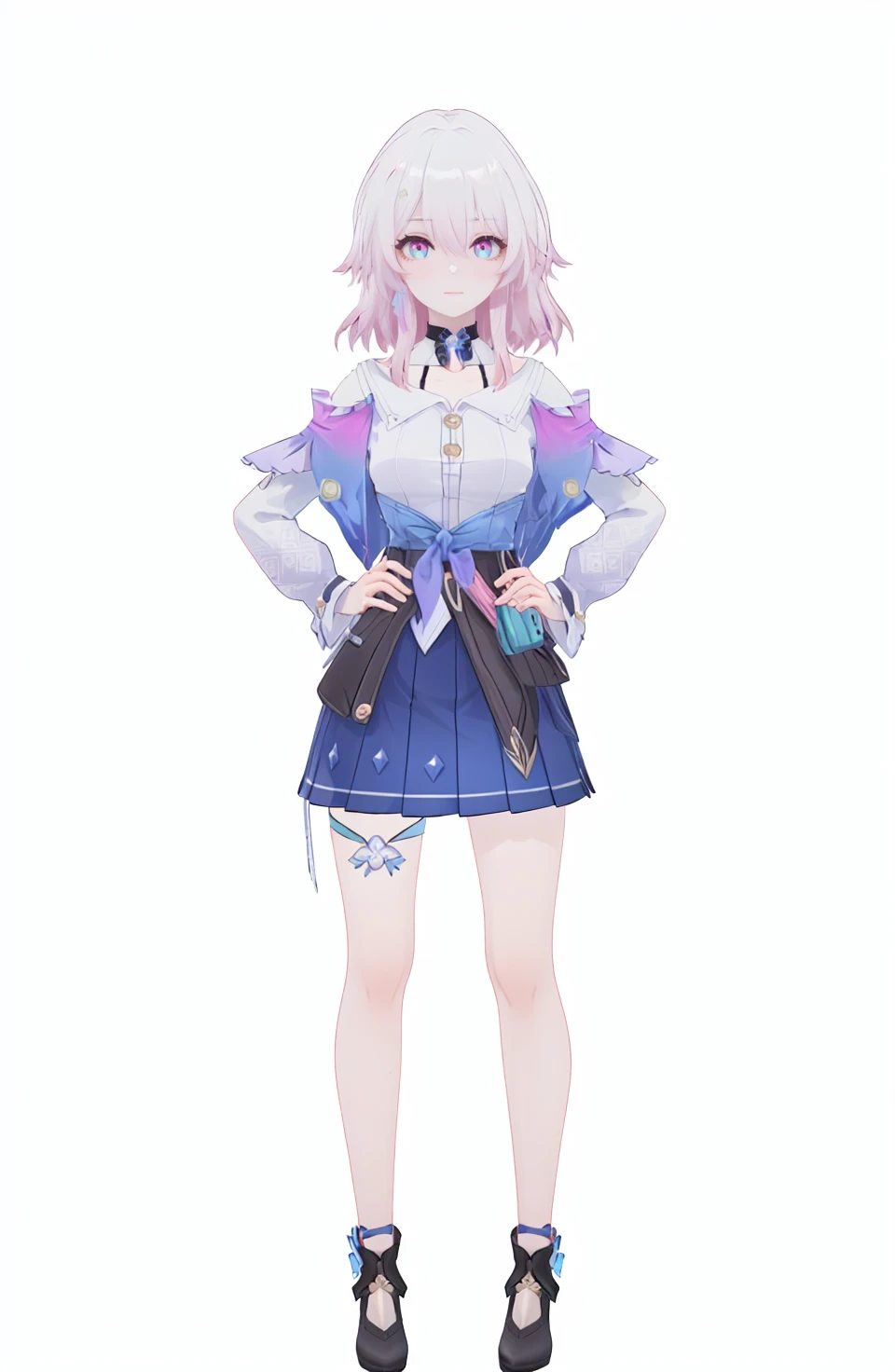 sanyueqi, 1st clothes, 1girl, blue skirt, pink hair, white shirt, bangs, long sleeves, blue eyes,sanyueqi, 2nd clothes, blue princess short dress, 1girl, blue eyes, bangs, bare shoulders, dress, white thighhighs,sanyueqi, 3rd clothes, chinese clothes, 1girl, fingerless gloves, multicolored eyes, breasts, black gloves, white thighhighs,Created
