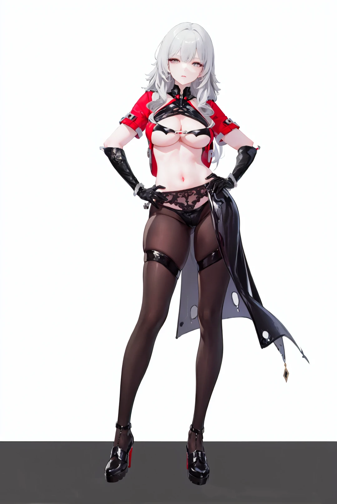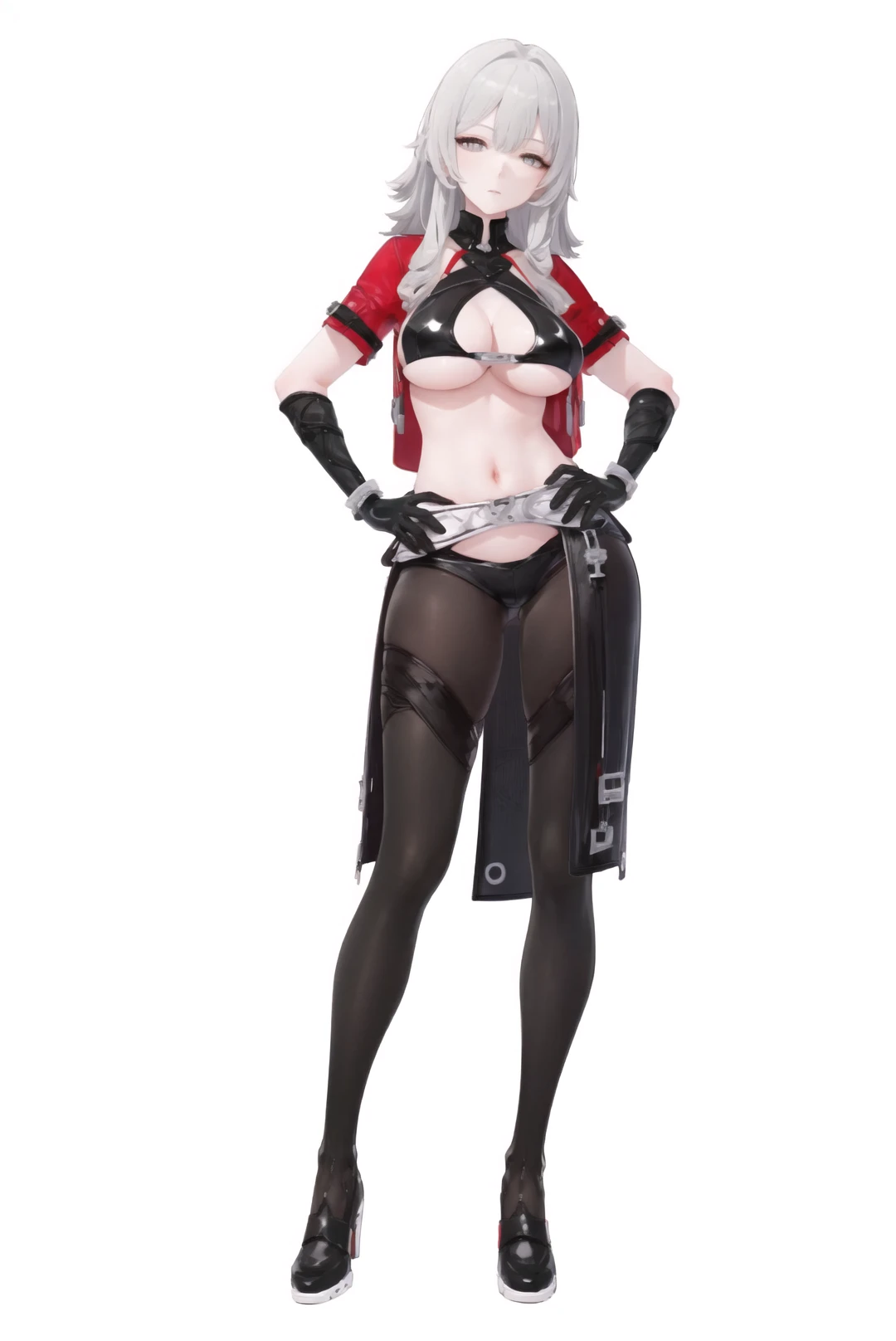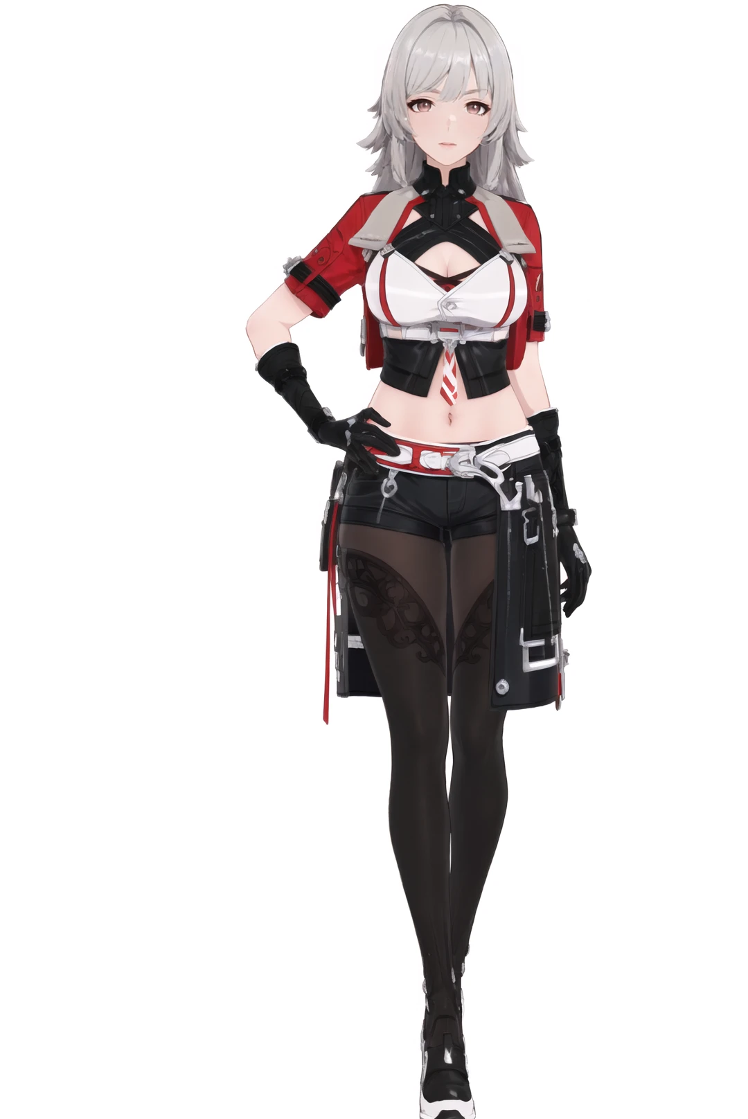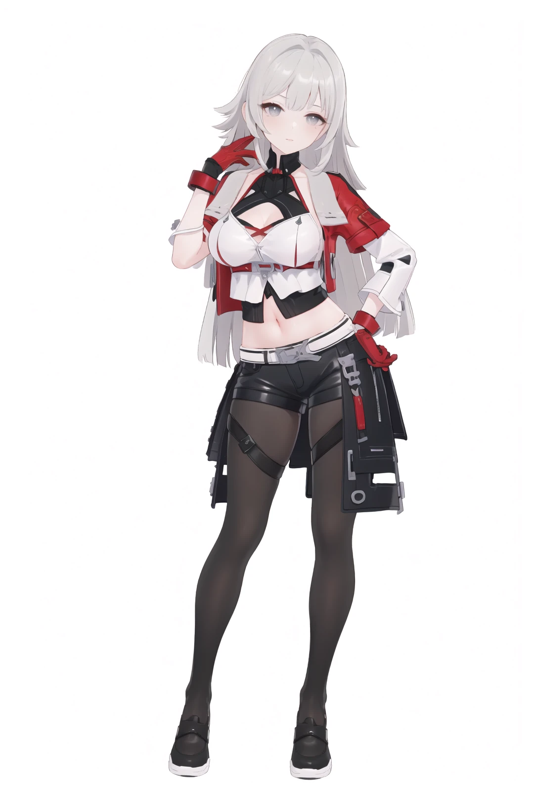 Helia, def clothes, 1girl, gloves, long hair, grey hair, navel, pantyhose, shorts, breasts, Created