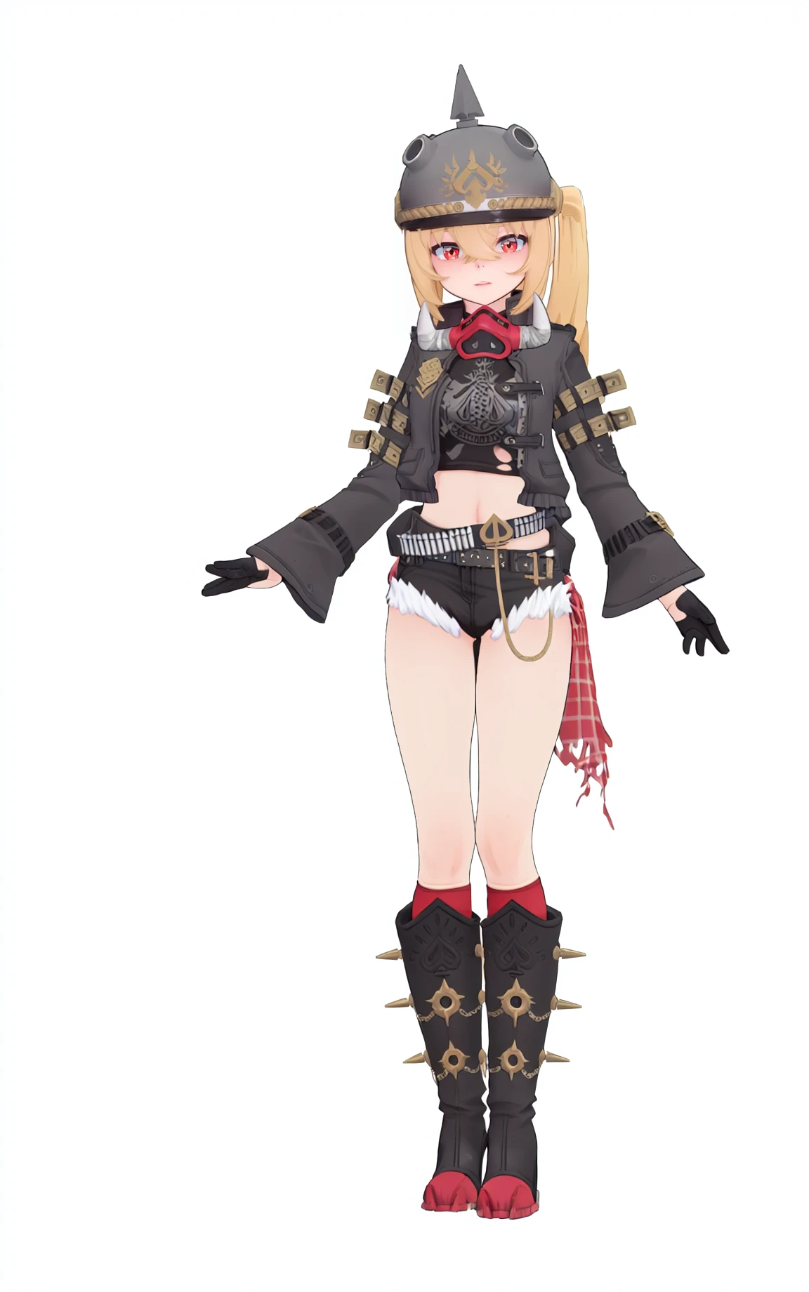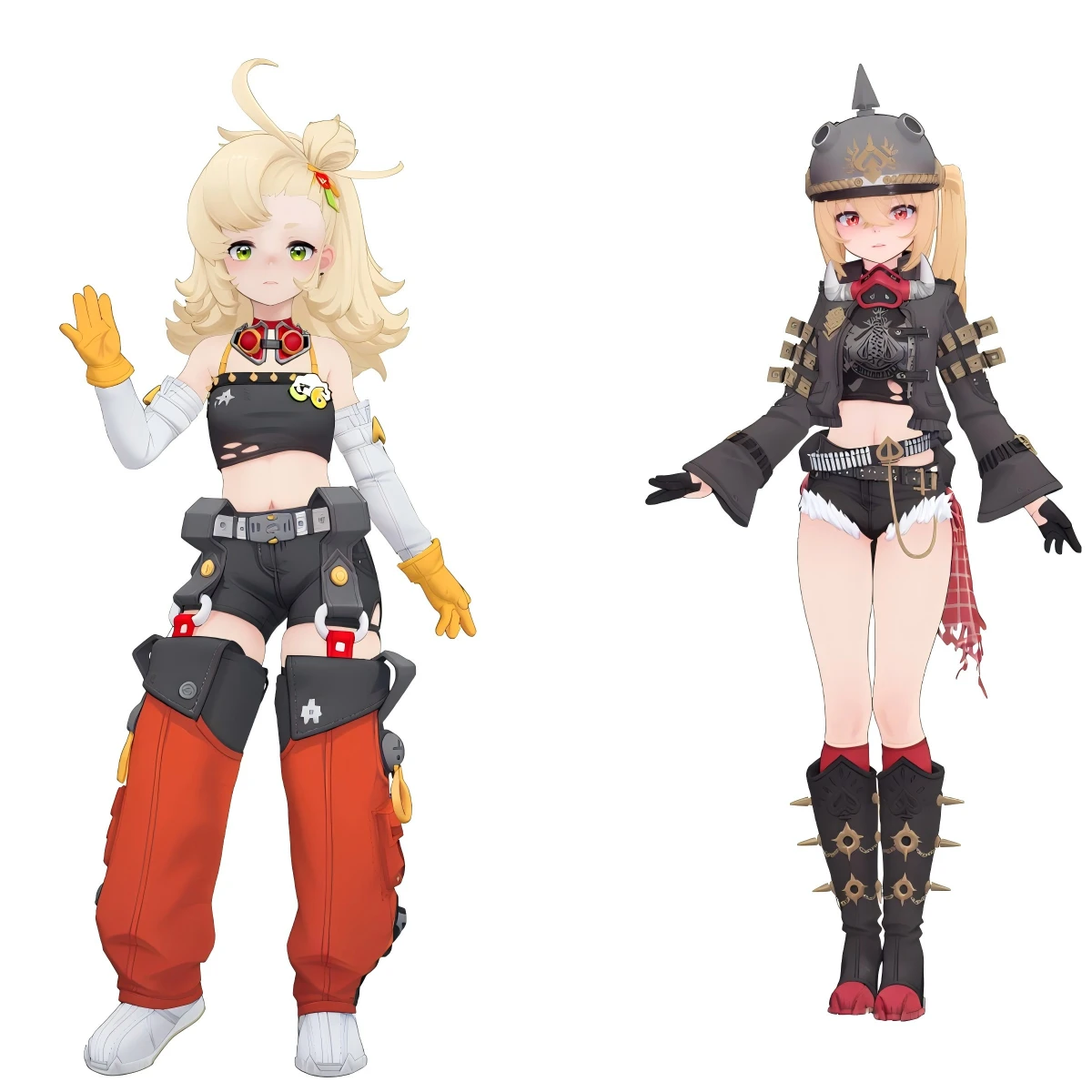 luxi, def-clothes of luxi, side ponytail, 1girl, blonde hair, gloves, black gloves, boots, short shorts, helmet, navel, black shorts, long hair, spikes, belt, midriff, black footwear, jacket, long sleeves, red eyes,paipai, def-clothes of paipai, bangs pinned back, 1girl, green eyes, blonde hair, gloves, black shorts, hair ornament, yellow gloves,Created