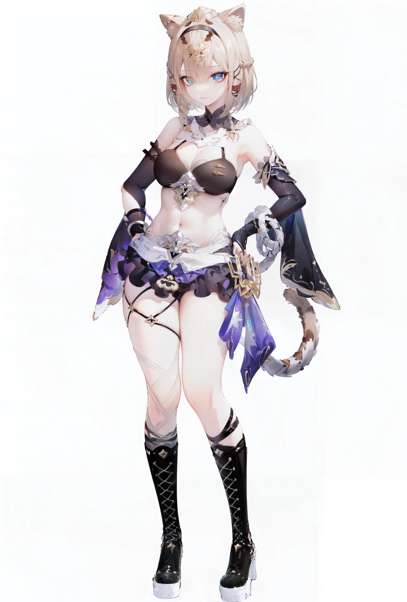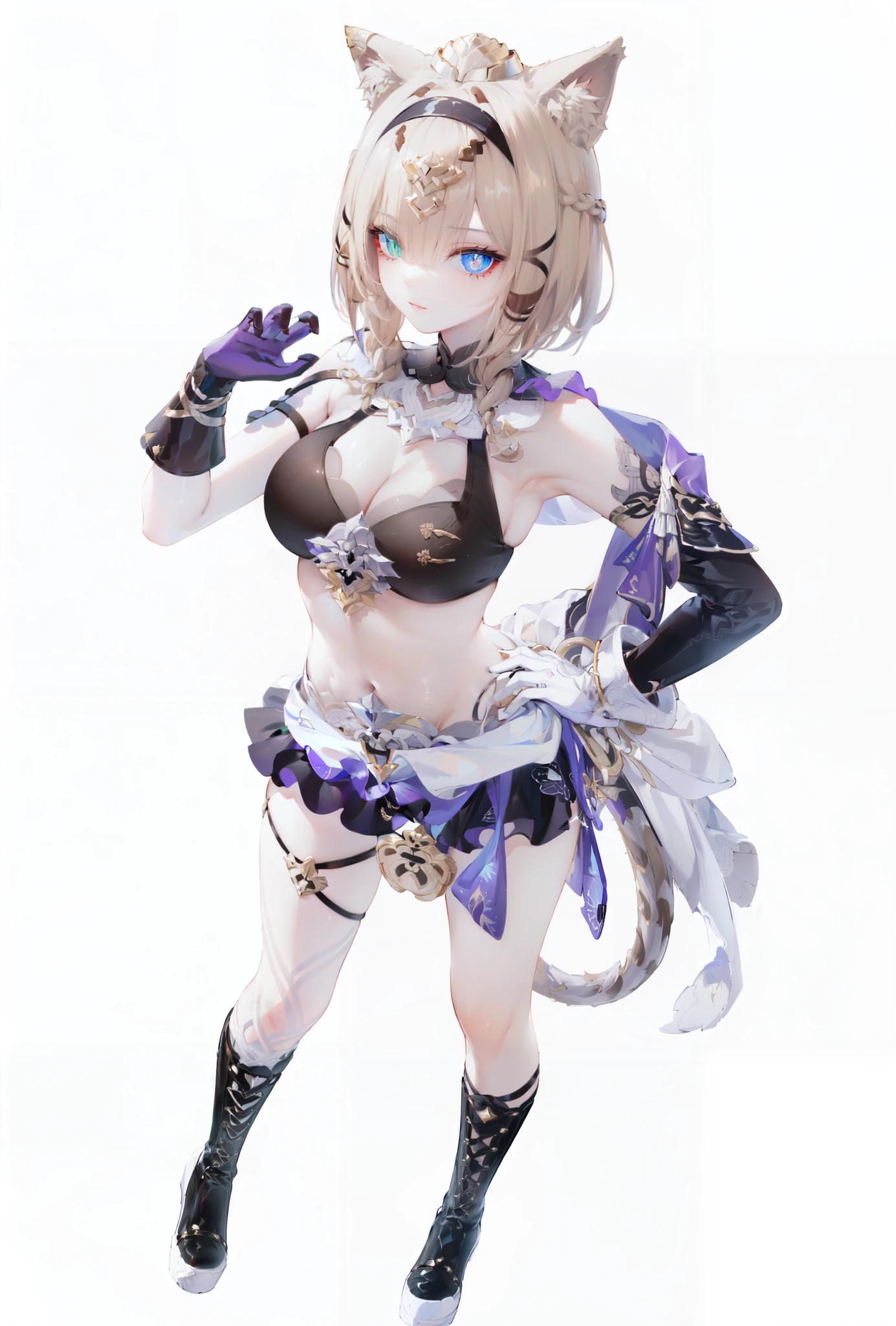 (paduo:1.1), 1girl, cat ears, animal ears, breasts, boots, cat girl, bikini top only, cat tail, gloves, cleavage, brown hair, black footwear, heterochromia,(black skirt:0.5),Created