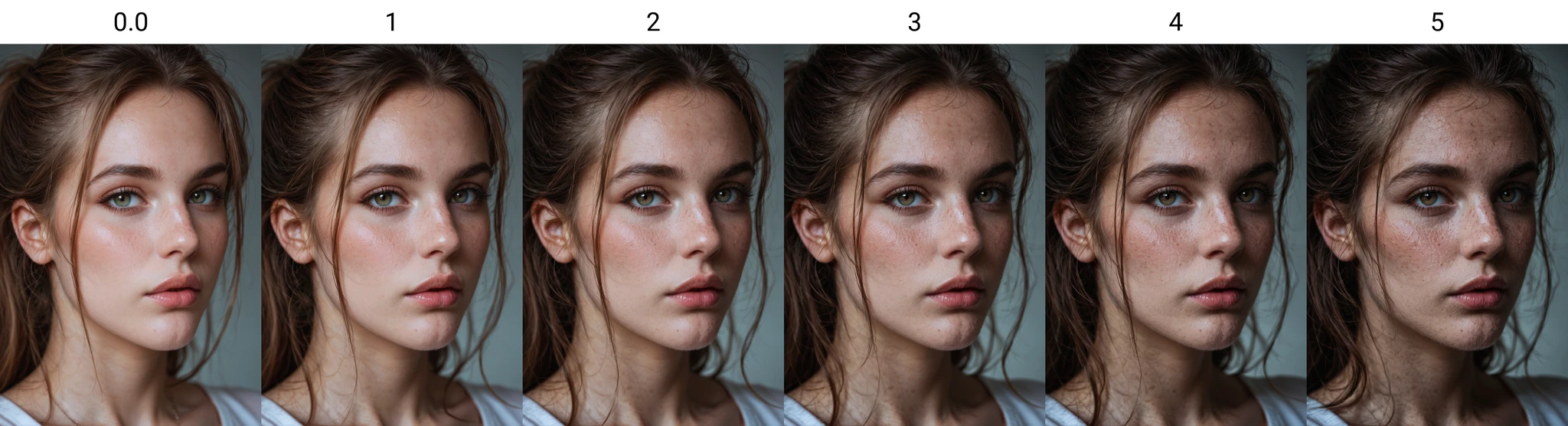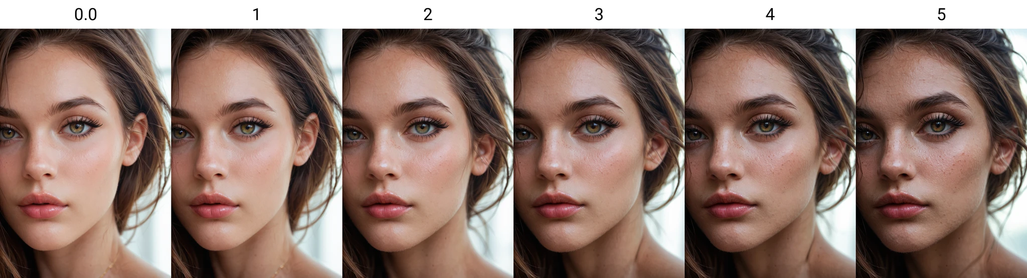 Real Skin Slider enhances images with photorealistic skin texture, subtle imperfections, and soft lighting. It refines details like pores and tones without altering the subject's structure, suitable for realism models and portraits. Use weights 2-3 for balanced results, increasing for more dramatic refinement.