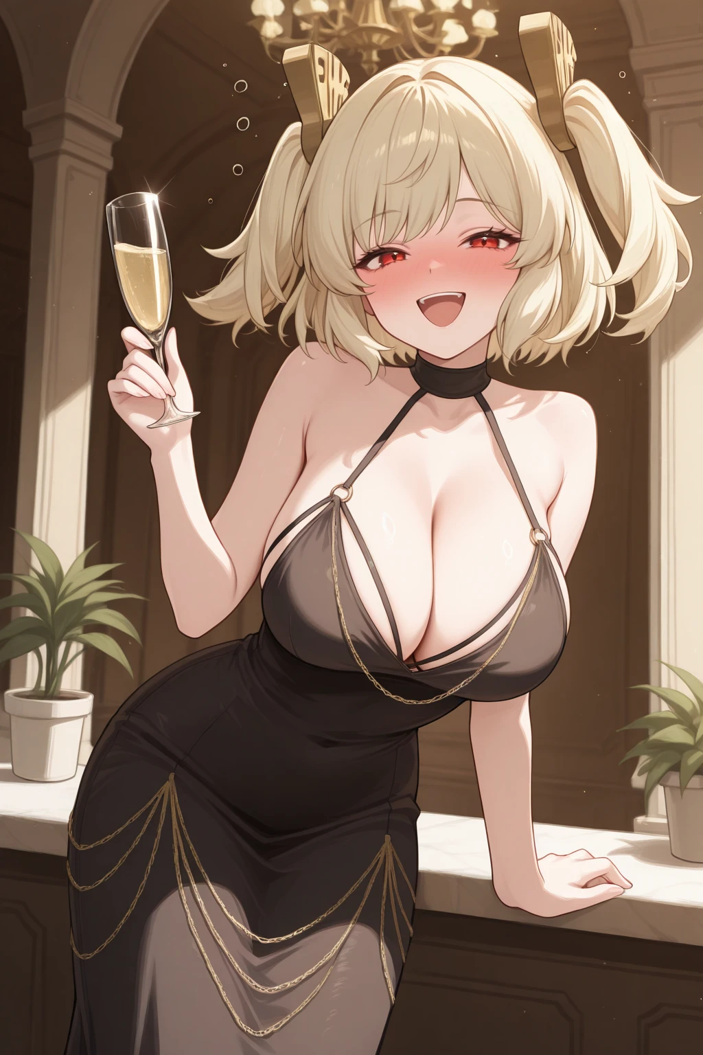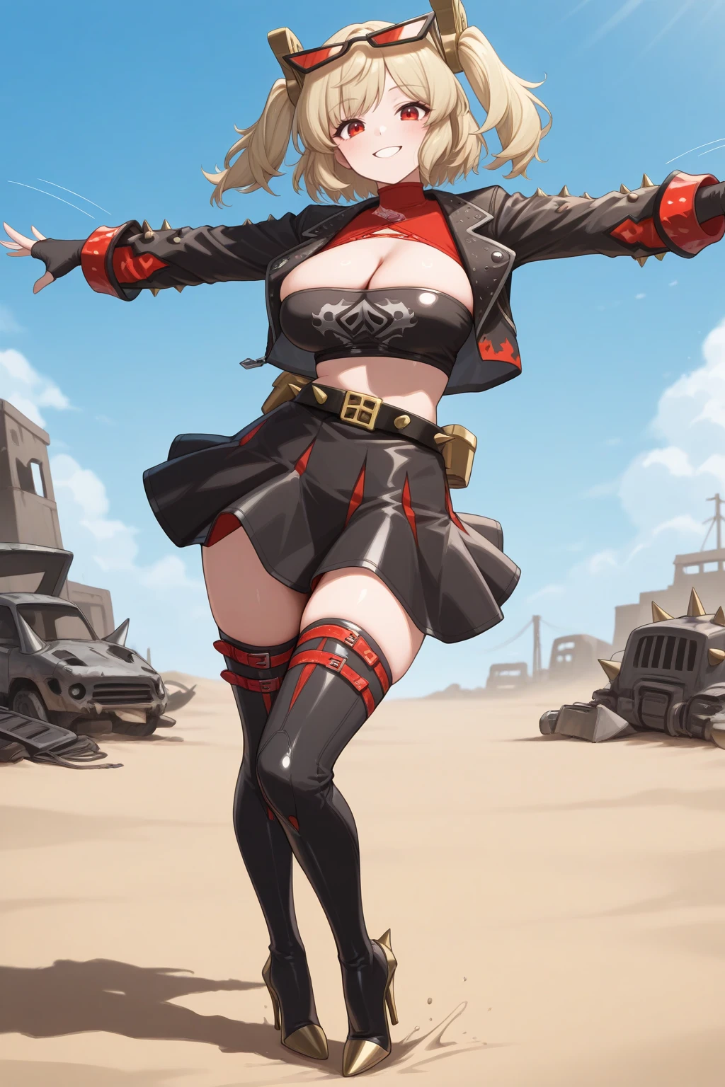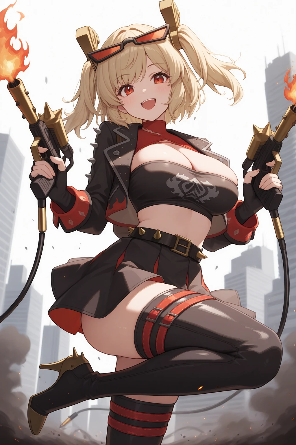 brncwht, red eyes, blonde hair, medium hair, two side up, hair ornament, large breastseyewear on head, sunglasses, black jacket, spiked jacket, leather jacket, cropped jacket, open jacket, red turtleneck, halterneck, two-tone tube top, black tube top, white tube top, cleavage, black belt, spiked belt, high-waist skirt, black miniskirt, pleated skirt, red thigh belt, black thigh boots, high heel boots, elbow gloves, fingerless gloves, black gloveseyewear on head, sunglasses, red turtleneck, halterneck, bare shoulders, two-tone tube top, black tube top, white tube top, cleavage, black belt, spiked belt, high-waist skirt, black miniskirt, pleated skirt, red thigh belt, black thigh boots, high heel boots, elbow gloves, fingerless gloves, black glovesdual wielding, holding flamethrowerCreated