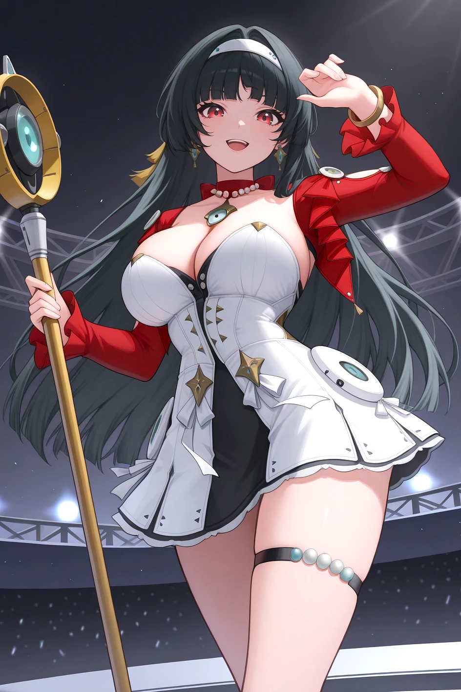 4str4, large breasts, red eyes, black hair, long hair, blunt bangs, hair intakes, white hairband, earrings, bead necklace, pendant, red bow choker, red shrug, collarbone, cleavage, frilled sleeves, long sleeves, two-tone dress, white dress, black dress, dress ribbon, star ornament, bracelet, thigh strap, holding staff