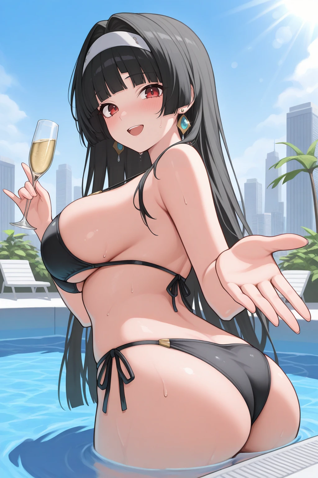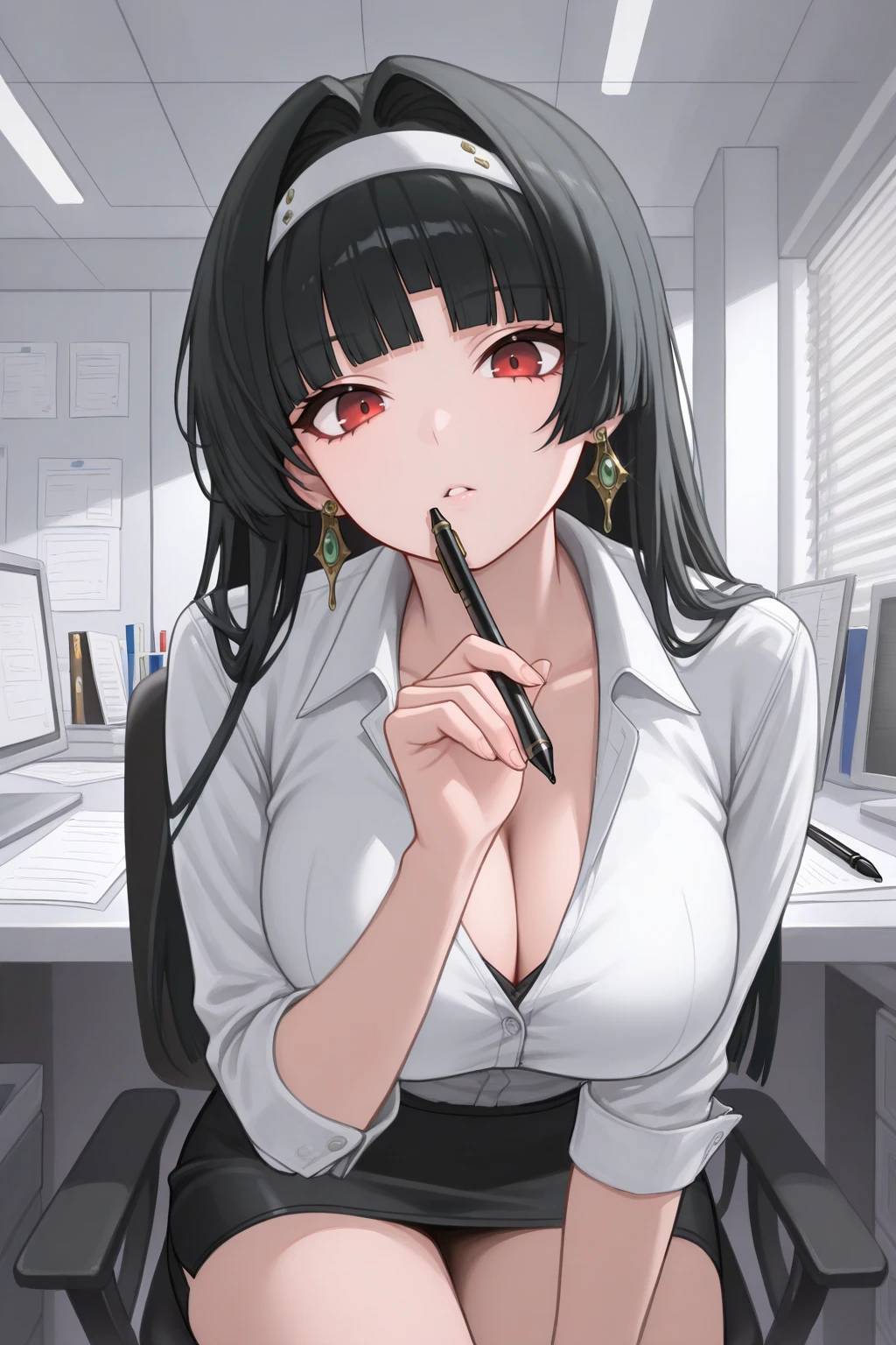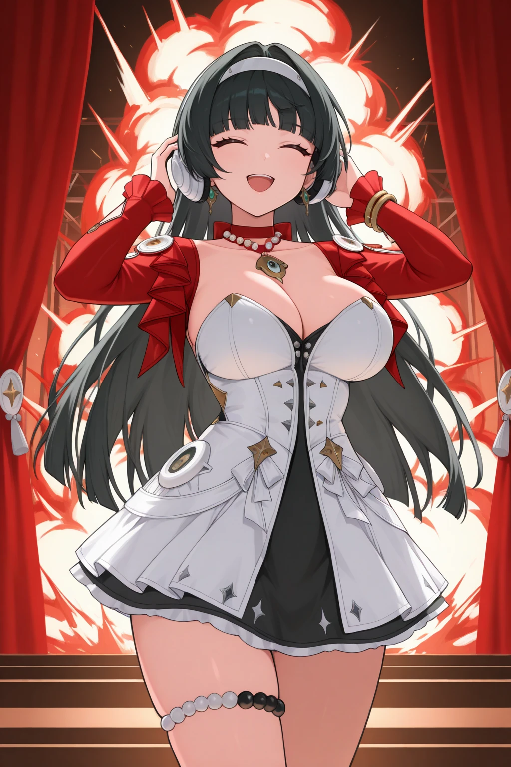 4str4, large breasts, red eyes, black hair, long hair, blunt bangs, hair intakes, white hairband, jewelry, earringsred bow choker, bead necklace, pendant, red shrug, collarbone, cleavage, frilled sleeves, long sleeves, two-tone dress, white dress, black dress, frilled dress, dress ribbon, star ornament, bracelet, thigh strapstaffPositive Prompt