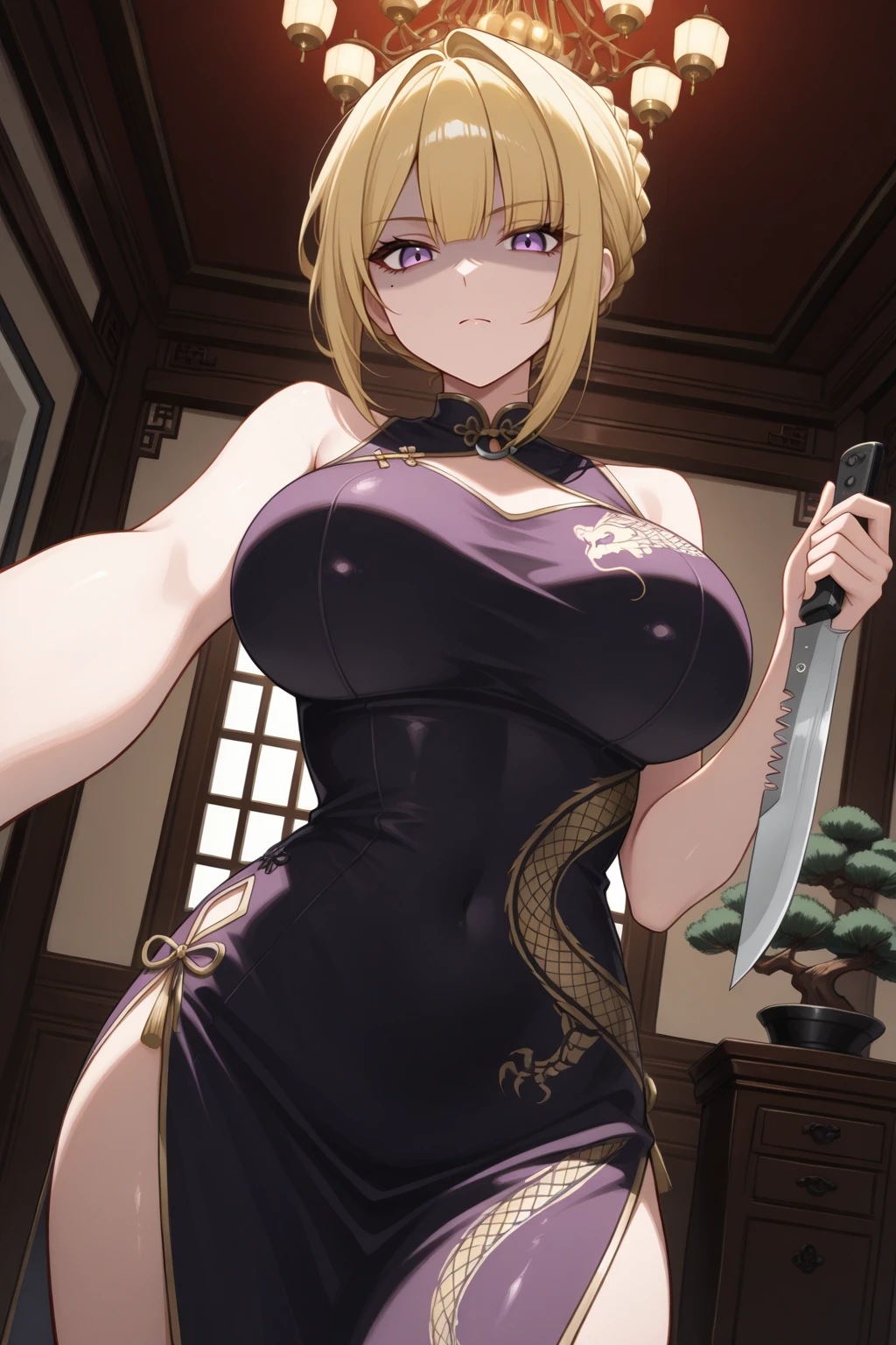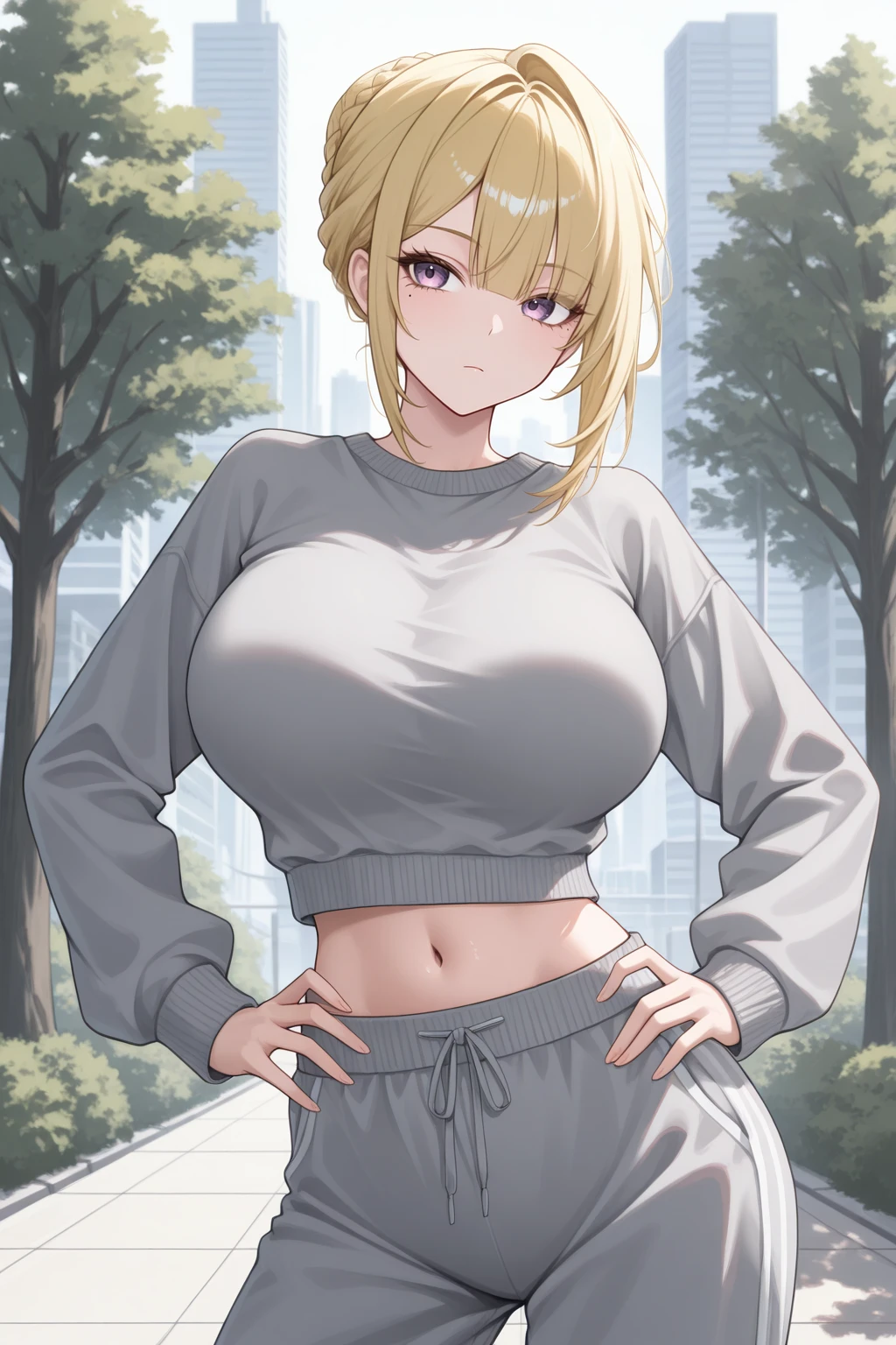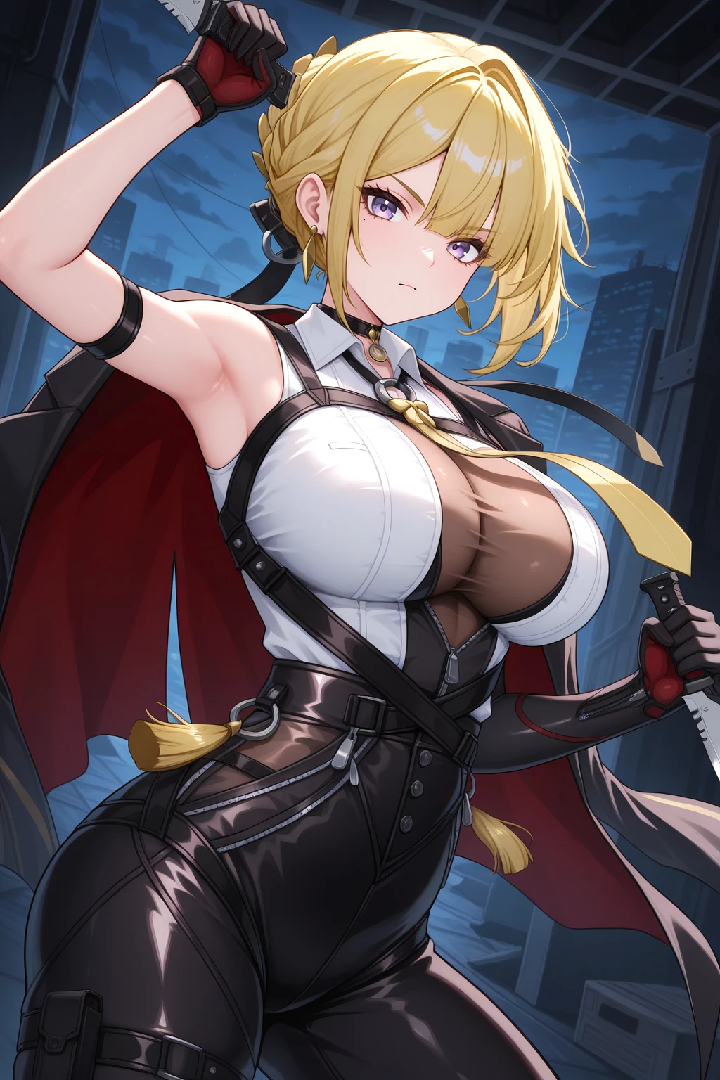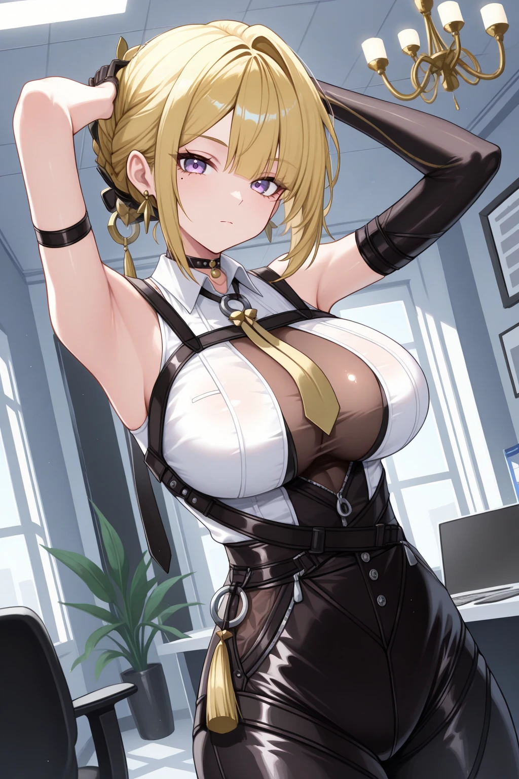 ch3v4l13r, large breasts, purple eyes, mole under eye, blonde hair, long hair, sidelocks, asymmetrical bangs, braided bun, earringsring hair ornament, hair ornament, hair ribbon, black ribbon, black choker, black jacket, jacket on shoulders, tight clothes, white collared shirt, sleeveless shirt, see-through cleavage, ring necklace, yellow necktie, chest harness, high-waist pants, black pants, harness, o-ring, tassel, zipper, arm strap, thigh strap, single glove, single elbow glove, black glovesring hair ornament, hair ornament, hair ribbon, black ribbon, black choker, tight clothes, white collared shirt, sleeveless shirt, see-through cleavage, ring necklace, yellow necktie, chest harness, high-waist pants, black pants, harness, o-ring, tassel, zipper, arm strap, thigh strap, single glove, single elbow glove, black glovesCreated