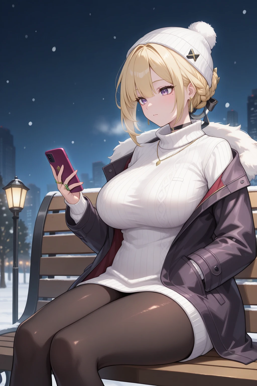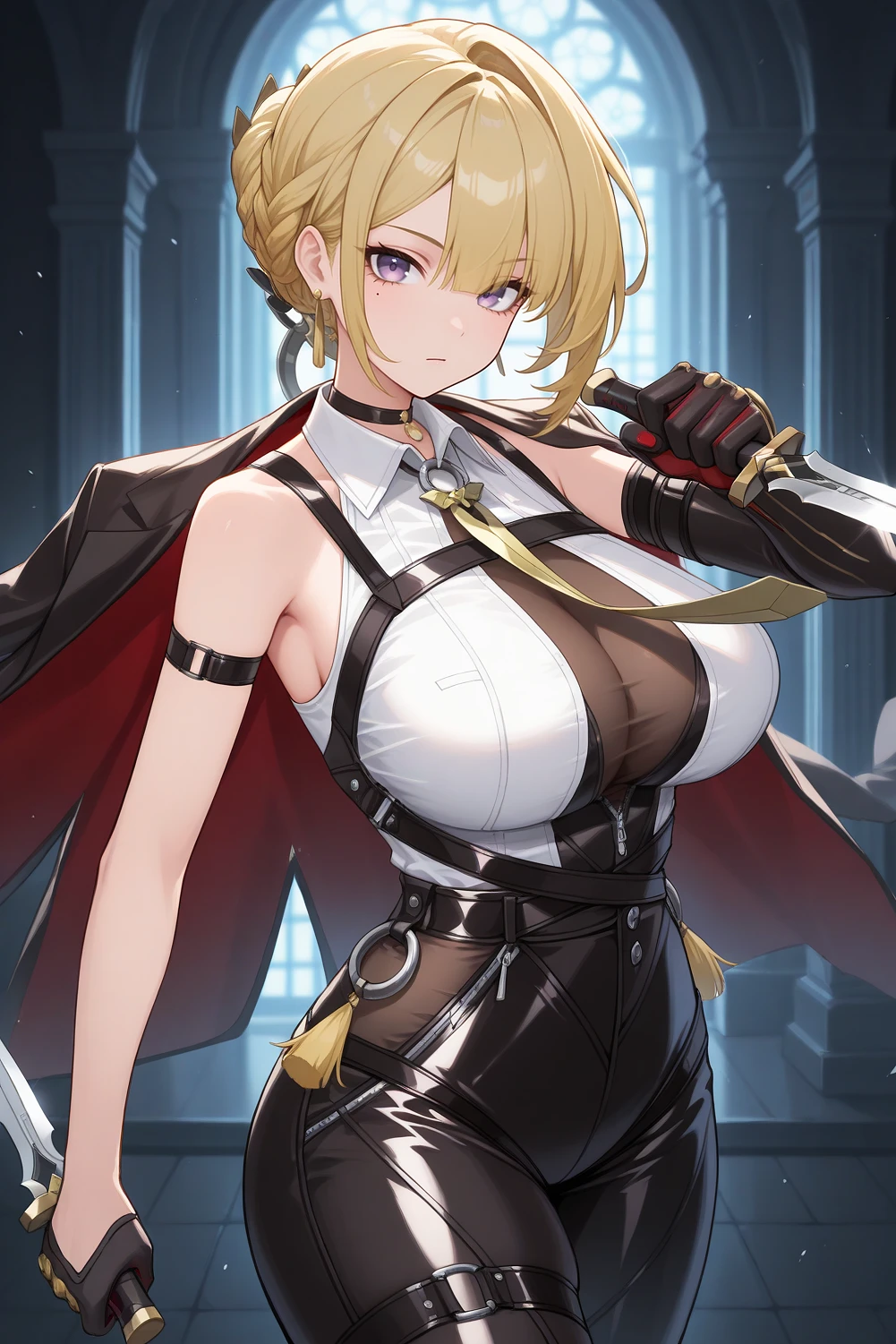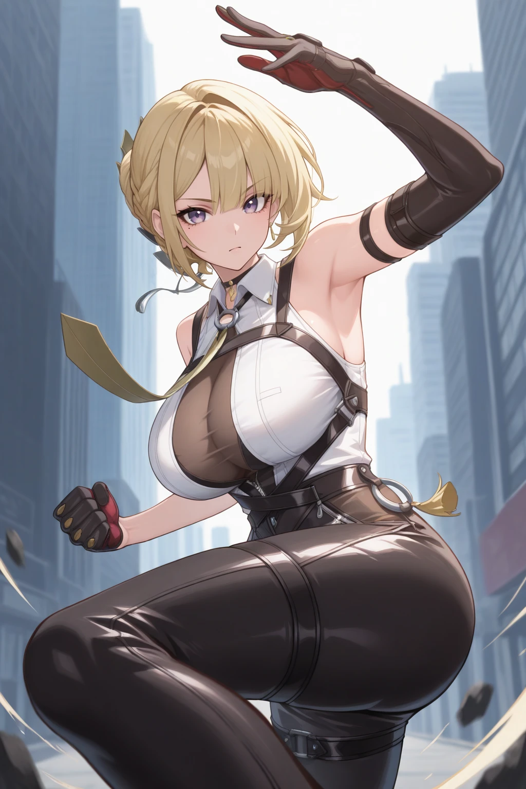 ch3v4l13r, large breasts, purple eyes, mole under eye, blonde hair, short hair, sidelocks, bun with braided base, ring hair ornament, hair ornament, black ribbon, earringsblack jacket, jacket on shoulders, tight clothes, white collared shirt, sleeveless shirt, see-through cleavage, ring necklace, yellow necktie, chest harness, high-waist pants, black pants, harness, o-ring, tassel zipper, arm strap, thigh strap, single glove, single elbow glove, black glovestight clothes, white collared shirt, sleeveless shirt, see-through cleavage, ring necklace, yellow necktie, chest harness, high-waist pants, black pants, harness, o-ring, tassel zipper, arm strap, thigh strap, single glove, single elbow glove, black glovesCreated