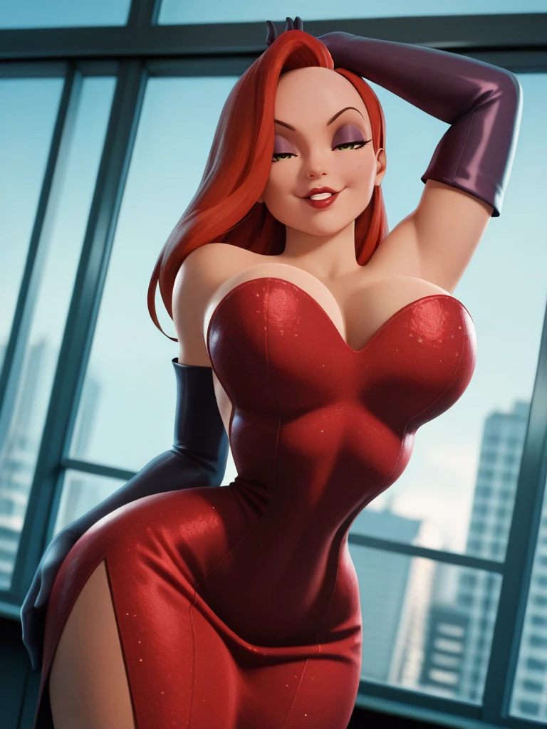 JessicaRabbitXLP,,long hair, green eyes, red hair, parted lips, lipstick,,red dress, strapless, elbow gloves, large breasts, narrow waist, wide hips,,Positive Prompt