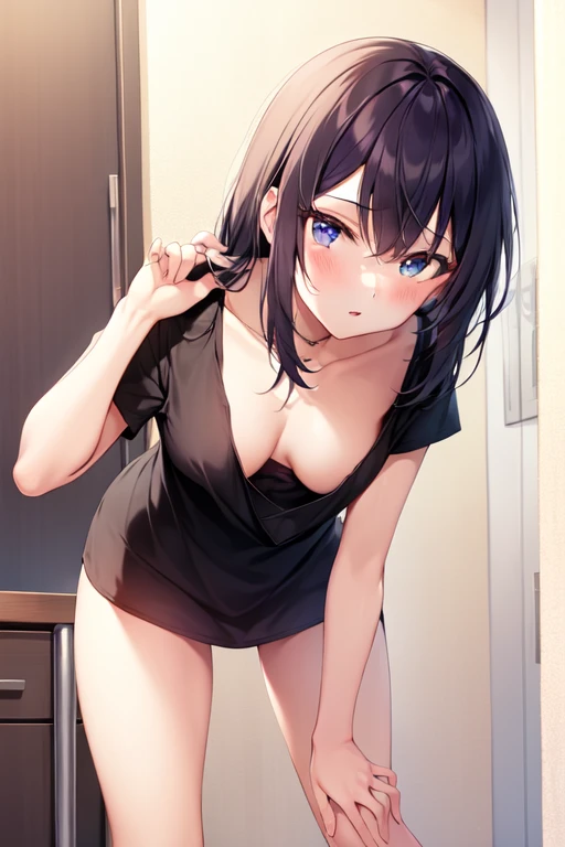 downblouse, loose t-shirt, leaning forward, nip slip, extended_downblouse, all fours, t-shirt, visible nipple, NSFW