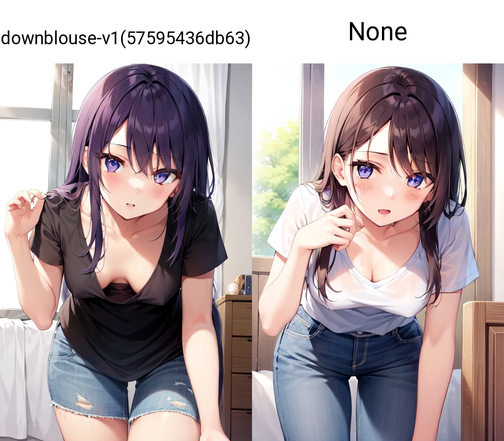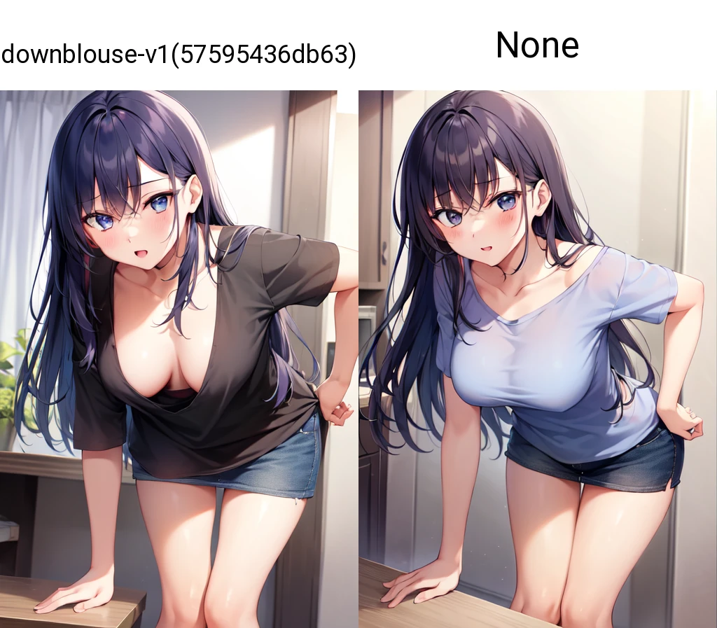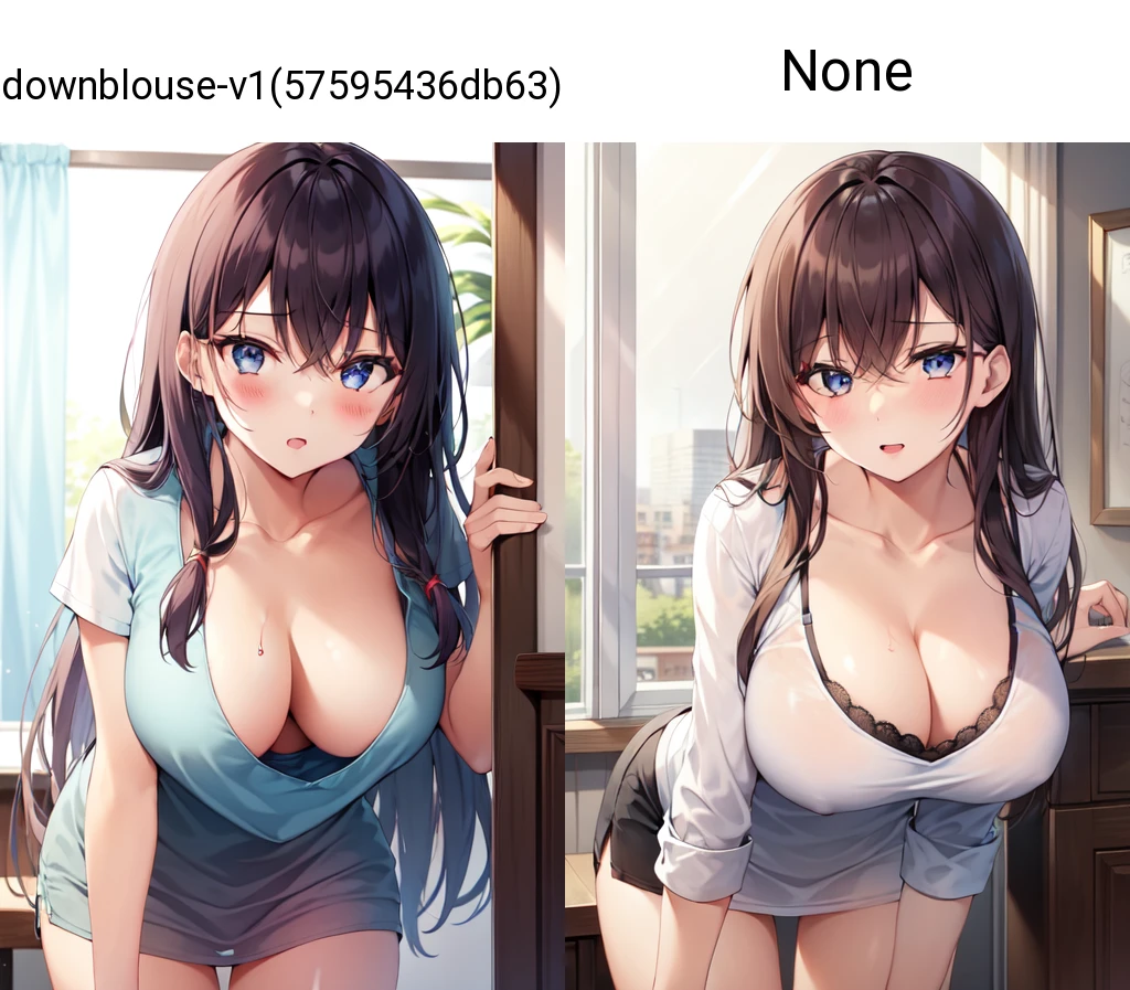 This LoRA model generates images of downblouse views, including extended downblouse perspectives. It was trained on images of people leaning forward and includes keywords like nip slip, visible nipple, and NSFW for prompting.
