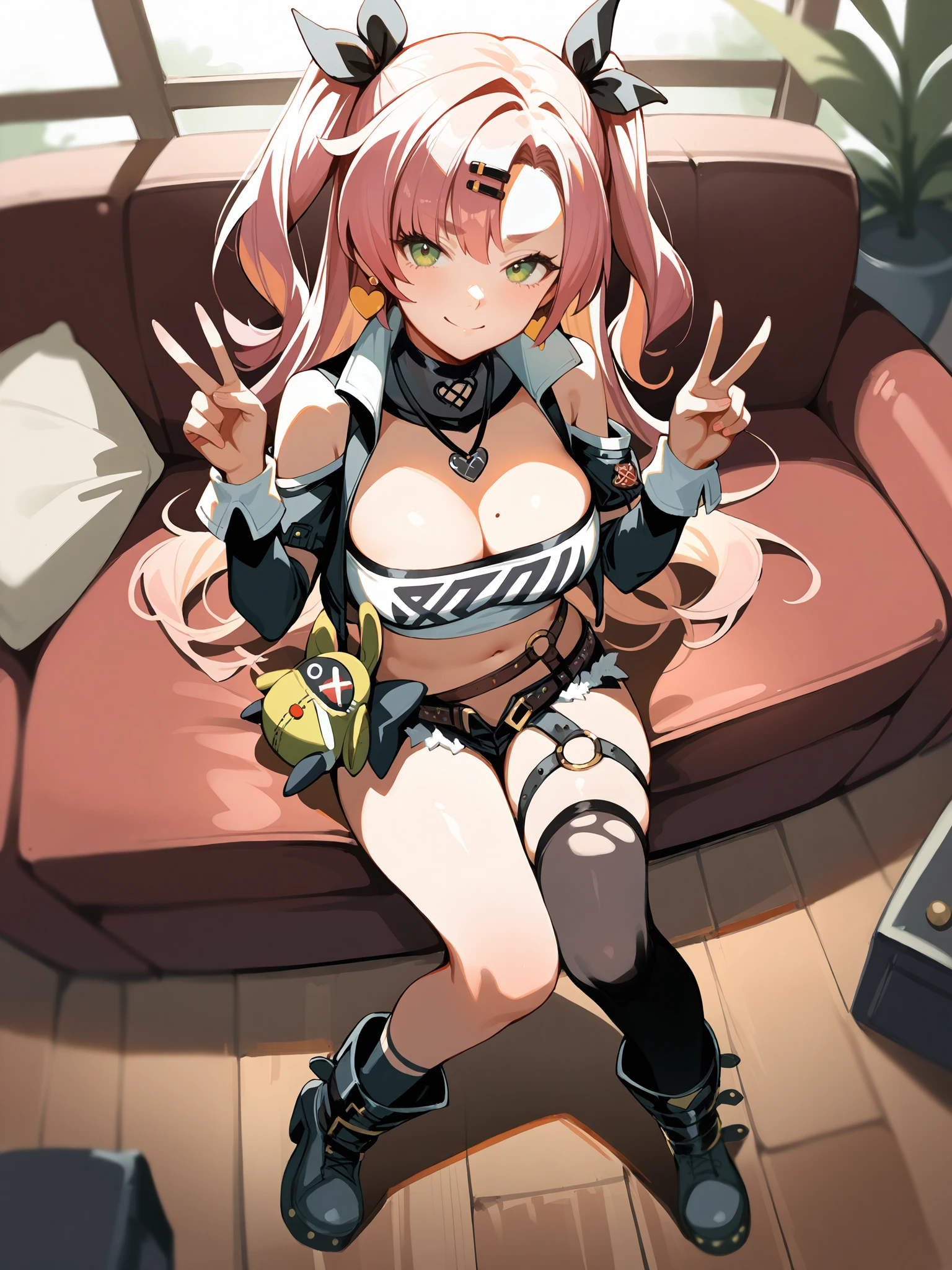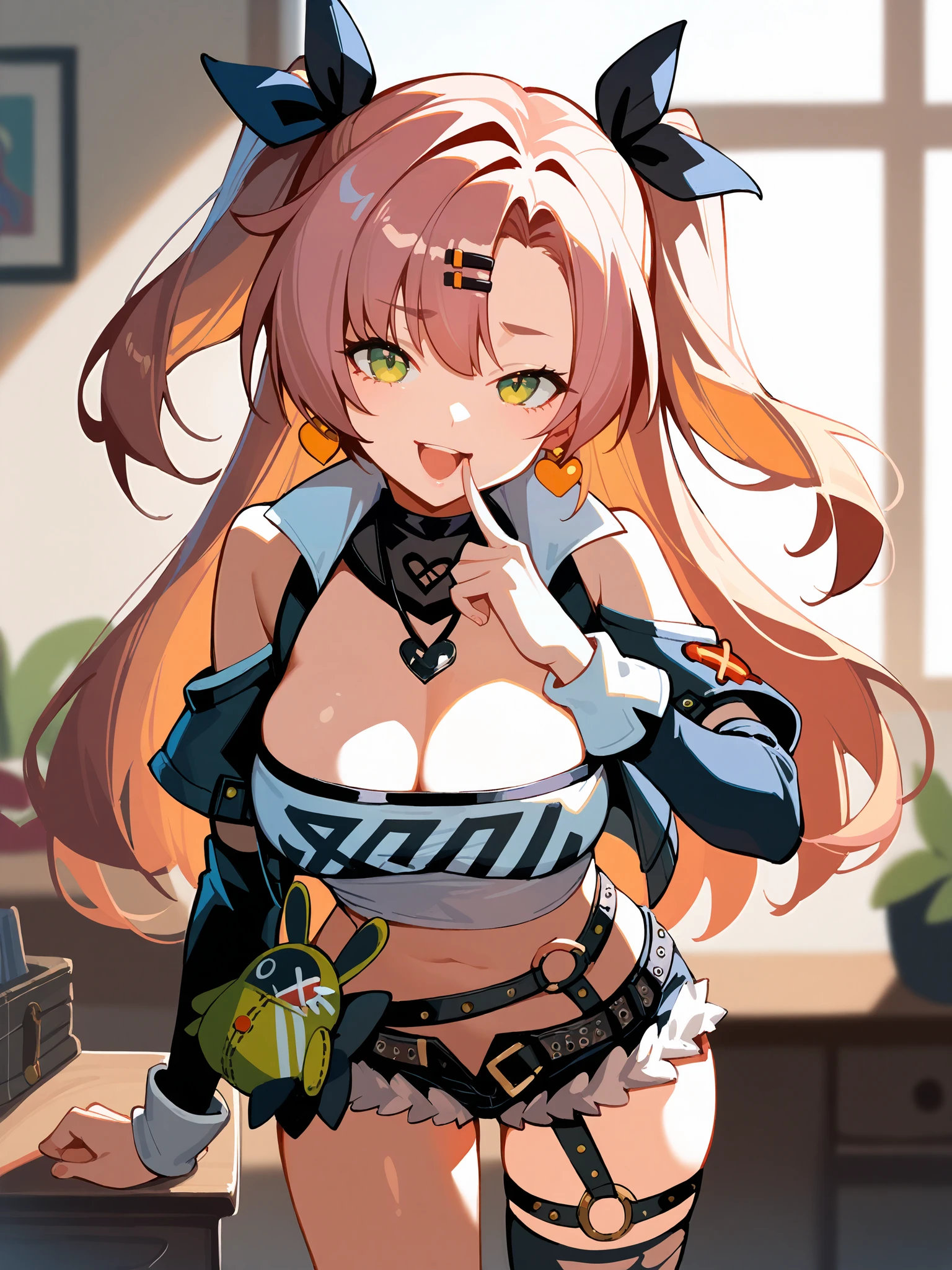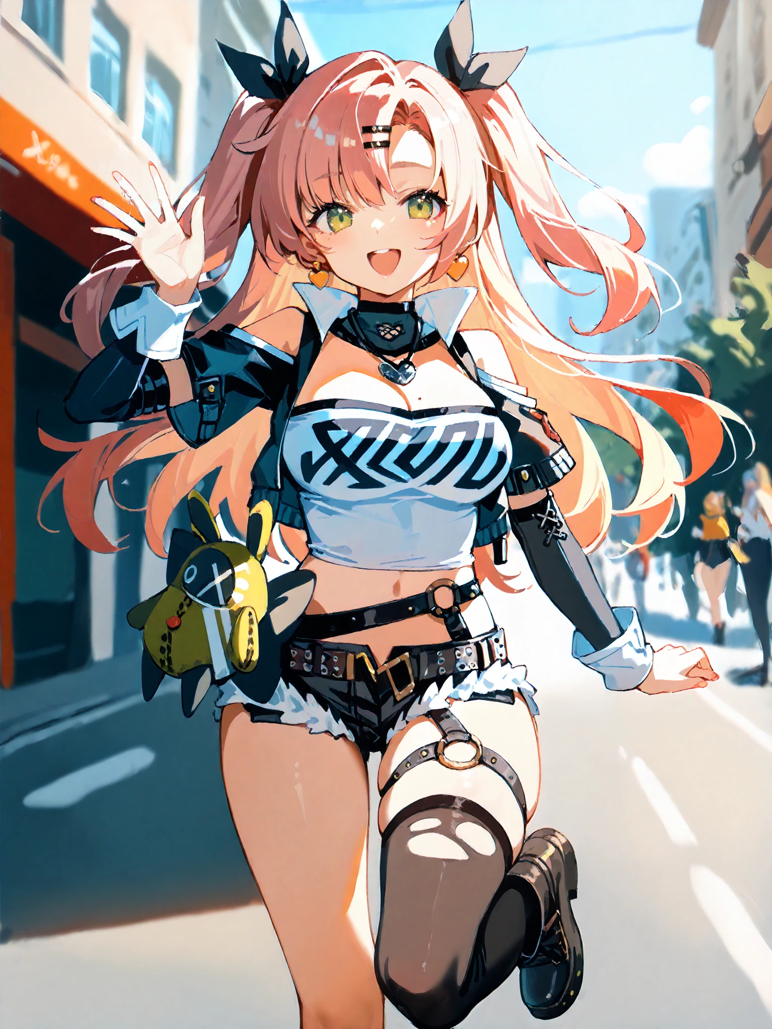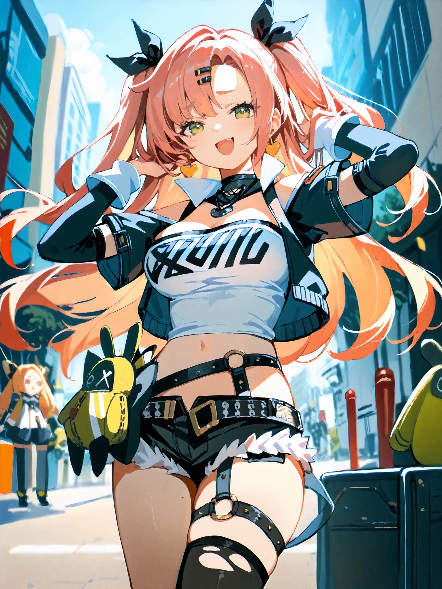 nicole demaratube top, single thighhigh, short shorts, cropped jacket, belt boots, hair ribbon, hairclip, two side up, earrings, single sock, high belt, thigh strap, detached sleeves, doll, black collarCreated
