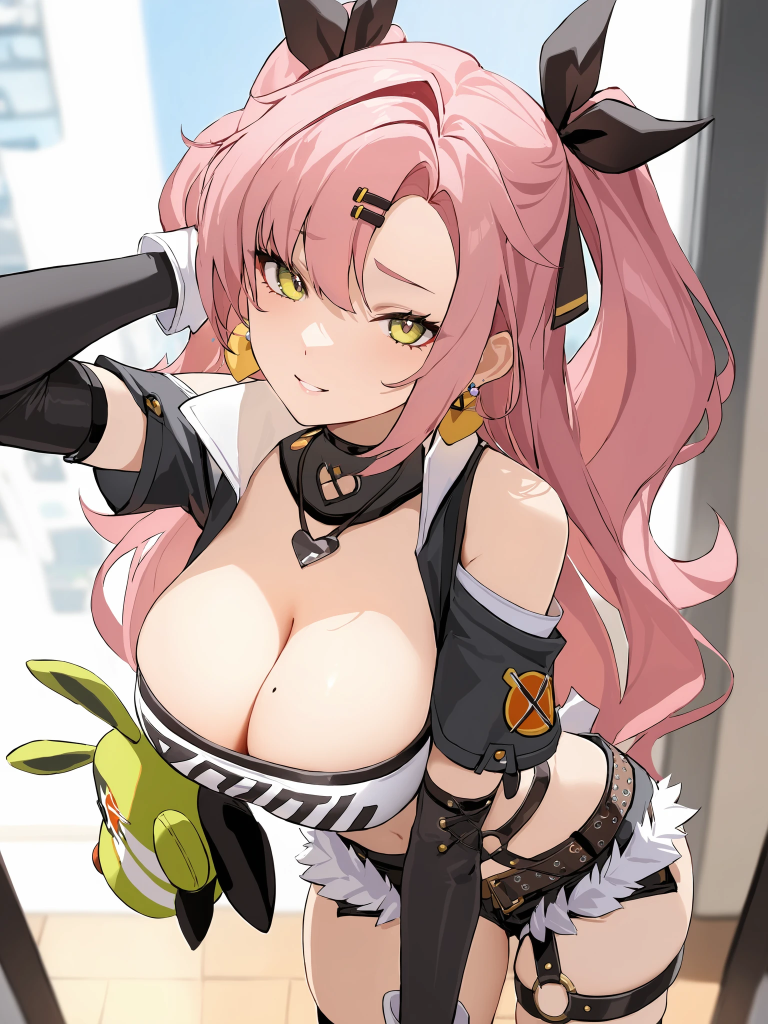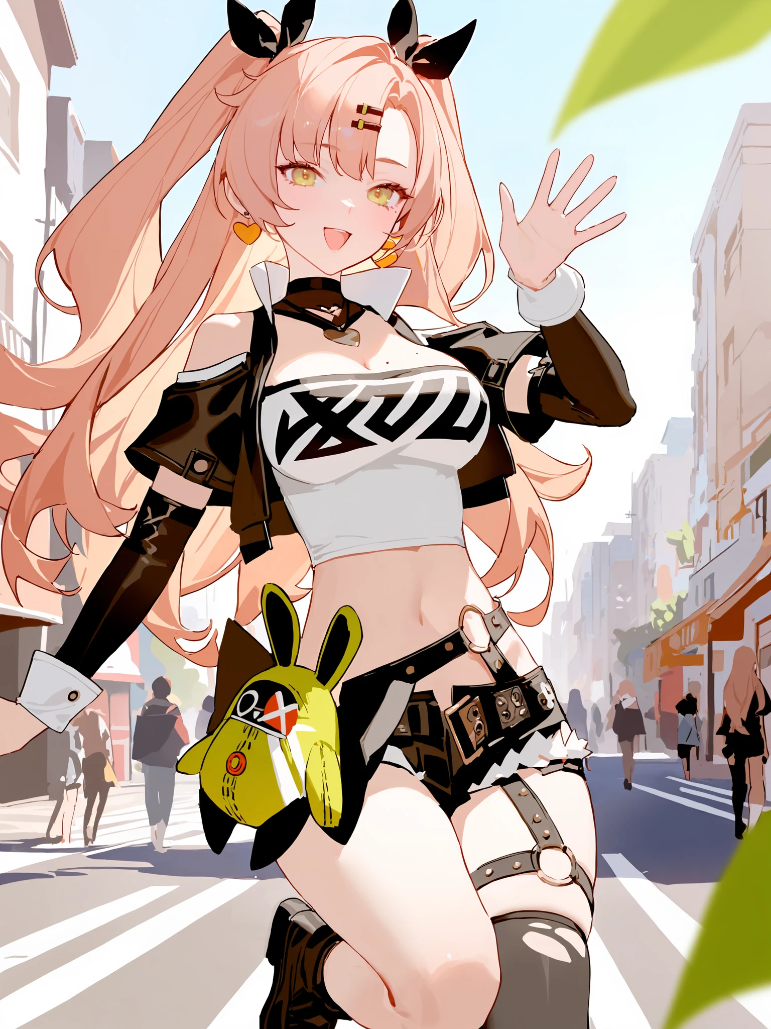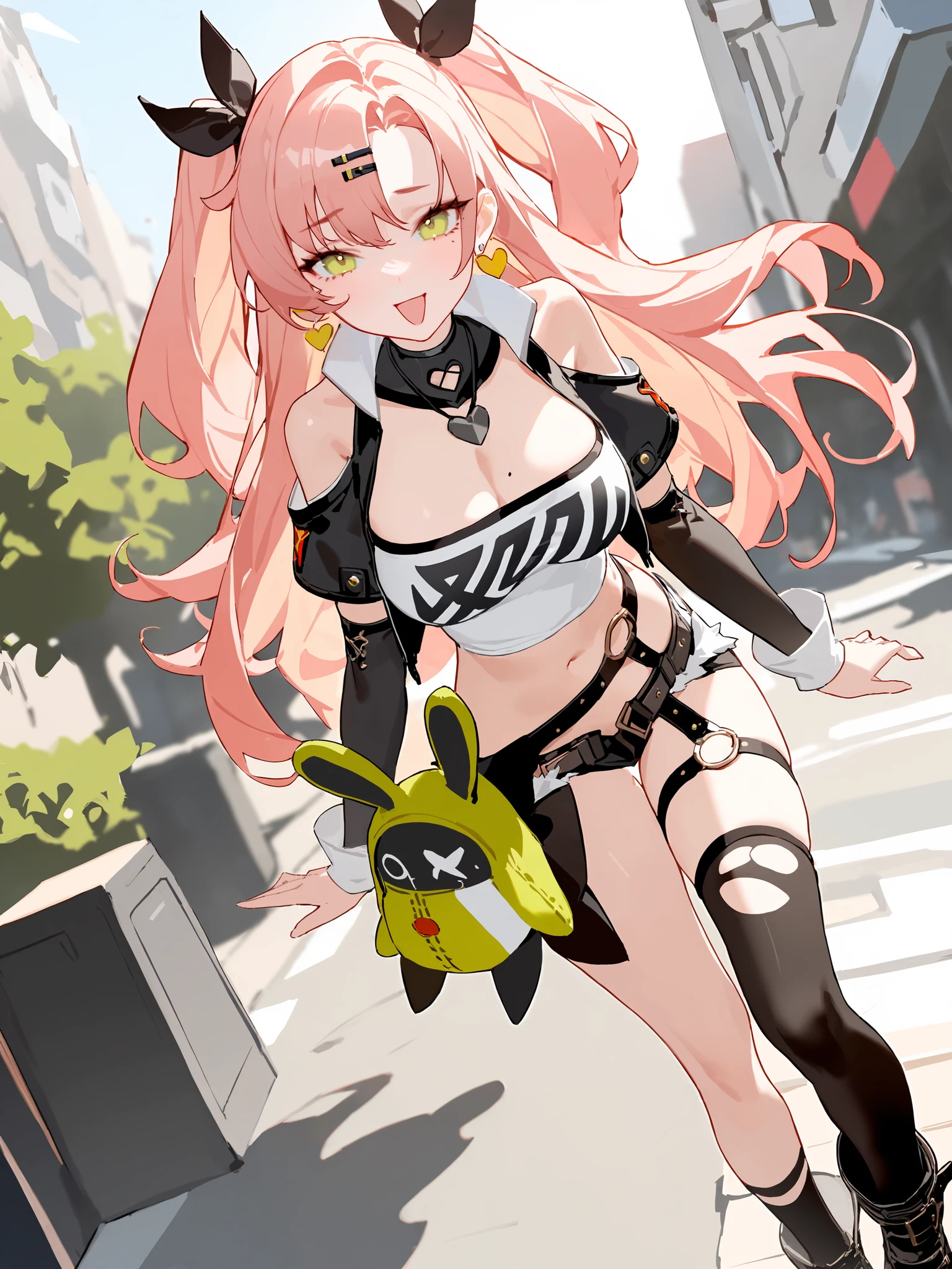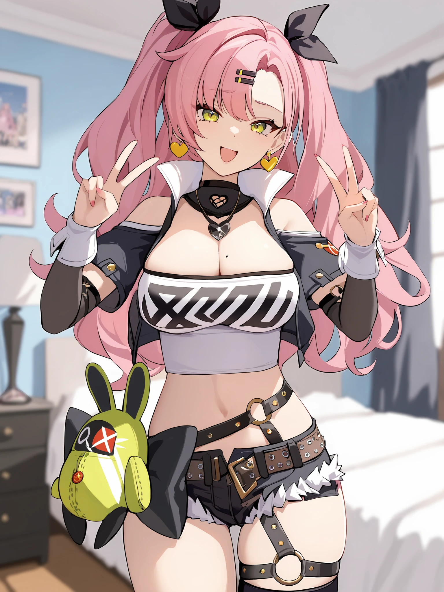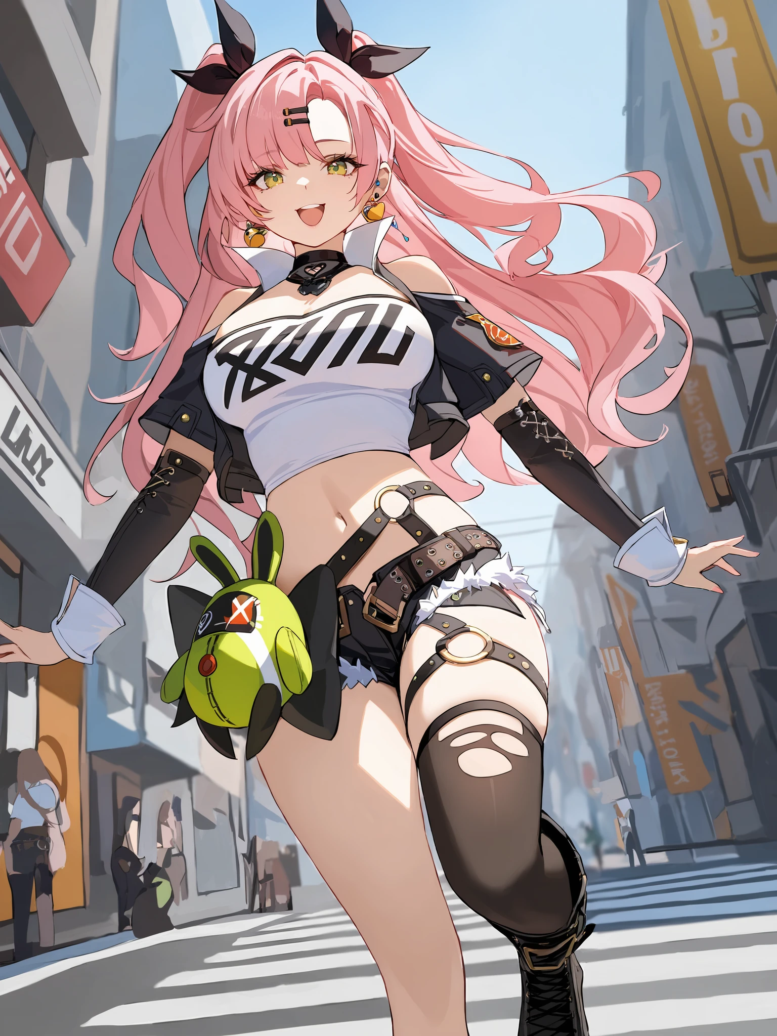nicole demaratube top, single thighhigh, short shorts, cropped jacket, belt boots, hair ribbon, hairclip, two side up, earrings, single sock, high belt, thigh strap, detached sleeves, doll, black collarCreated