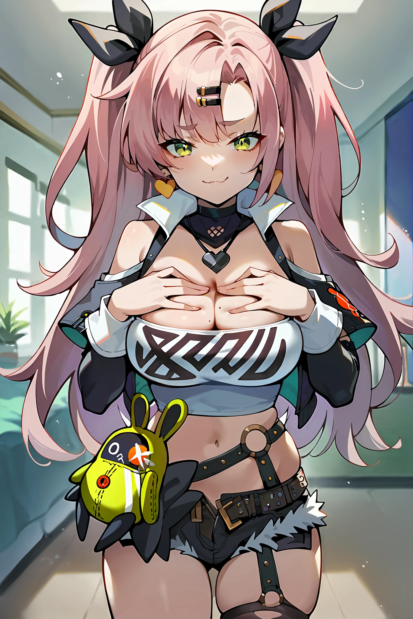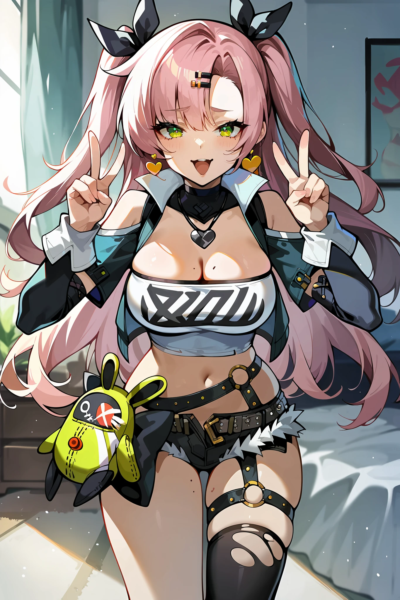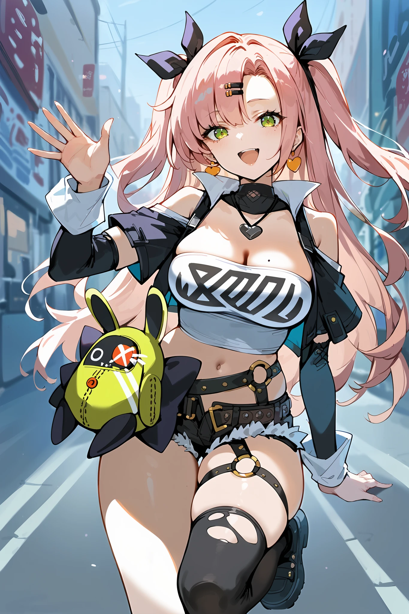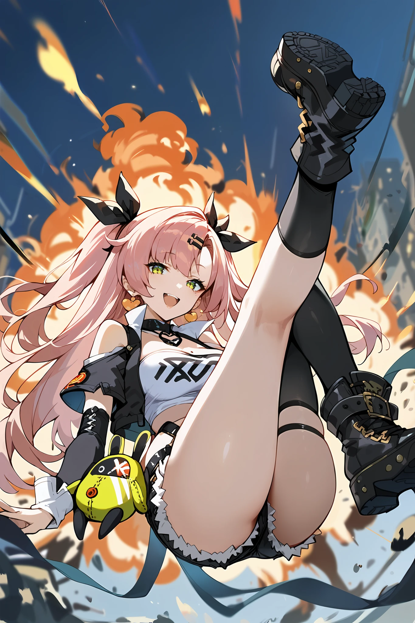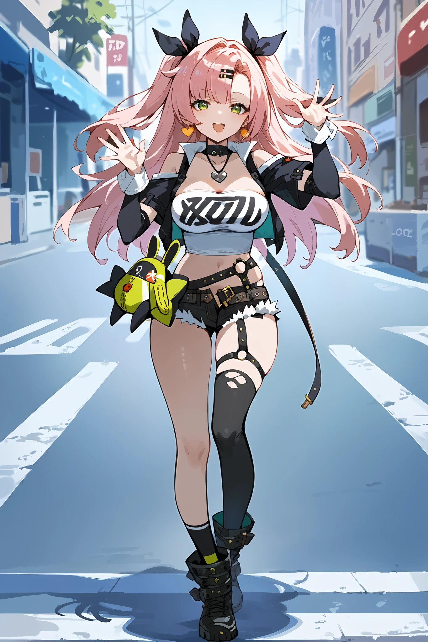 nicole demaratube top, single thighhigh, short shorts, cropped jacket, belt boots, hair ribbon, hairclip, earrings, single sock, high belt, thigh strap, detached sleeves, doll, black collarCreated