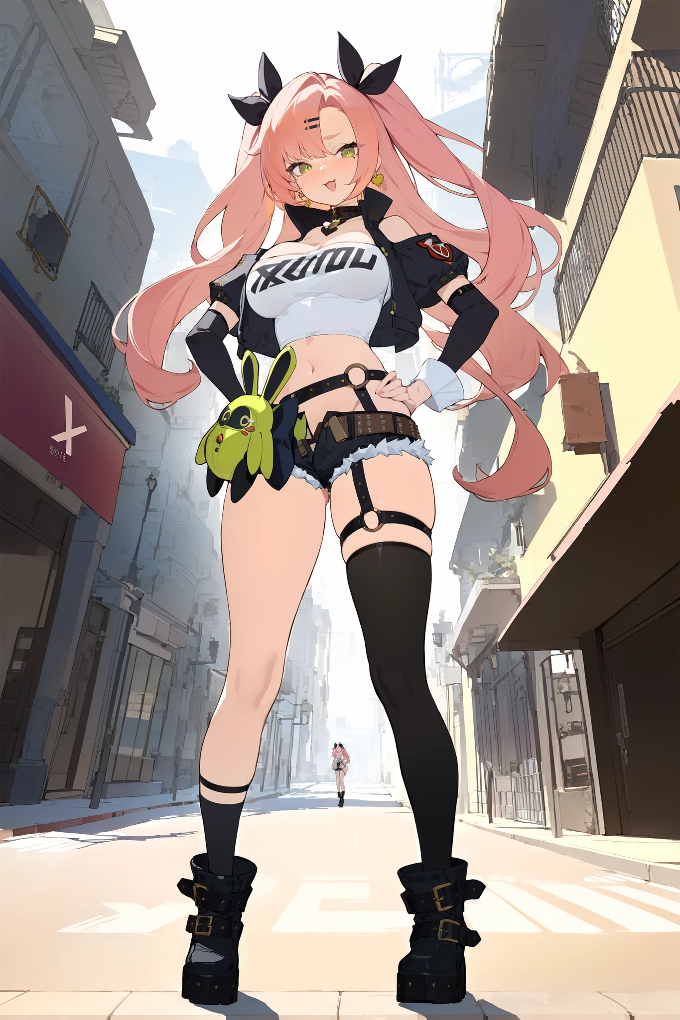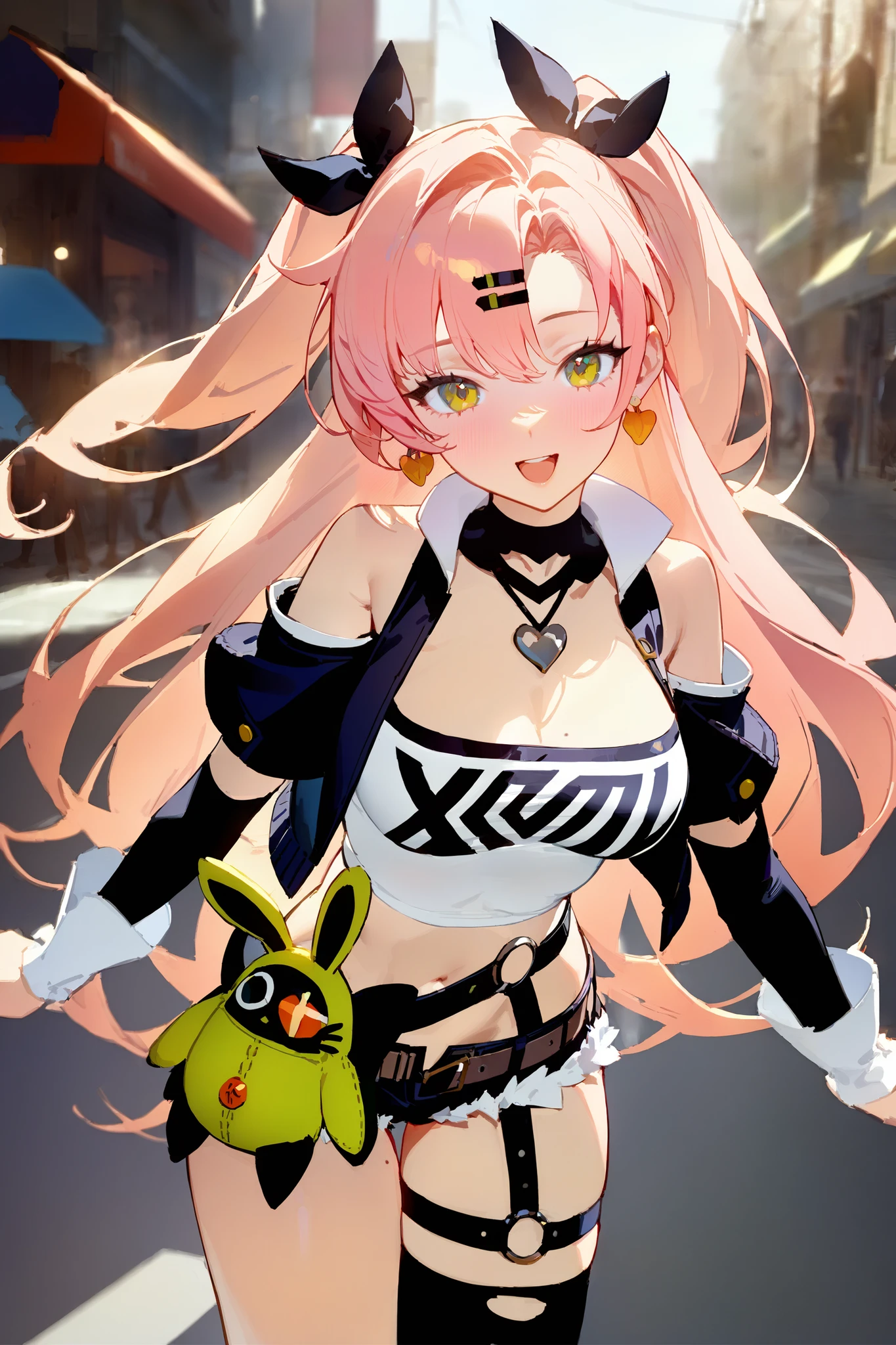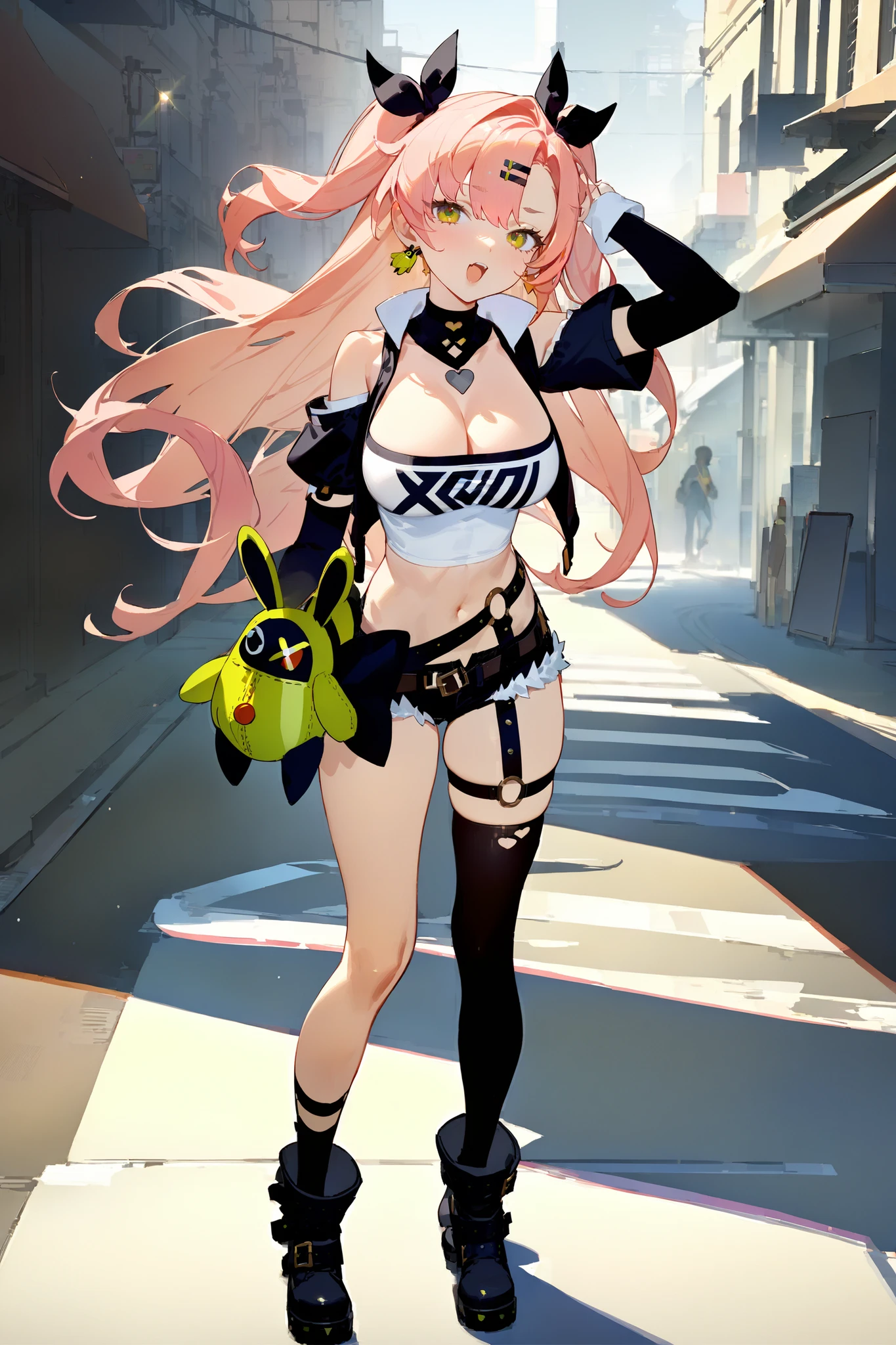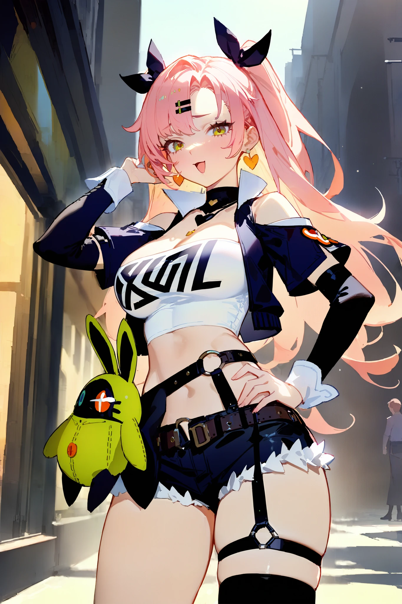 nicole demaratube top, single thighhigh, short shorts, cropped jacket, belt boots, hair ribbon, hairclip, earrings, single sock, high belt, thigh strap, detached sleeves, doll, black collarCreated