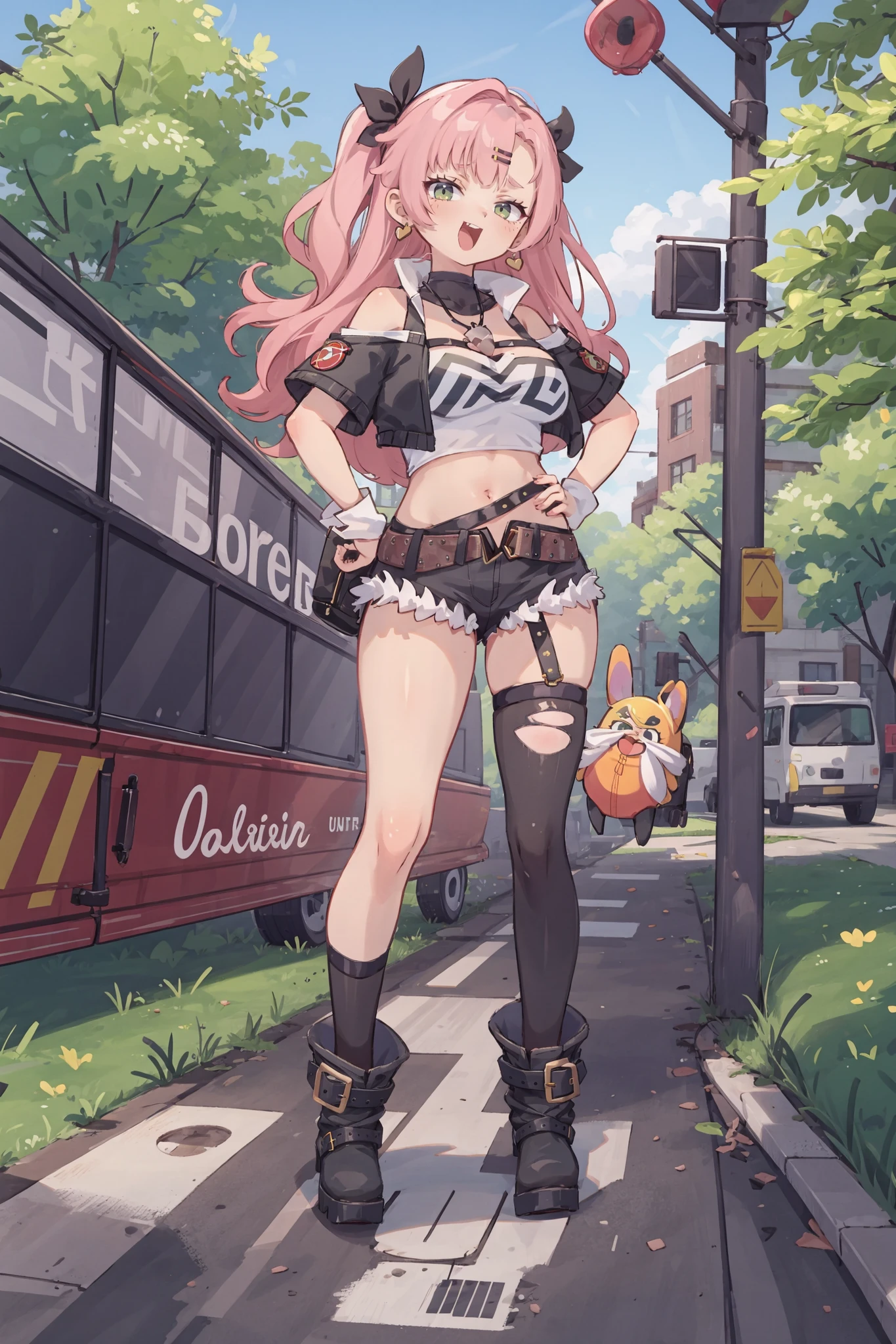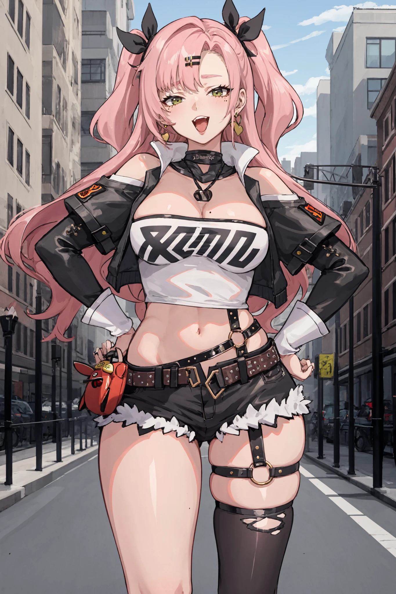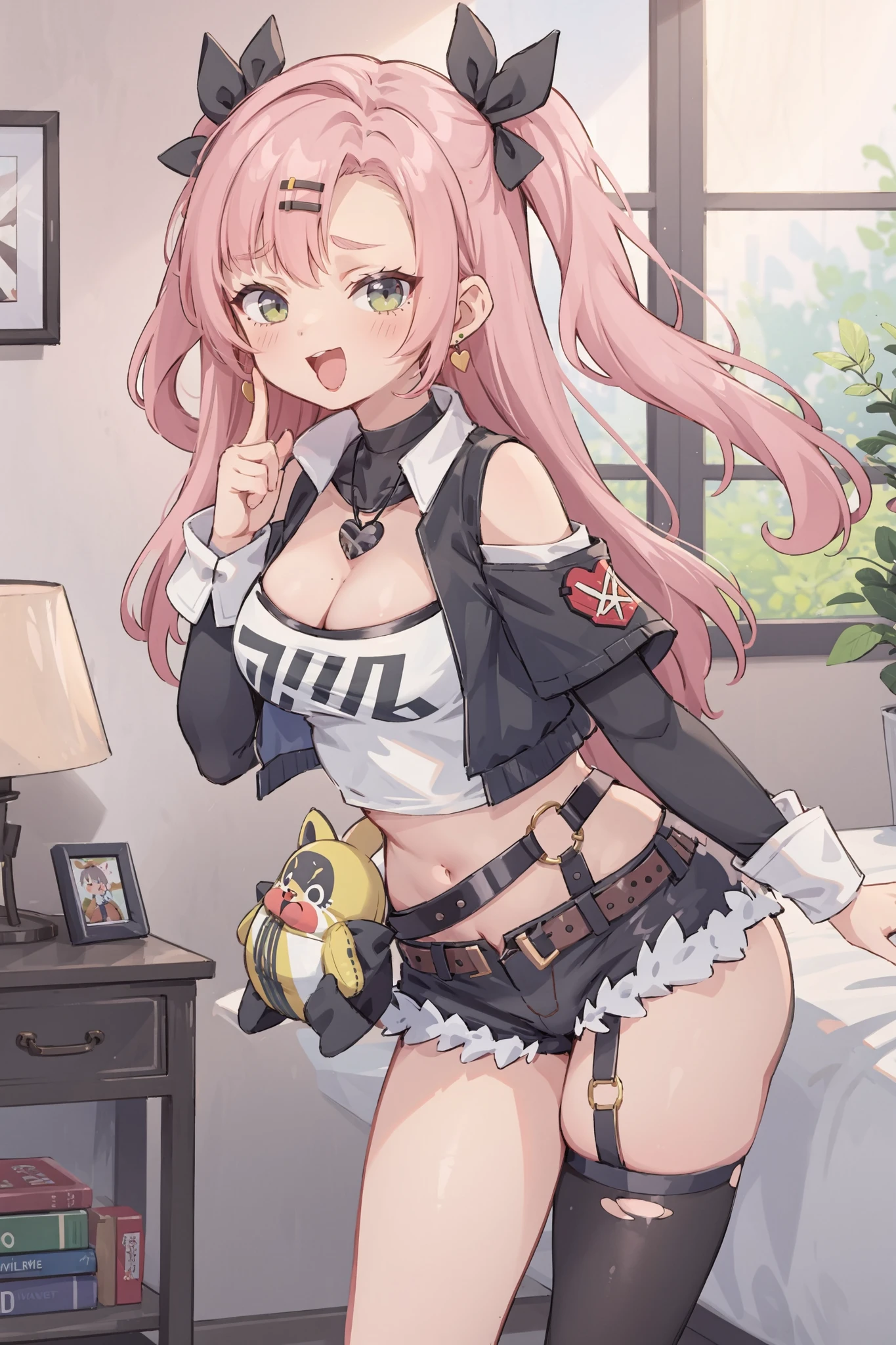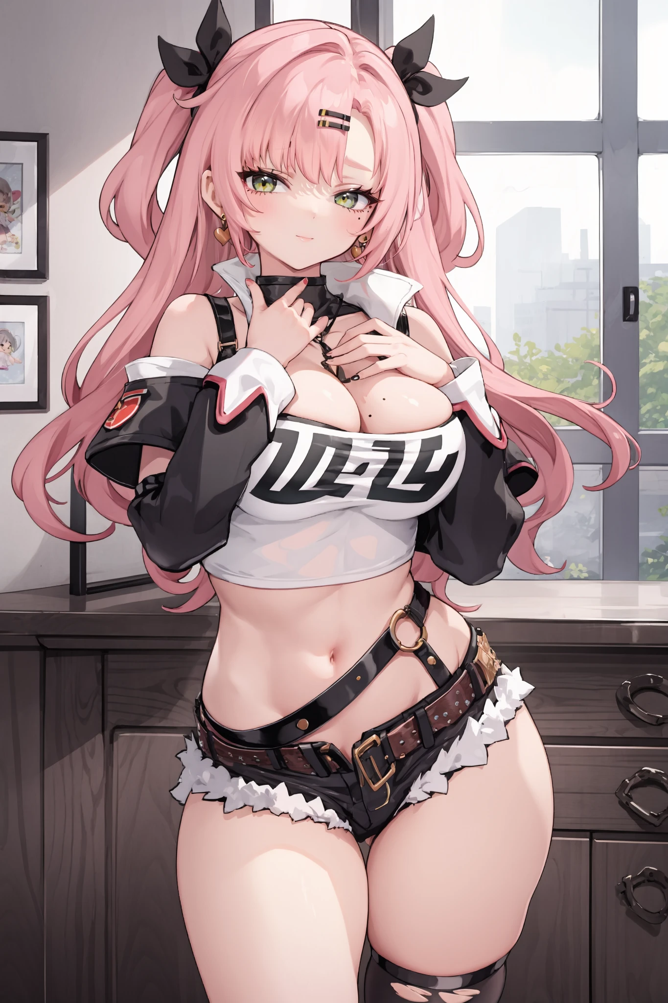 nicole demarahair ribbon, hairclip, earrings, black collar, tube top, single thighhigh, short shorts, cropped jacket, belt boots, single sock, belt, thigh strap, detached sleeves, dollCreated
